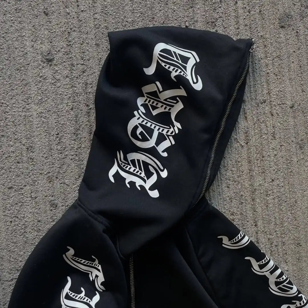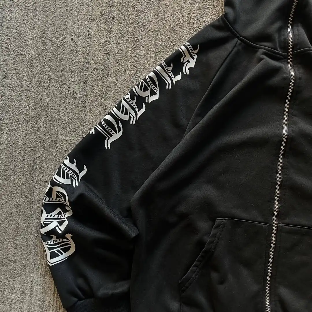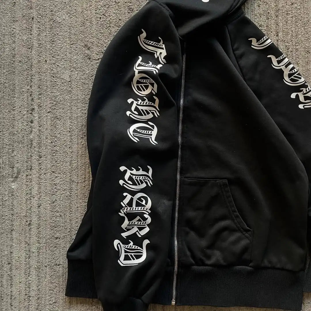 Side Gothic Art Striped Letter Print Hoodie Full Cardigan Black Fall Sweatshirt Men's Personality Creative Versatile Streetwear