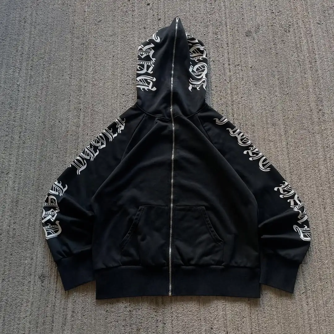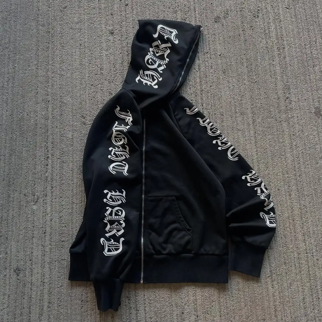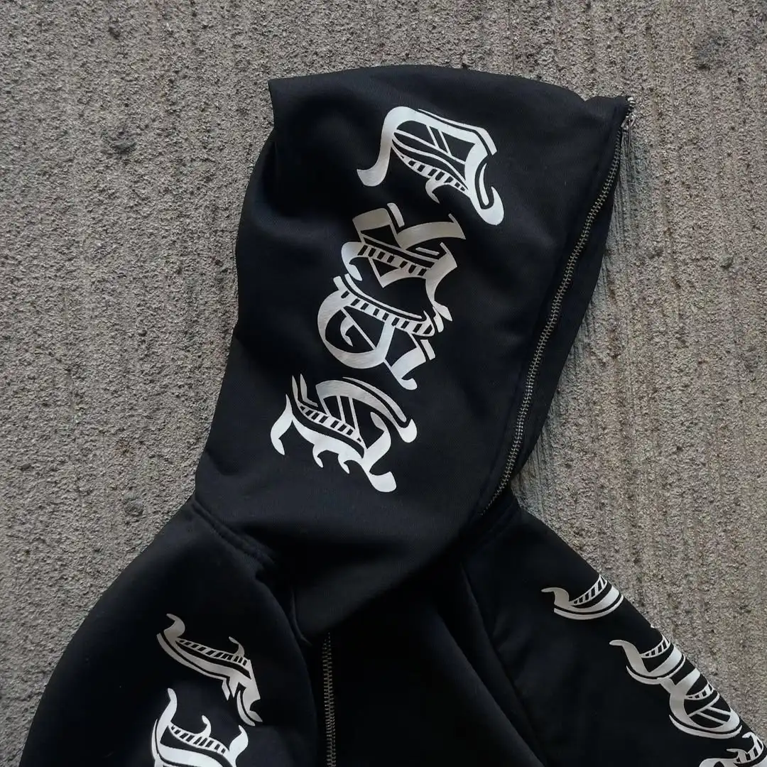Side Gothic Art Striped Letter Print Hoodie Full Cardigan Black Fall Sweatshirt Men's Personality Creative Versatile Streetwear