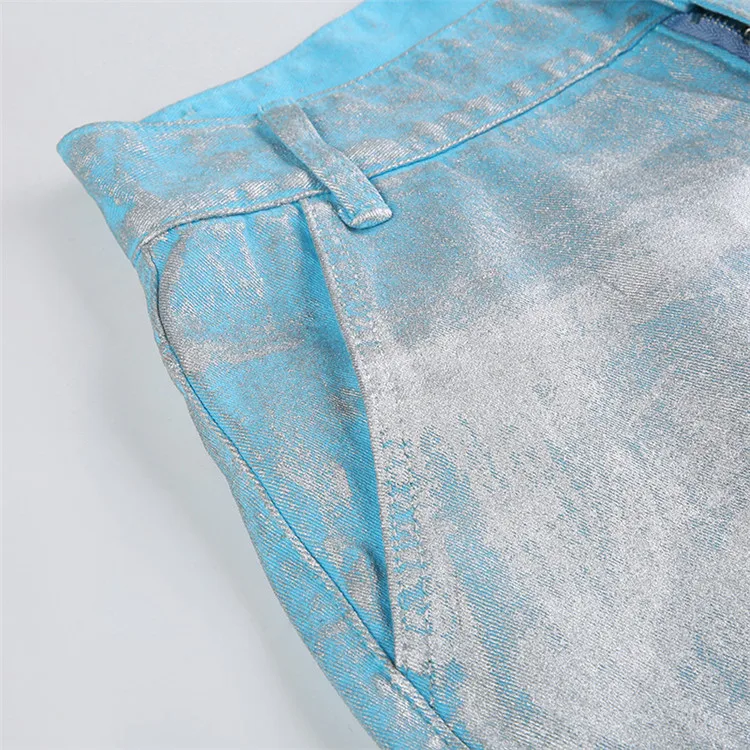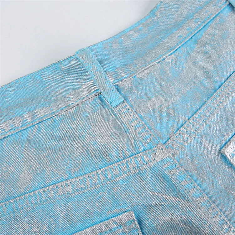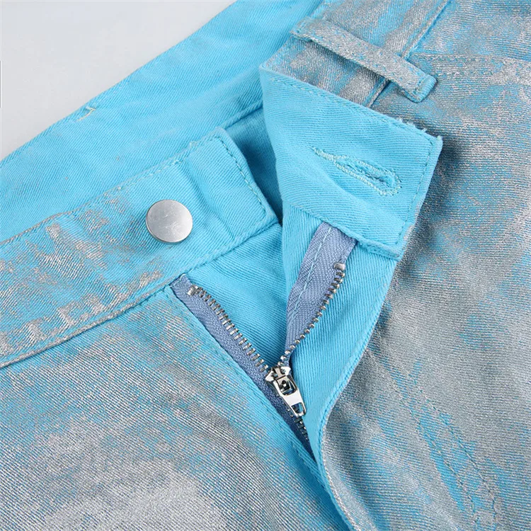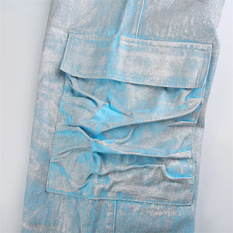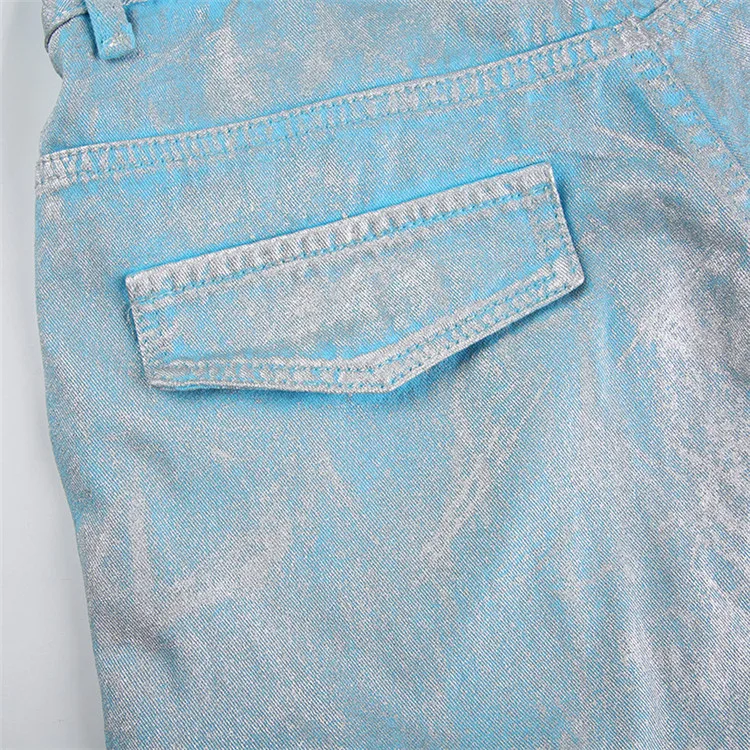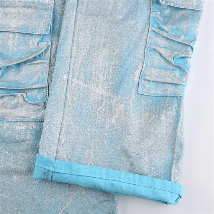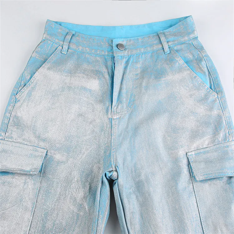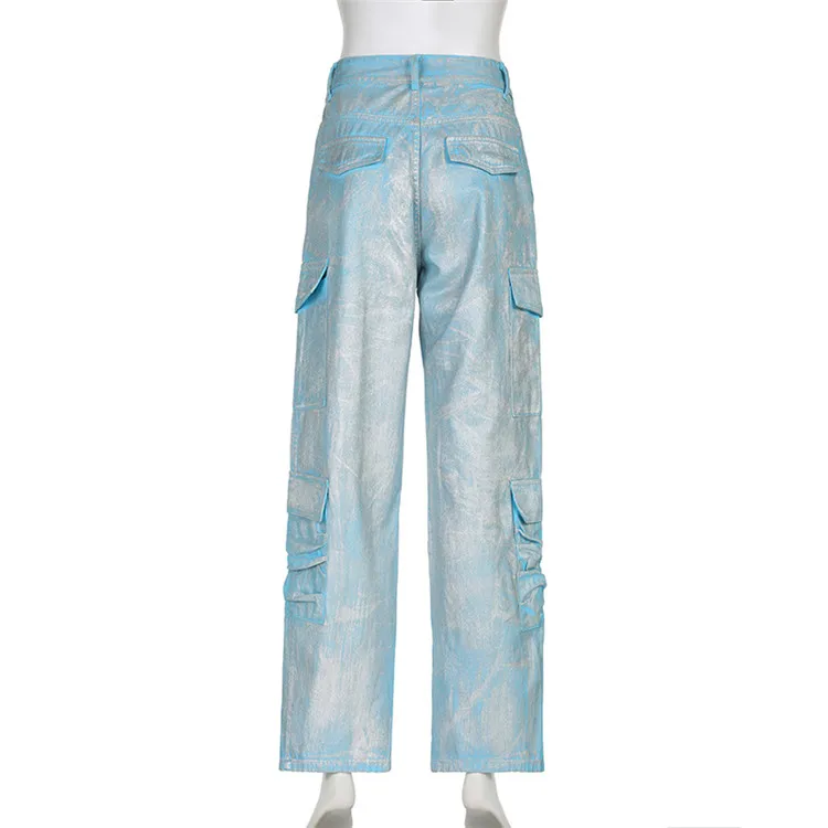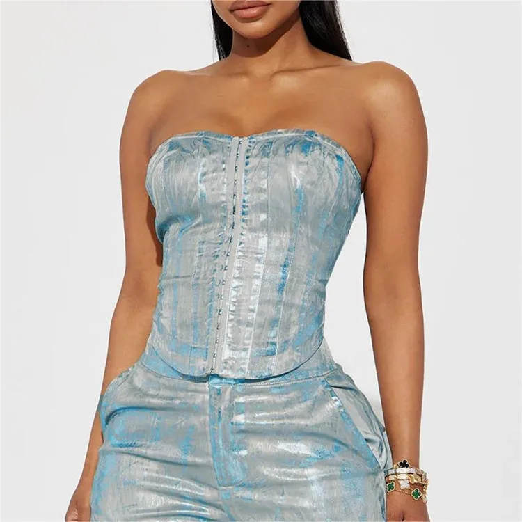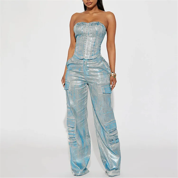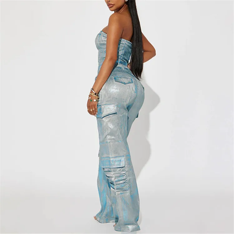 Silver Plating Denim Two Piece Set Women Fashion Tube Top and Wide Leg Straight Cargo Pant Matched Suits