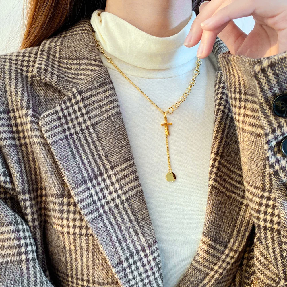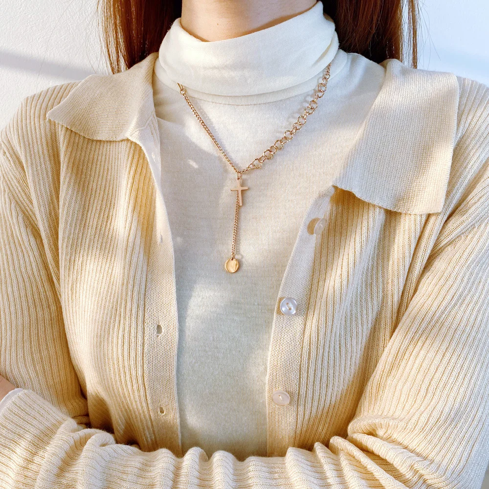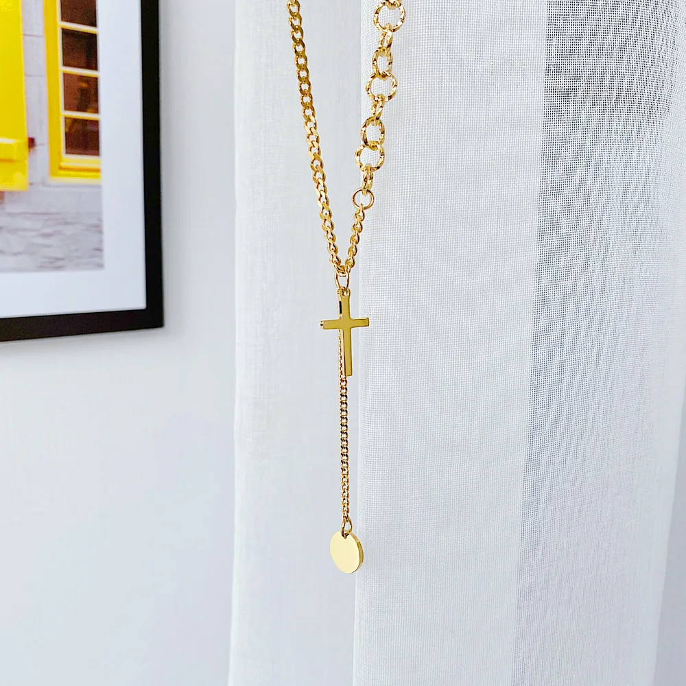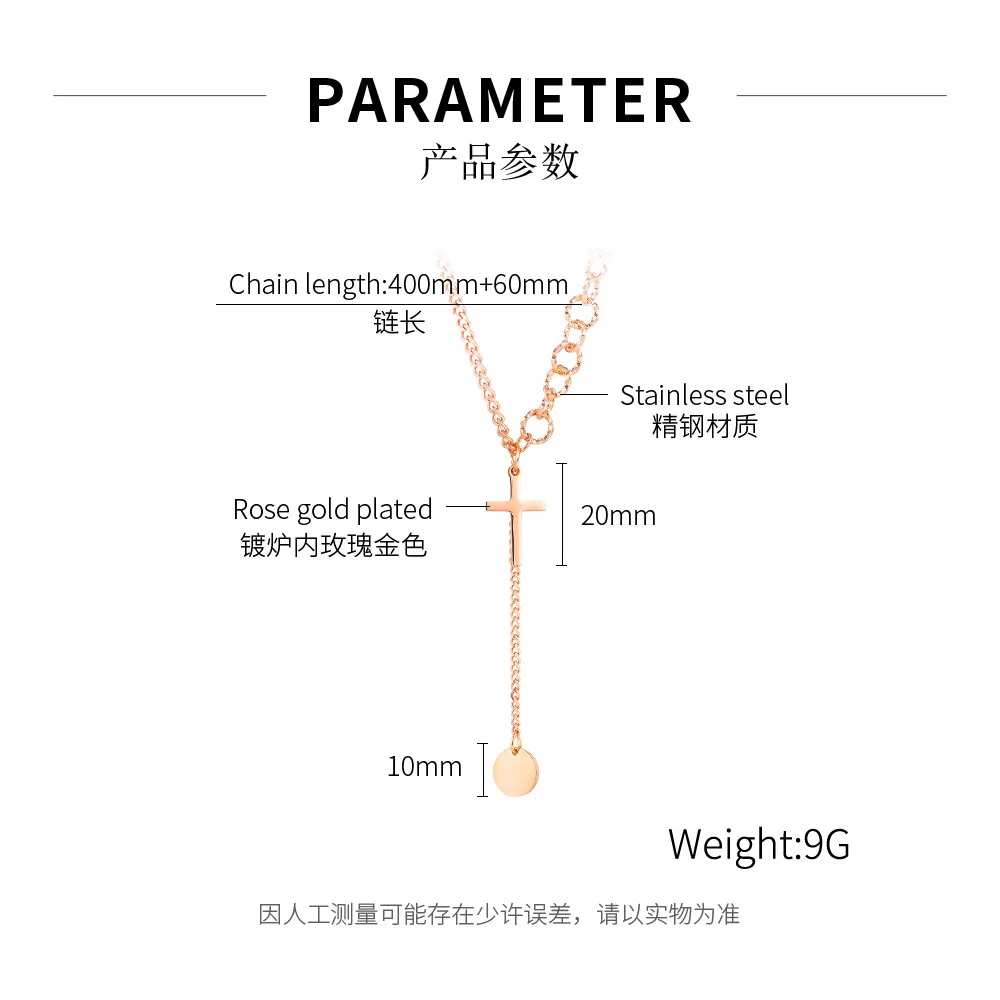 Simple ins wind round brand tassel Pendant Necklace stainless steel Rose Gold Plated Cross Pendant women's sweater long chain
