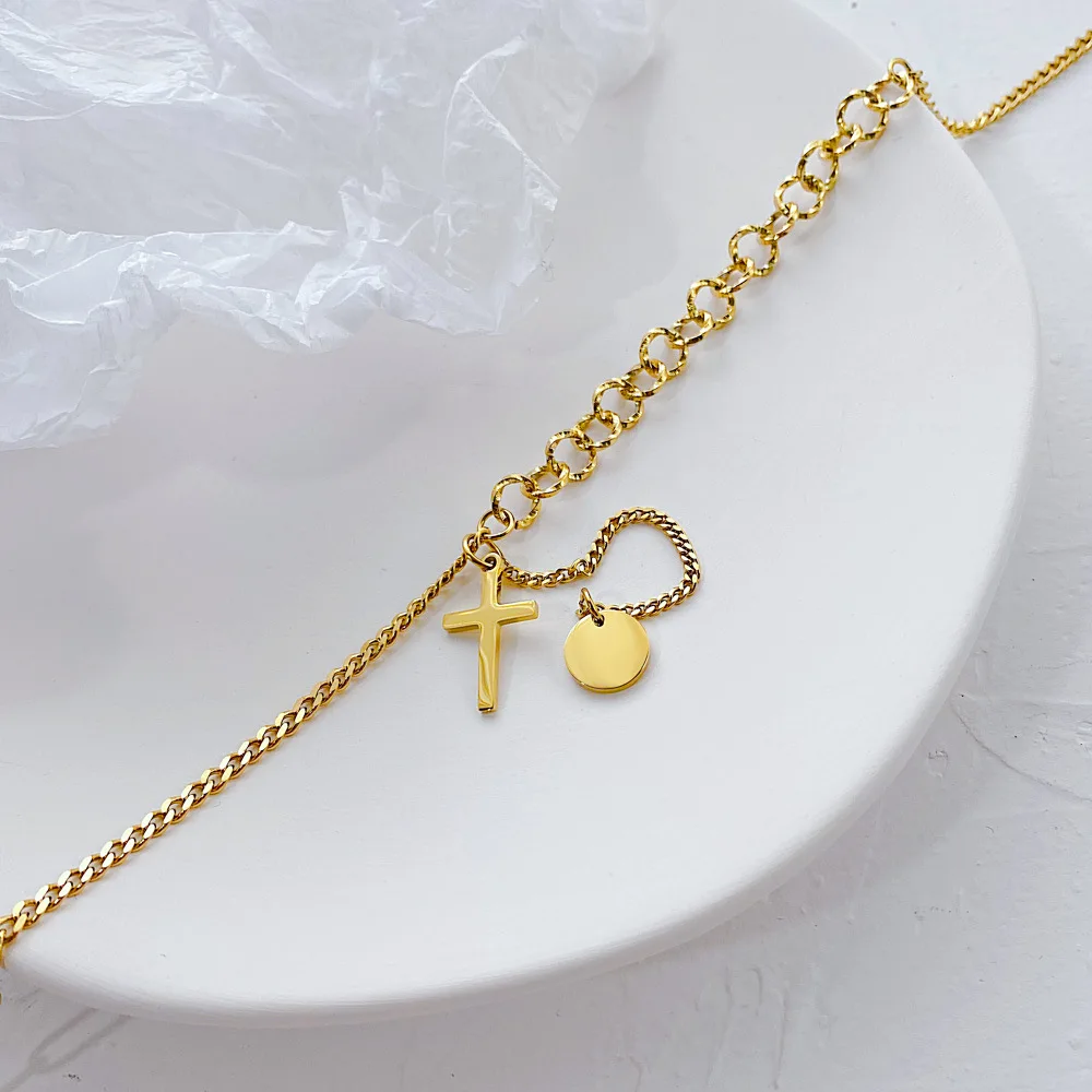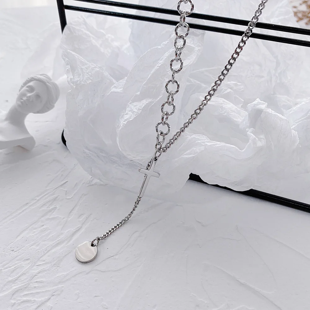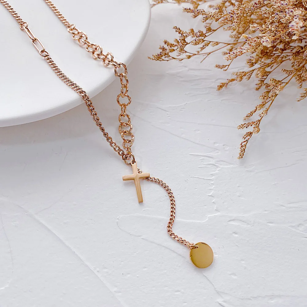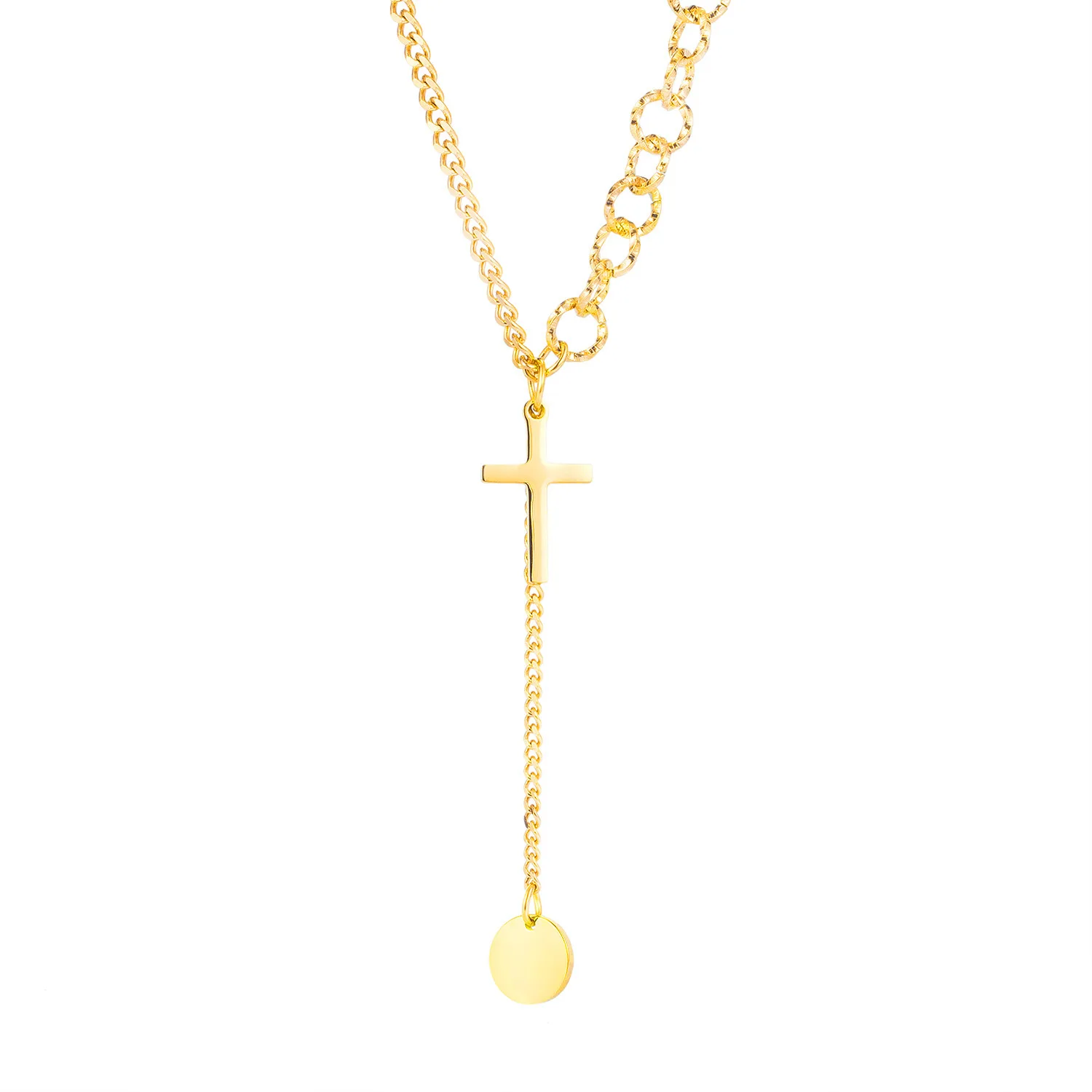 Simple ins wind round brand tassel Pendant Necklace stainless steel Rose Gold Plated Cross Pendant women's sweater long chain