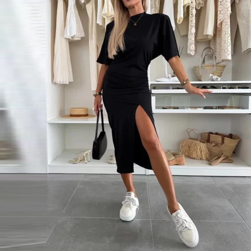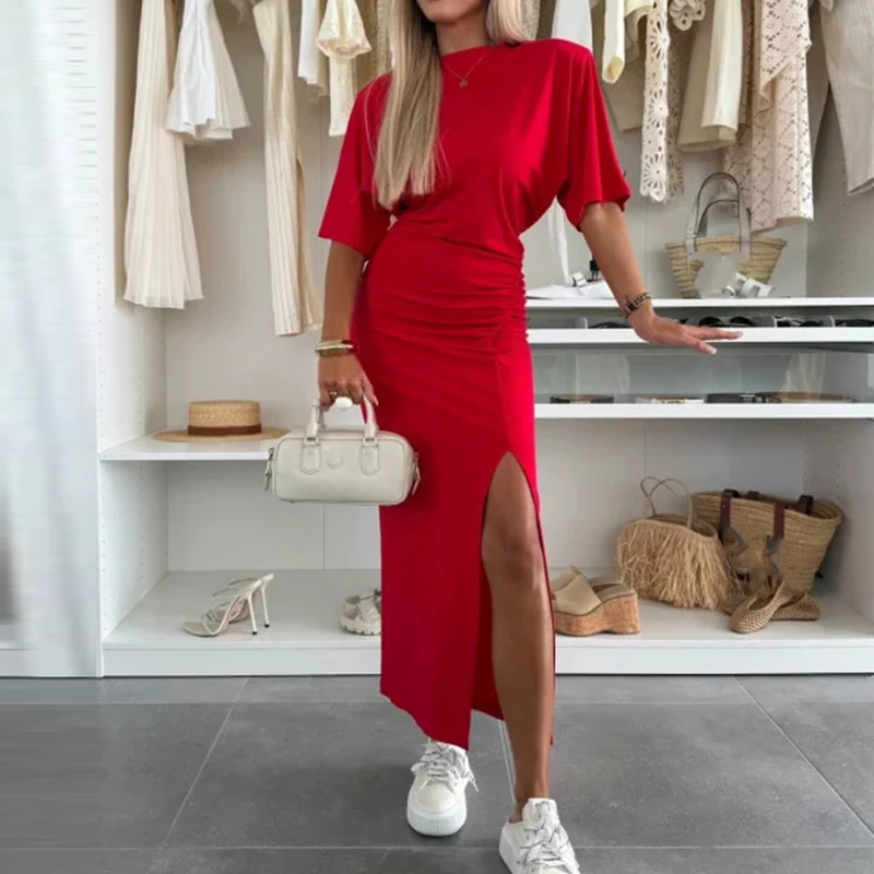 Simple Solid Split Commuting Dress Elegant Wrap Hip Party Long Dresses for Women Casual O Neck Short Sleeved Waist Summer Dress