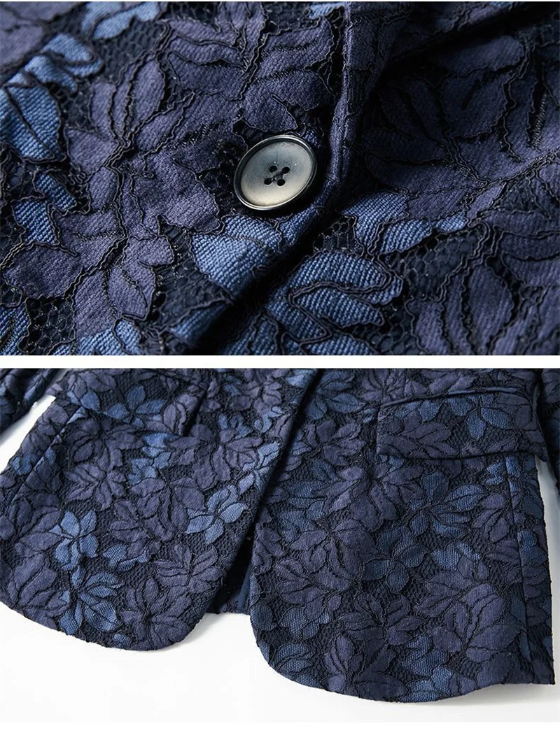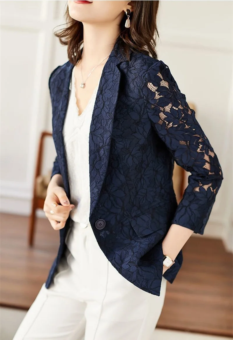 Size 6XL Lace Suit Jacket Female 2021 Autumn And Summer Temperament Sunscreen Hollow Blue Ladies Blazer Women Tops Elegant