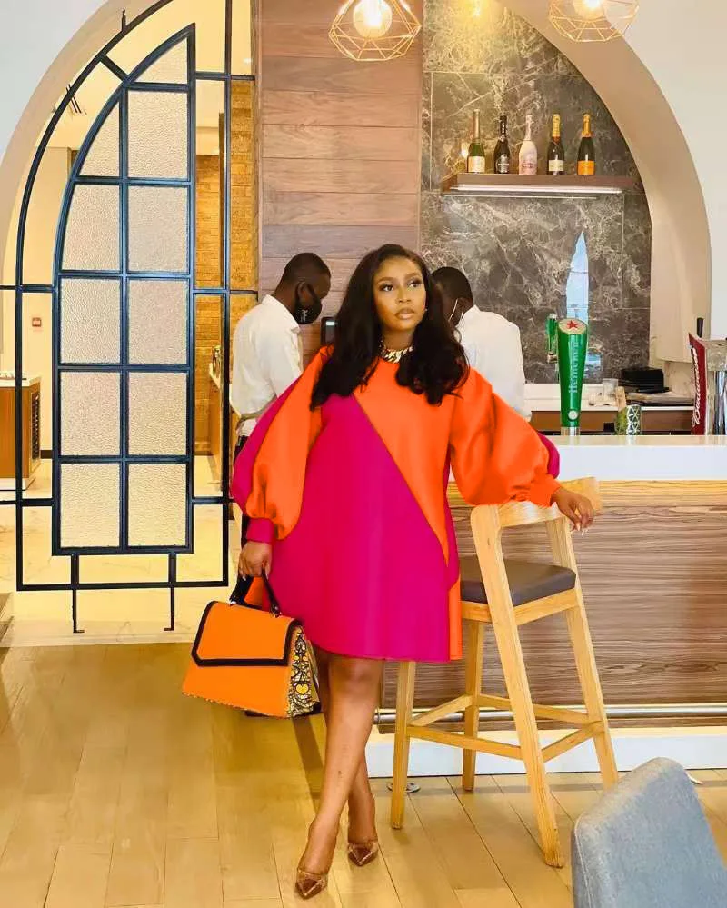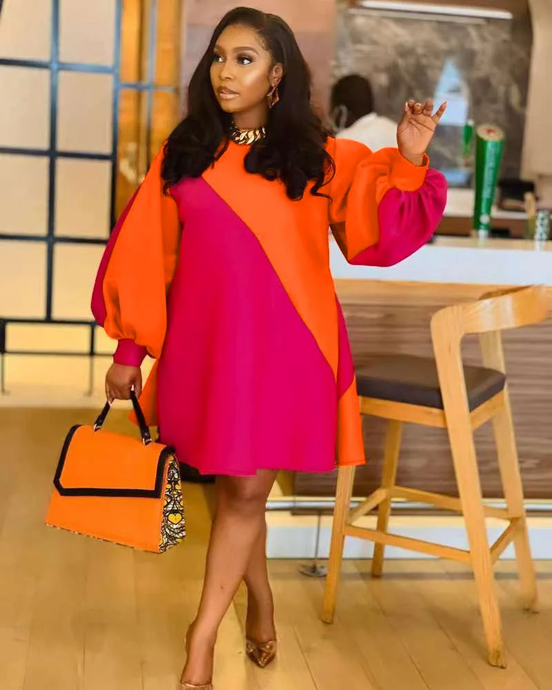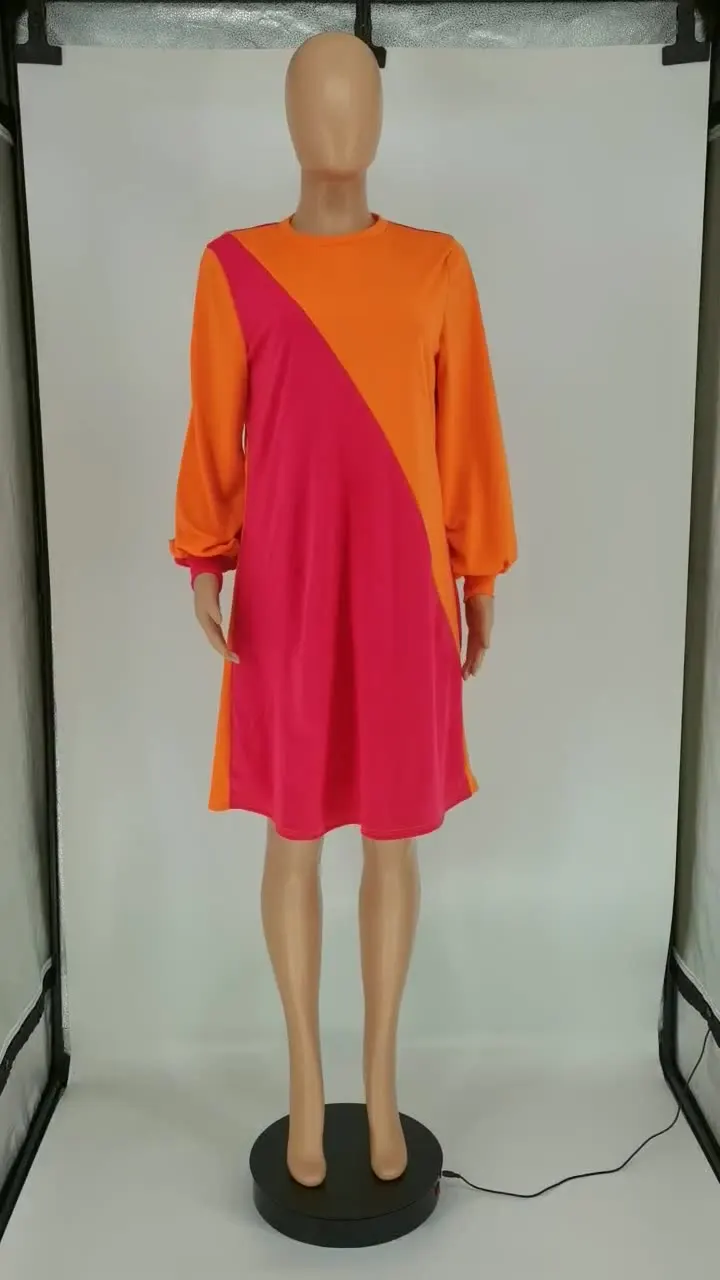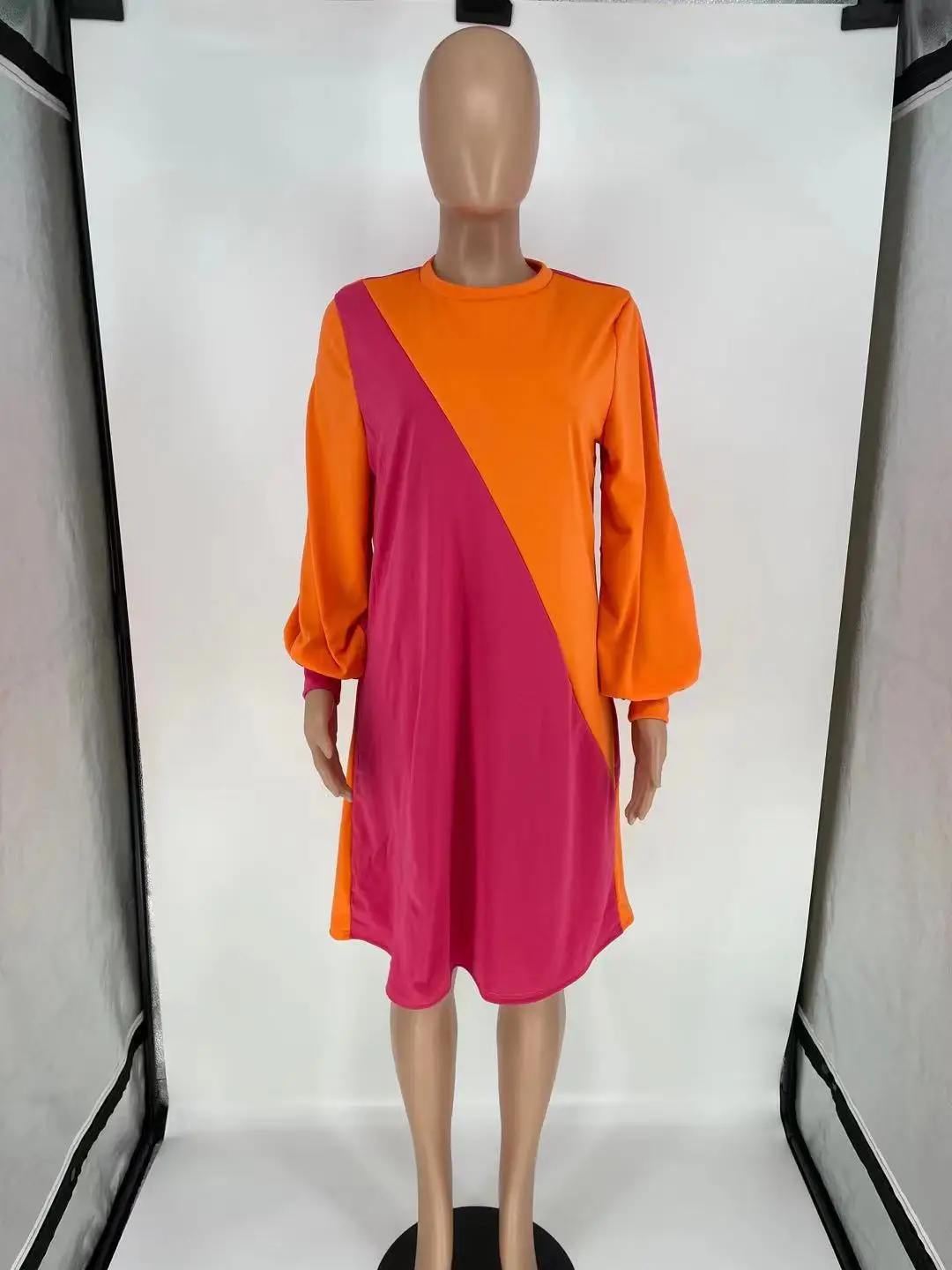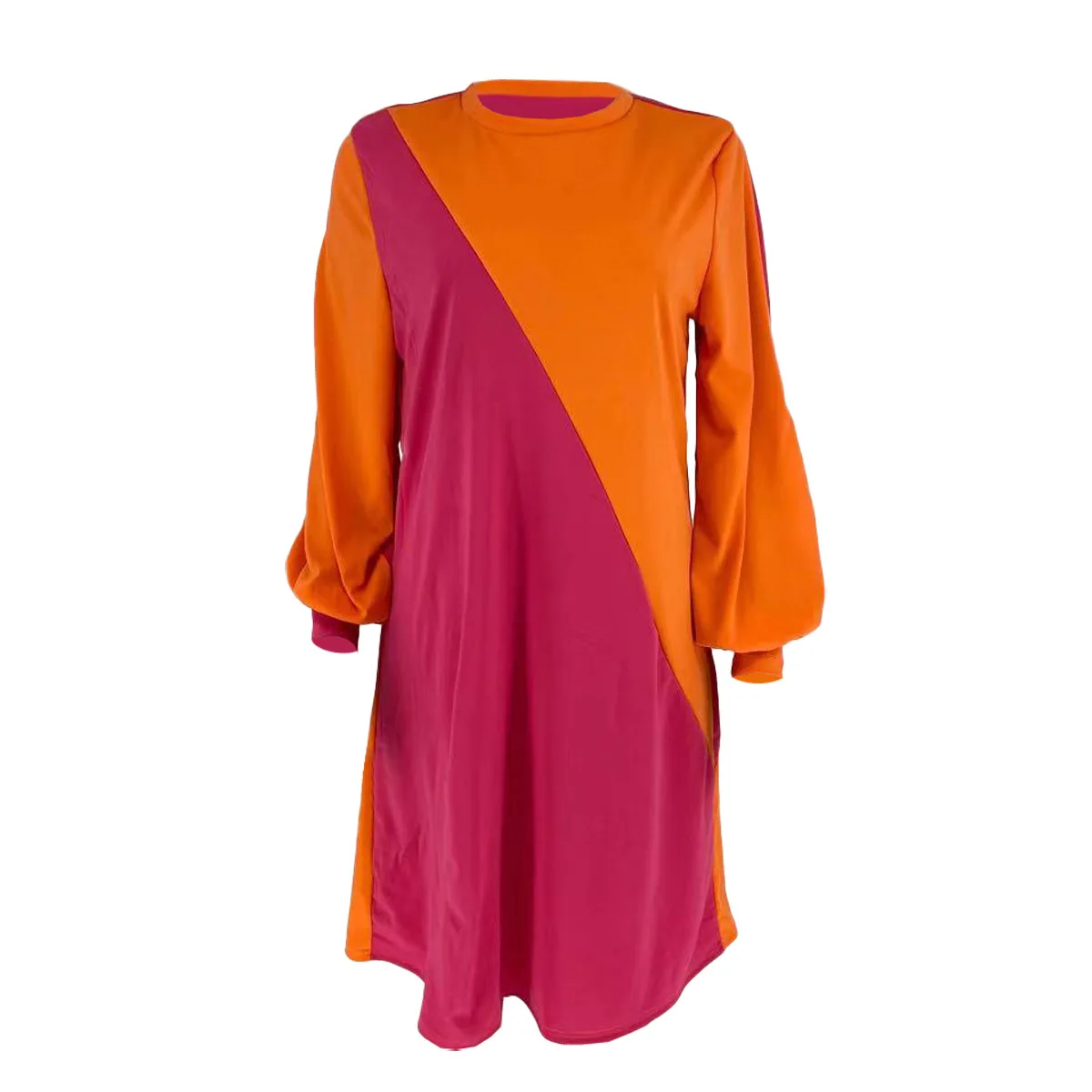 SL7021New Design Casual Color Block Puff Sleeve Loose Dress Women Sehe Fashion