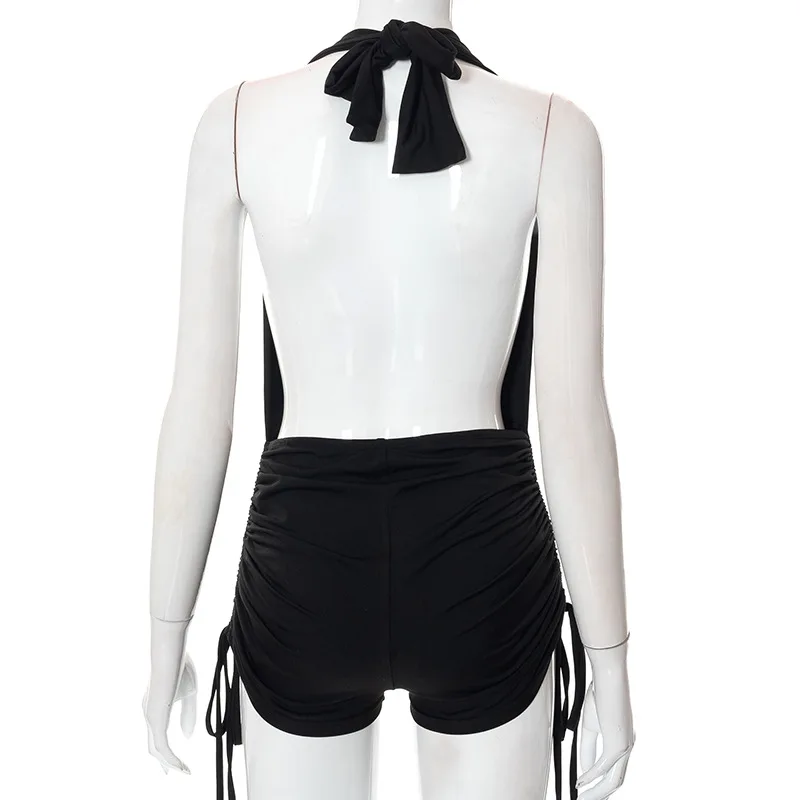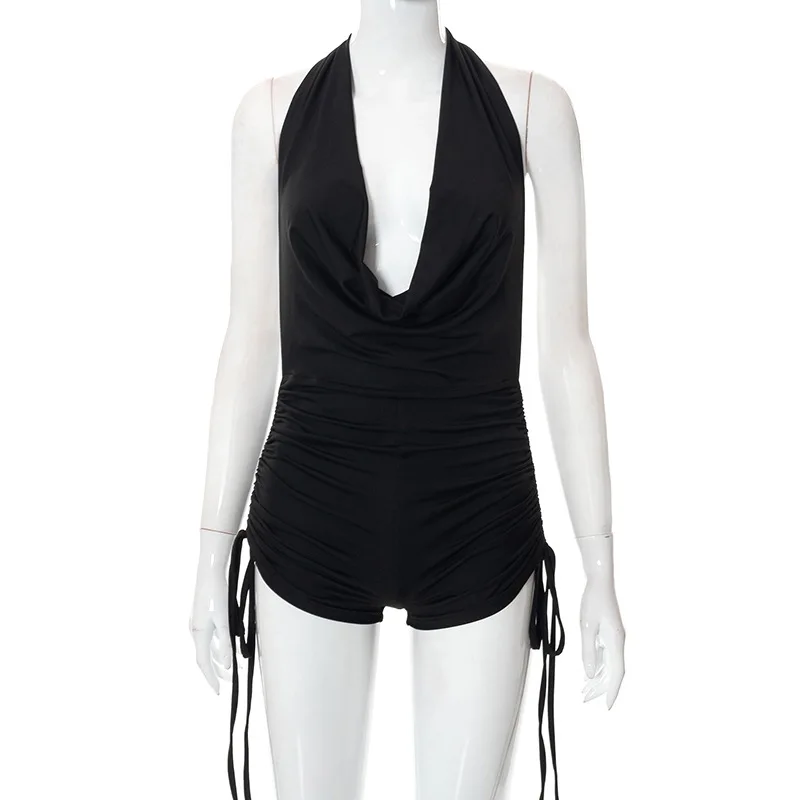 Sleeveless Sexy Halter Deep V Drawstring Casual Short Jumpsuit Women