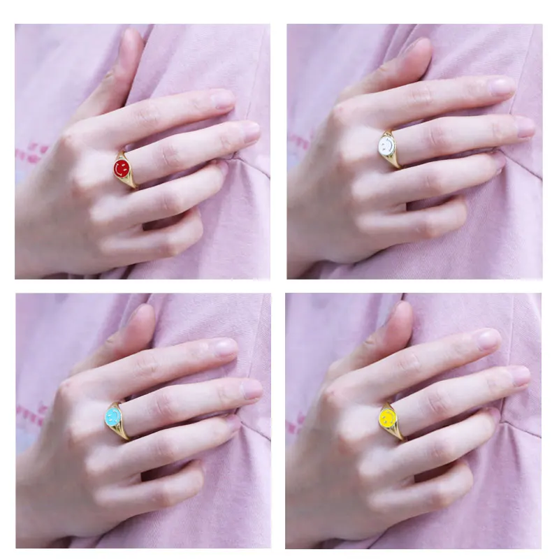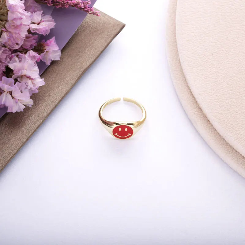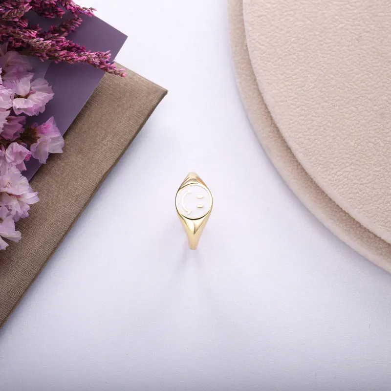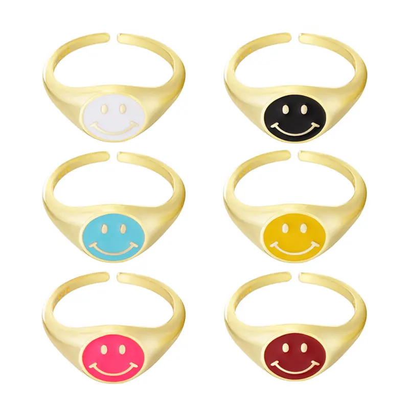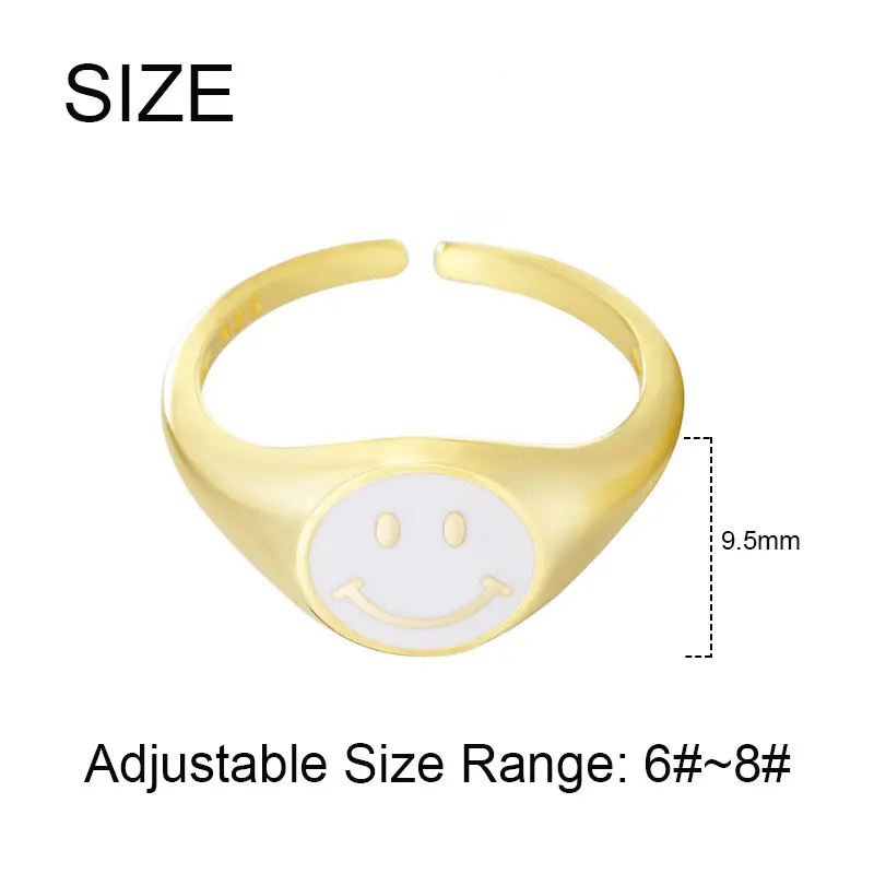 Slovehoony 14k Gold Plated Fashion Smiley Enamel Adjustable Ring 925 Sterling Silver Vintage Open Designer Ring For Girls