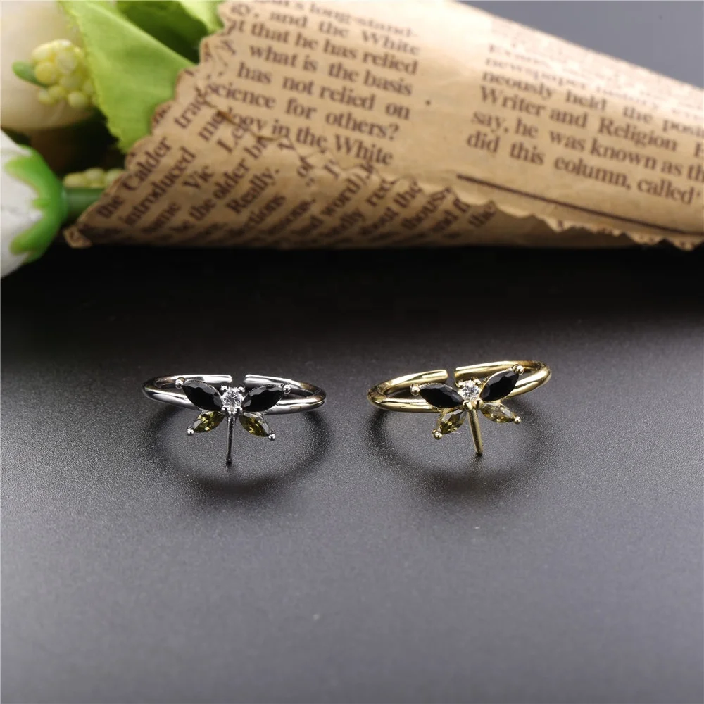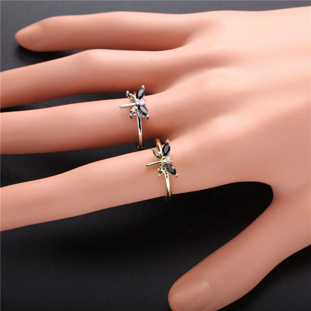 The Picture of Slovehoony Fashion Cool Girl Dragonfly Ring Black Gemstone Wing 925 Sterling Silver CZ Open Ring For Women Jewelry Gift Hip Hop