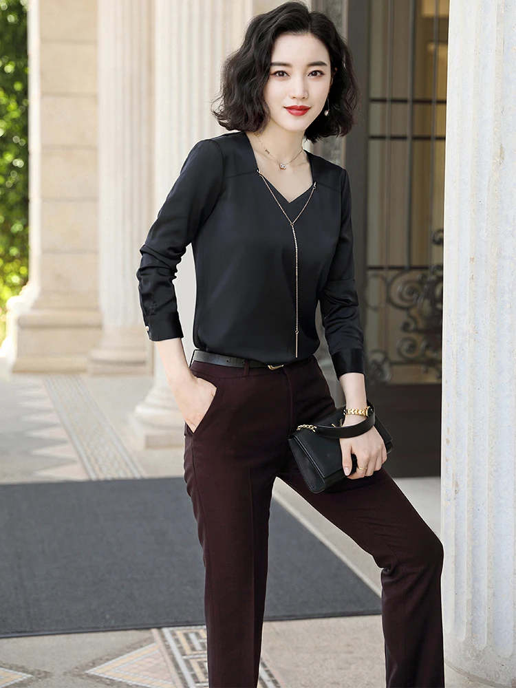 Smooth Fabric V-neck Shirts for Women High-quality Blouse with Chain Work Wear Office Lady Female Tops Chemise Loose style