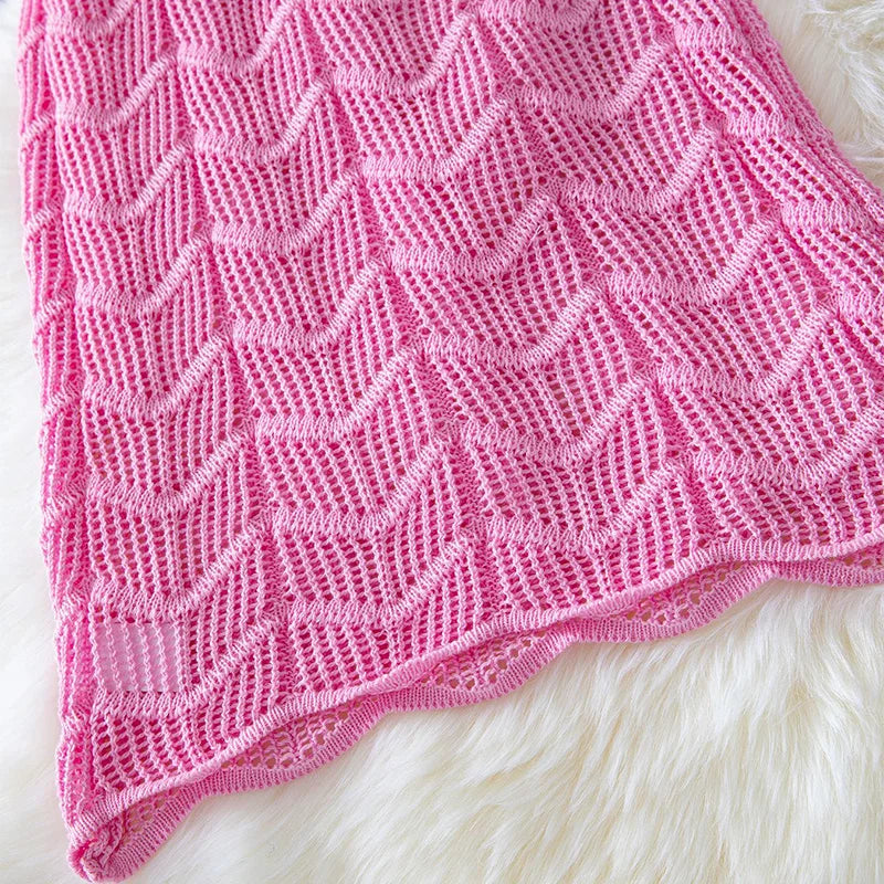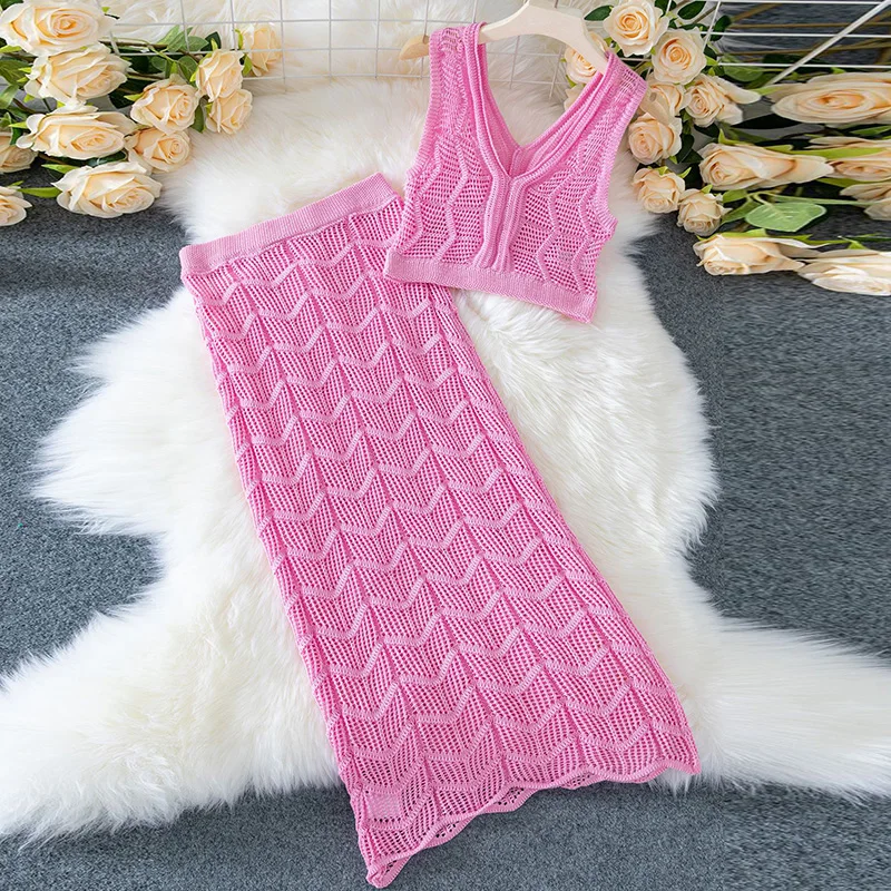 Solid Color Knitted Slim Fit Two Piece Set Casual Hollow Out Beach Outfit Lady Summer V Neck Sleeveless Top and Long Skirt Suit