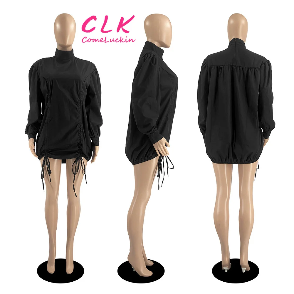 Solid Drawstring Ruched Shirts Mini Dresses Women Autumn Turtleneck Long Sleeve Casual Loose Dress
