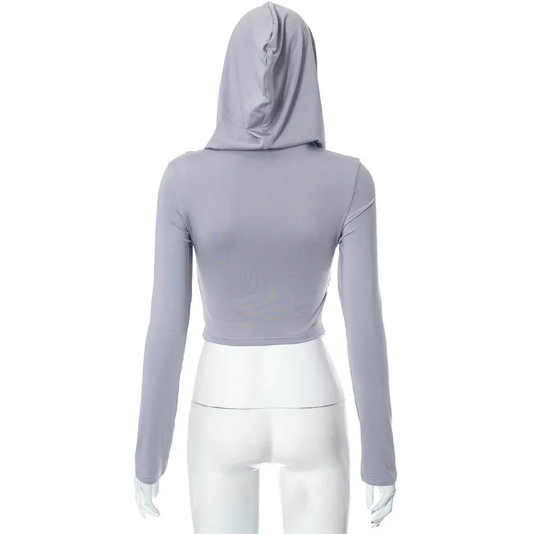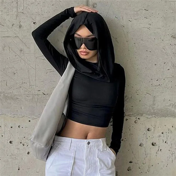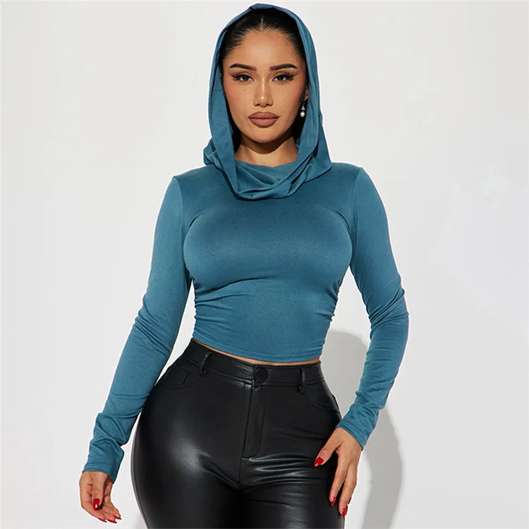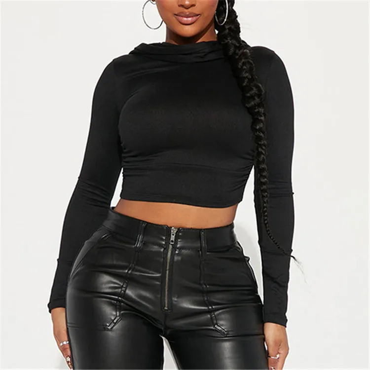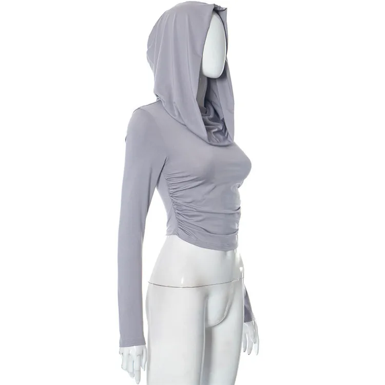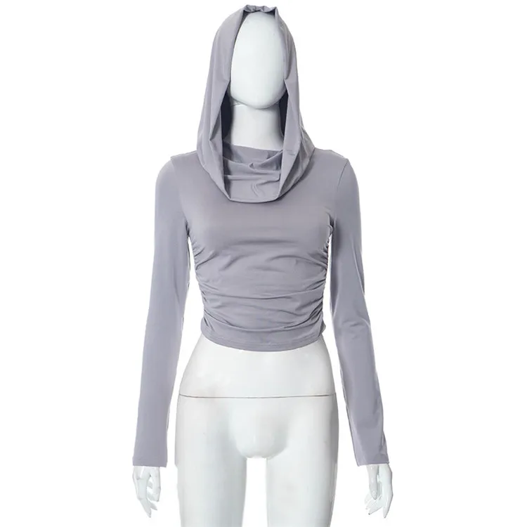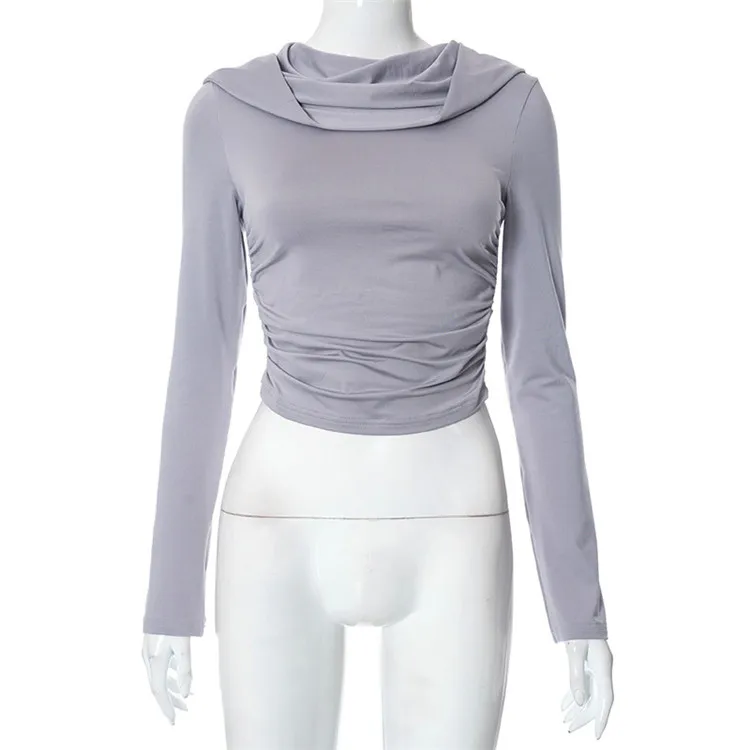 Solid Folds Hooded Crop Top Women Grunge y2k Full Sleeve Skinny T Shirts Harajuku Street Style Autumn Tees