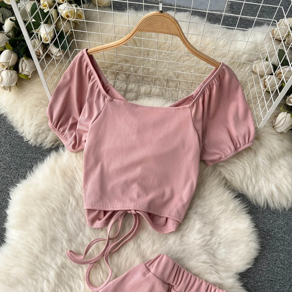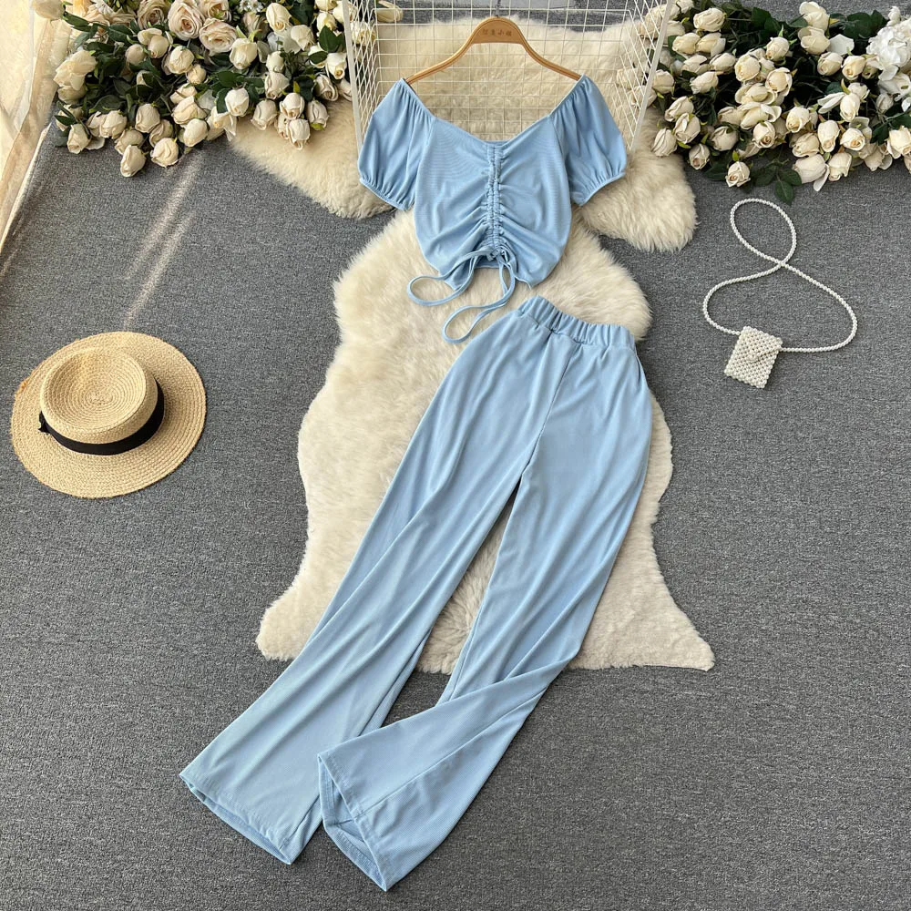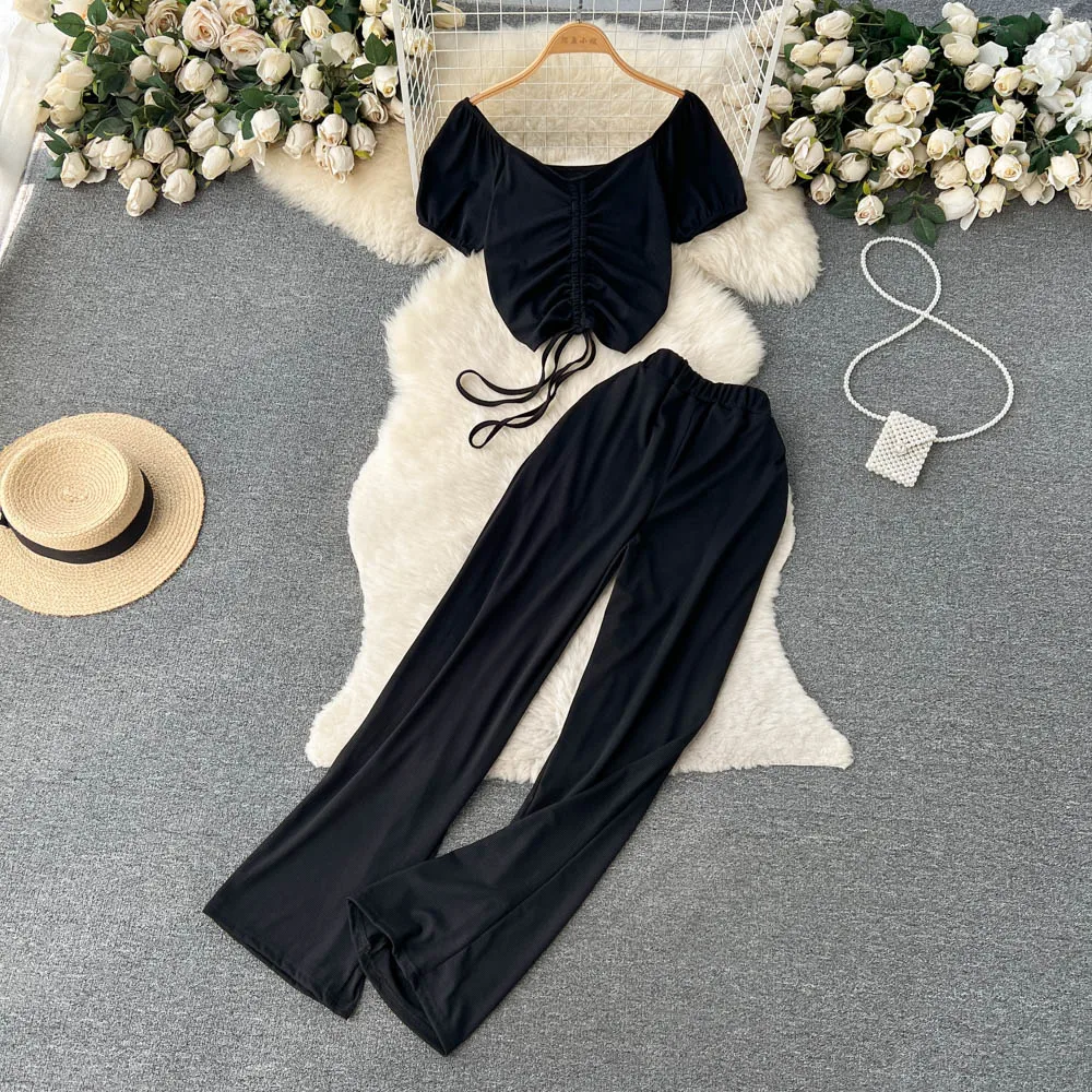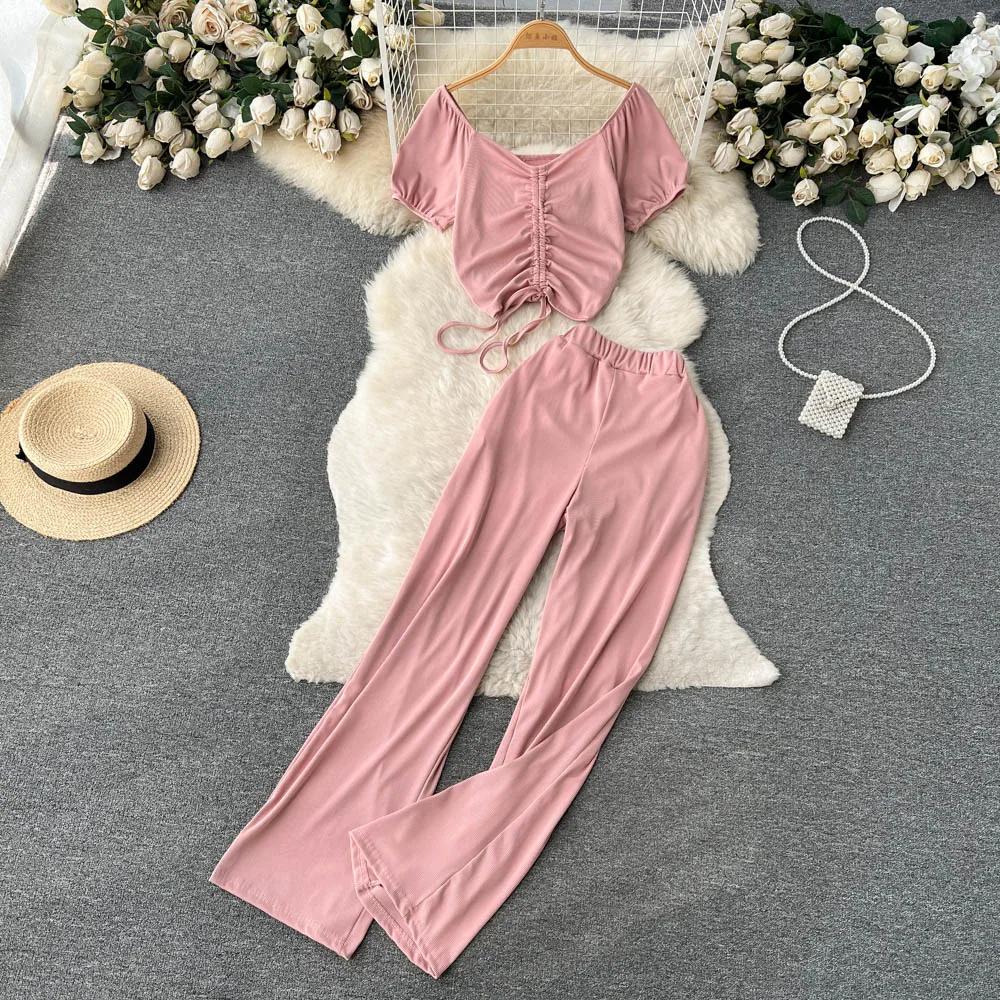 Spice Girl V-neck drawstring Fold lace-up short slim short sleeve top + high waist casual wide leg pants two-piece suit summer
