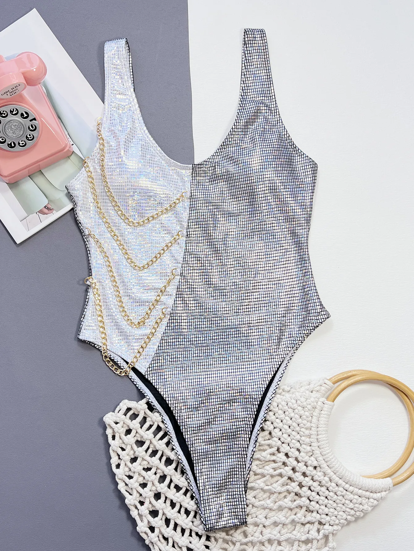 Splicing Shiny Sequins Metal Chains One Piece Swimwear Women Swimsuit 2023 High Leg Cut Padded Bather Bathing Suit Swim Lady