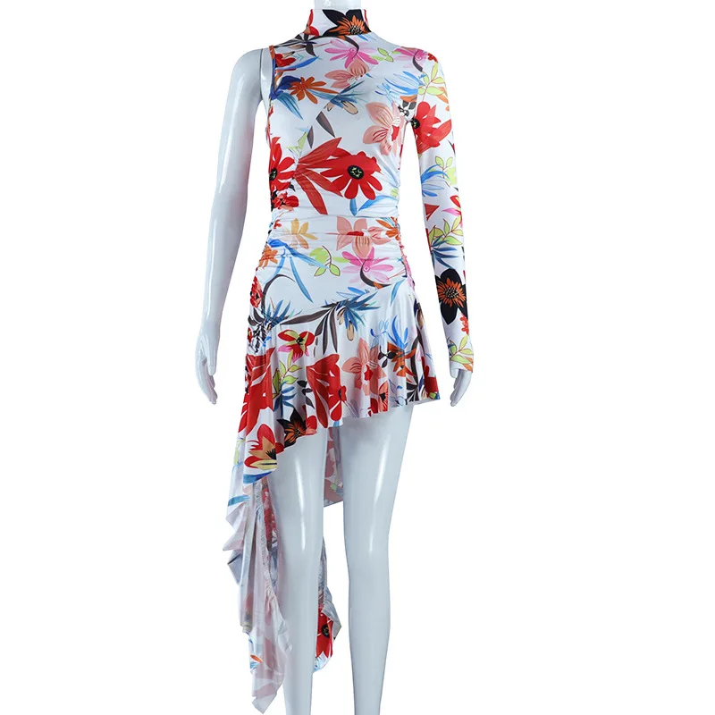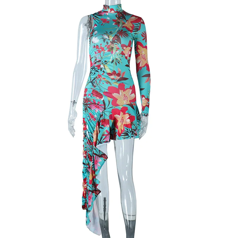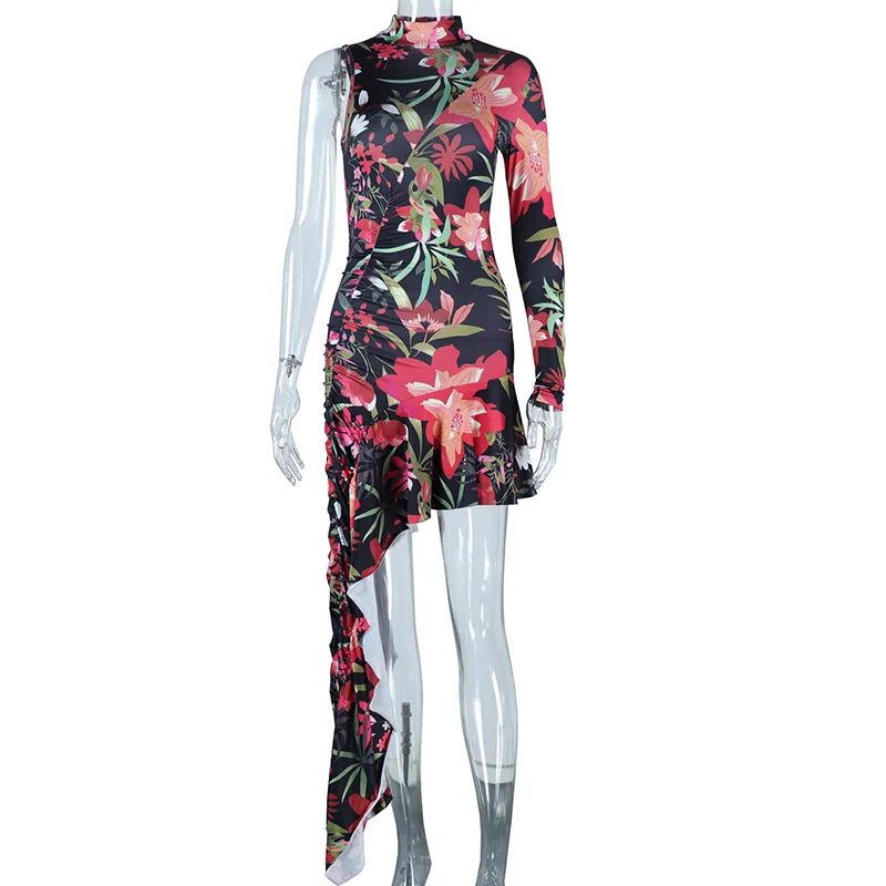 Spring 2023 Women s Clothing Stand Collar Single Long Sleeve Ruffled Edge Irregular Mid-length Dress