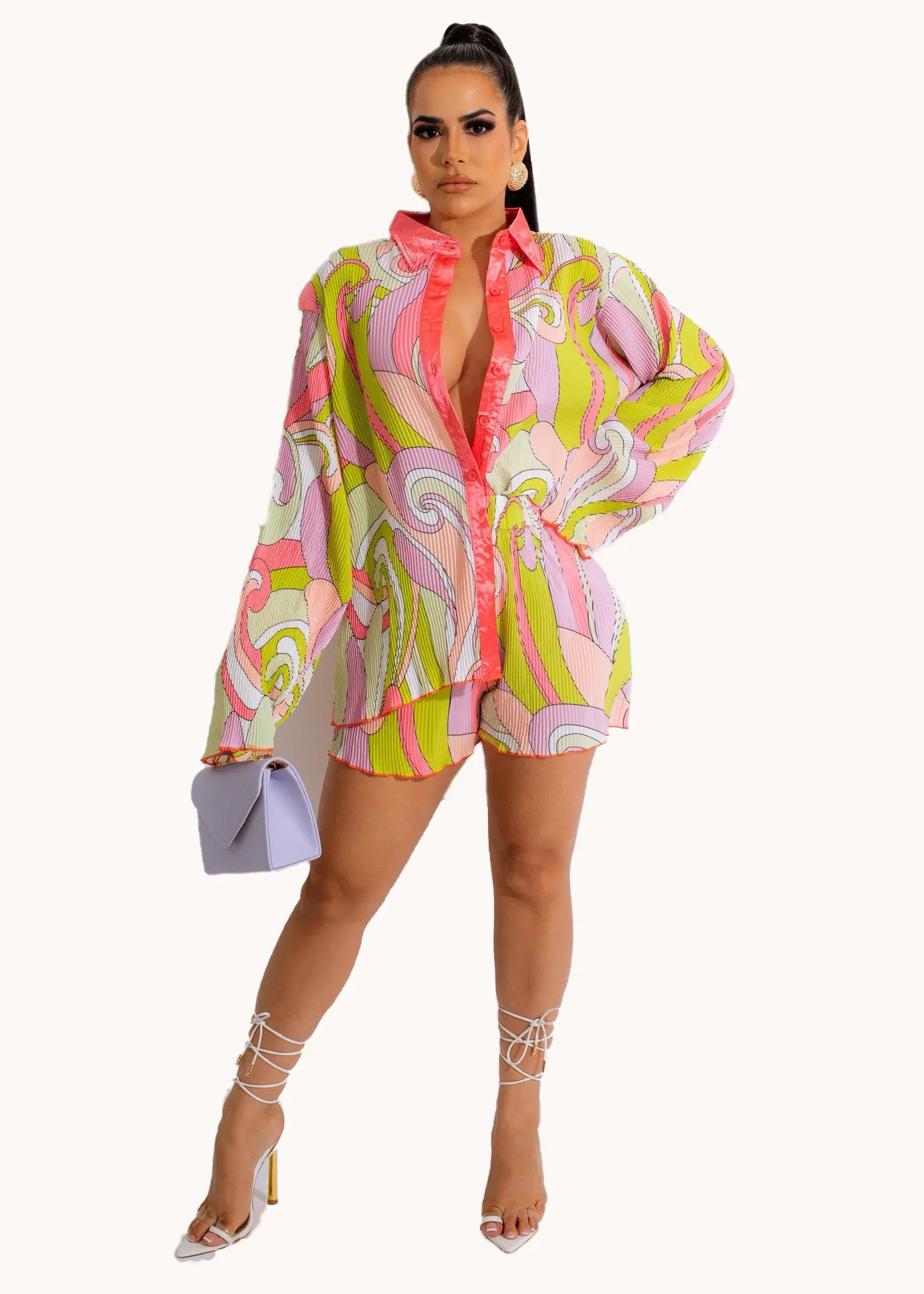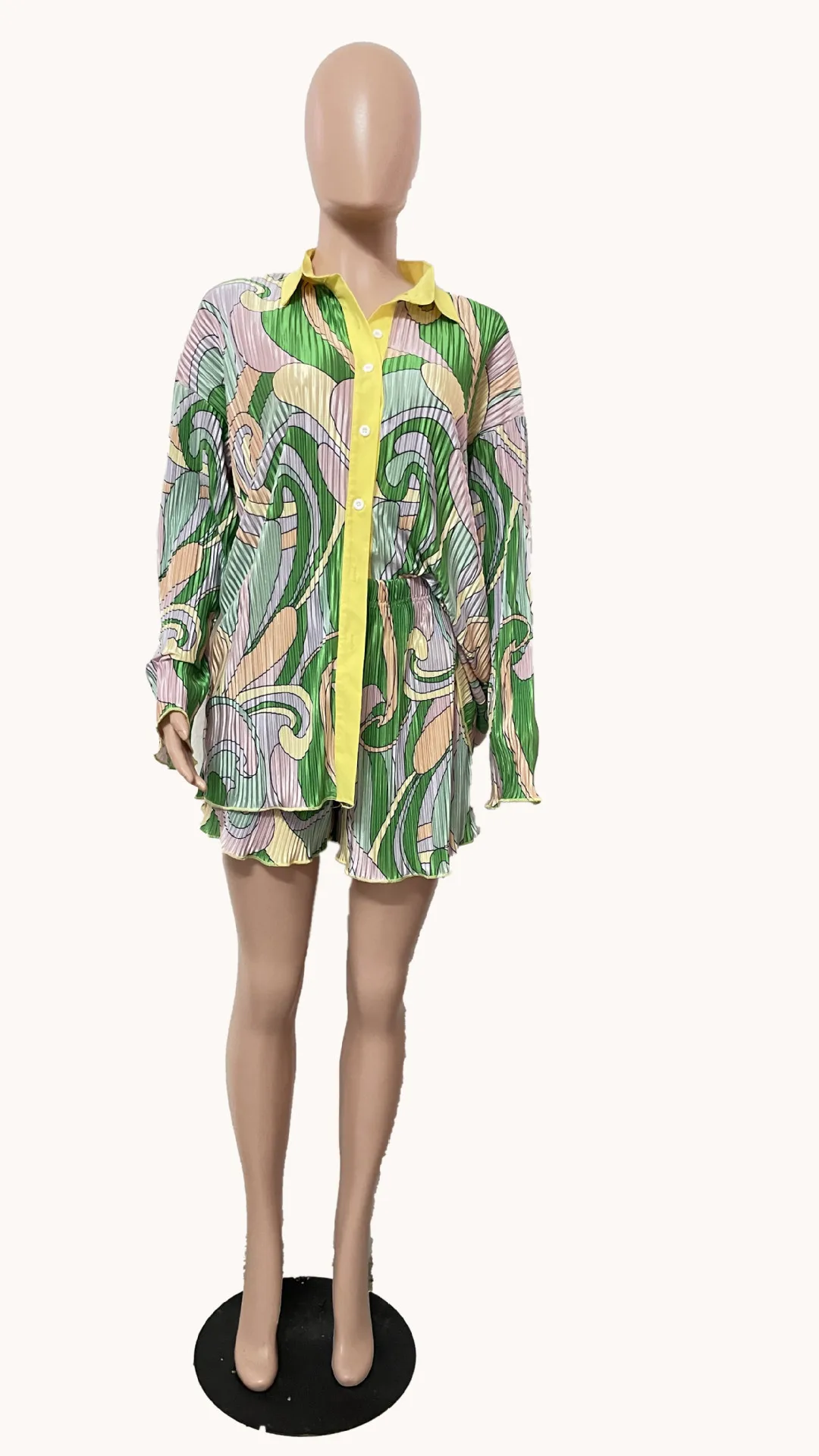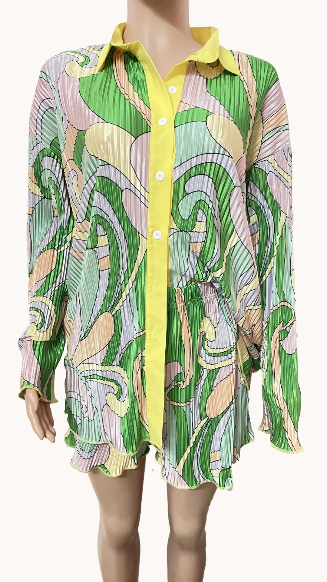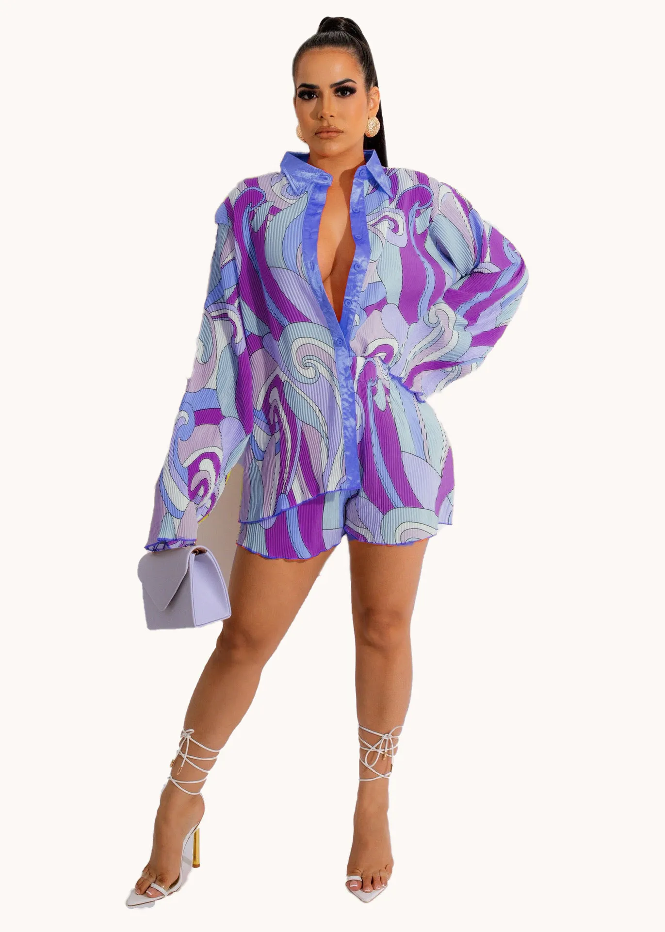 Spring 2023 Women'S Clothing Digital Geometric Printing Blouse Matching Shorts Two Piece Set Office Street Casual Wear