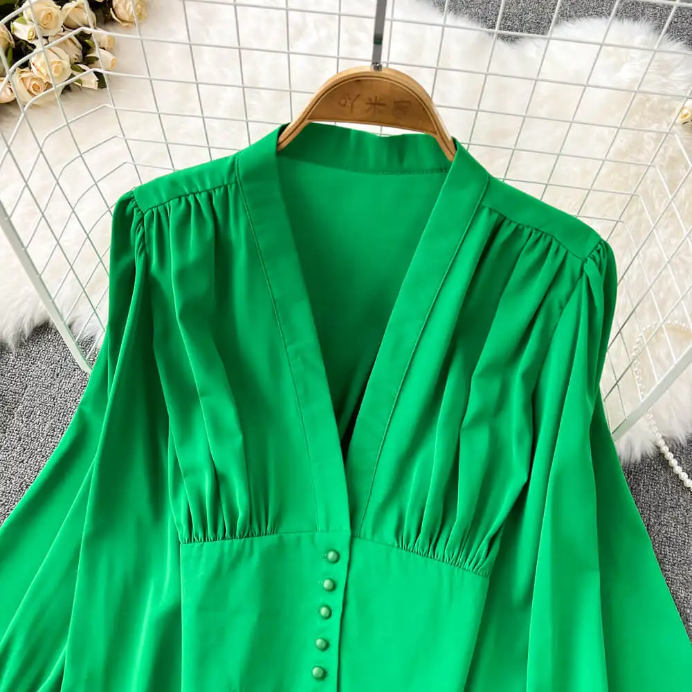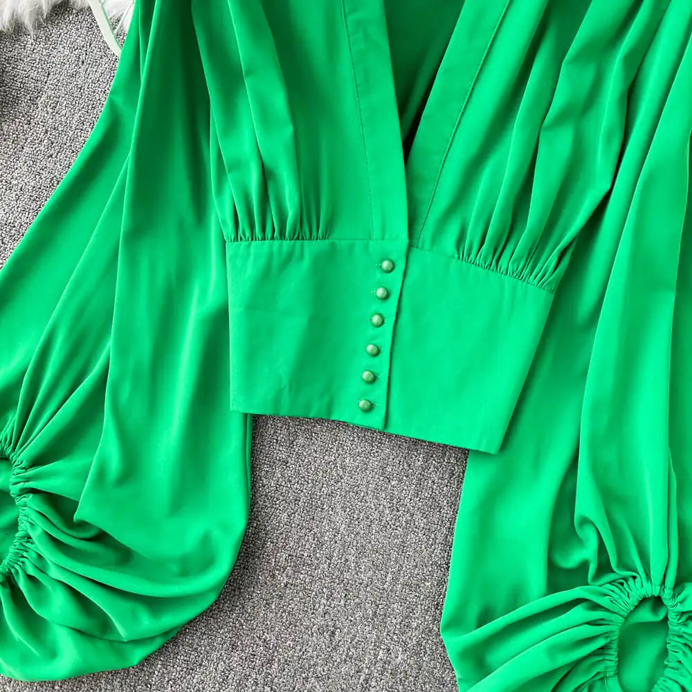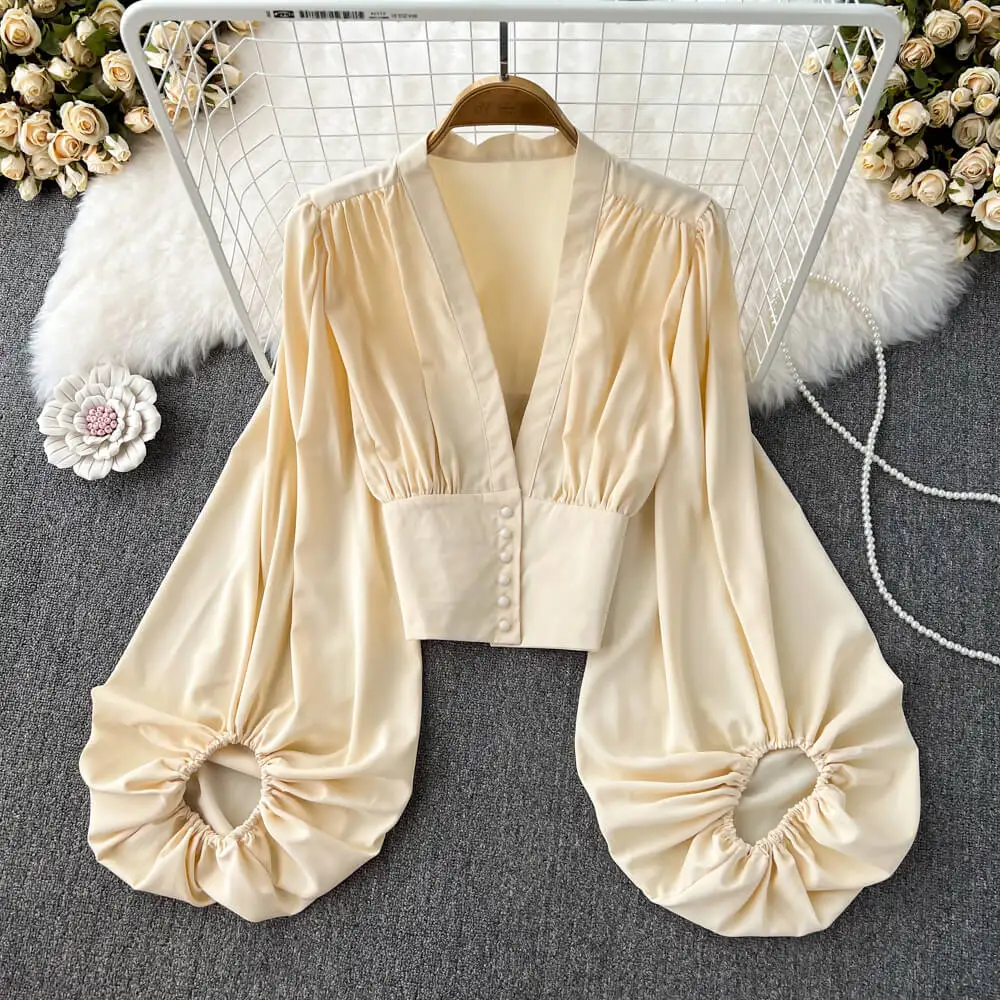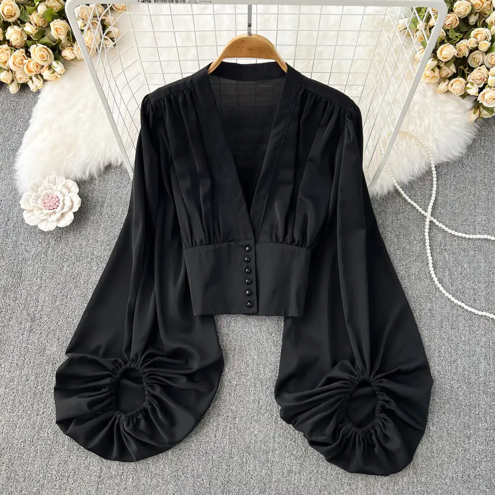 Spring and Autumn Fashion V-neck Lantern Long Sleeve Shirt Women High Waisted Pullover Short Slim Top