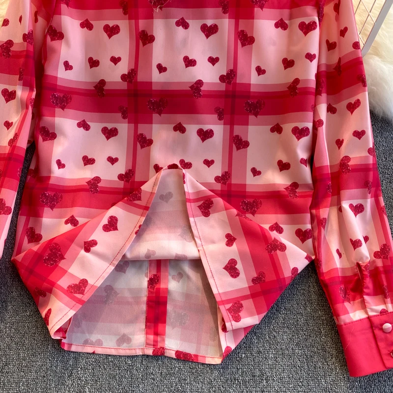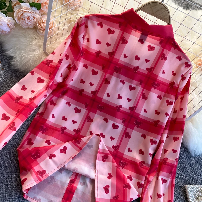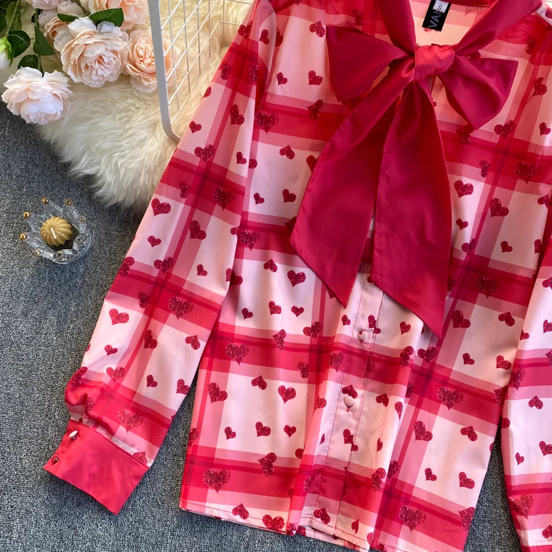 Spring and Autumn New Bow Tie Heart Print Checker Pattern Versatile Shirt Women's Sweet Top Fashion
