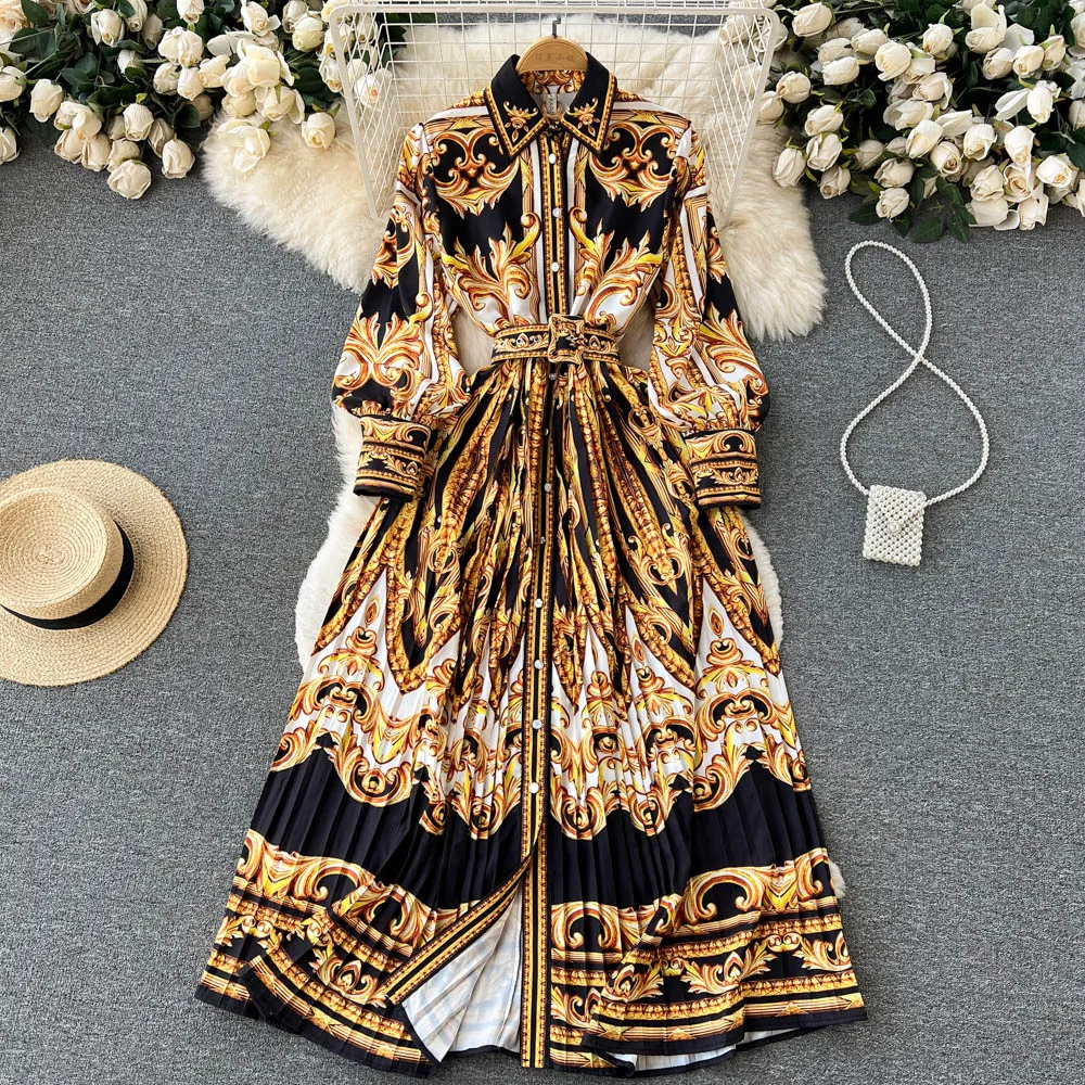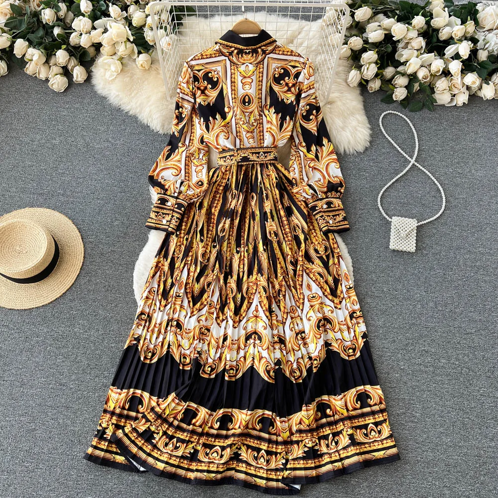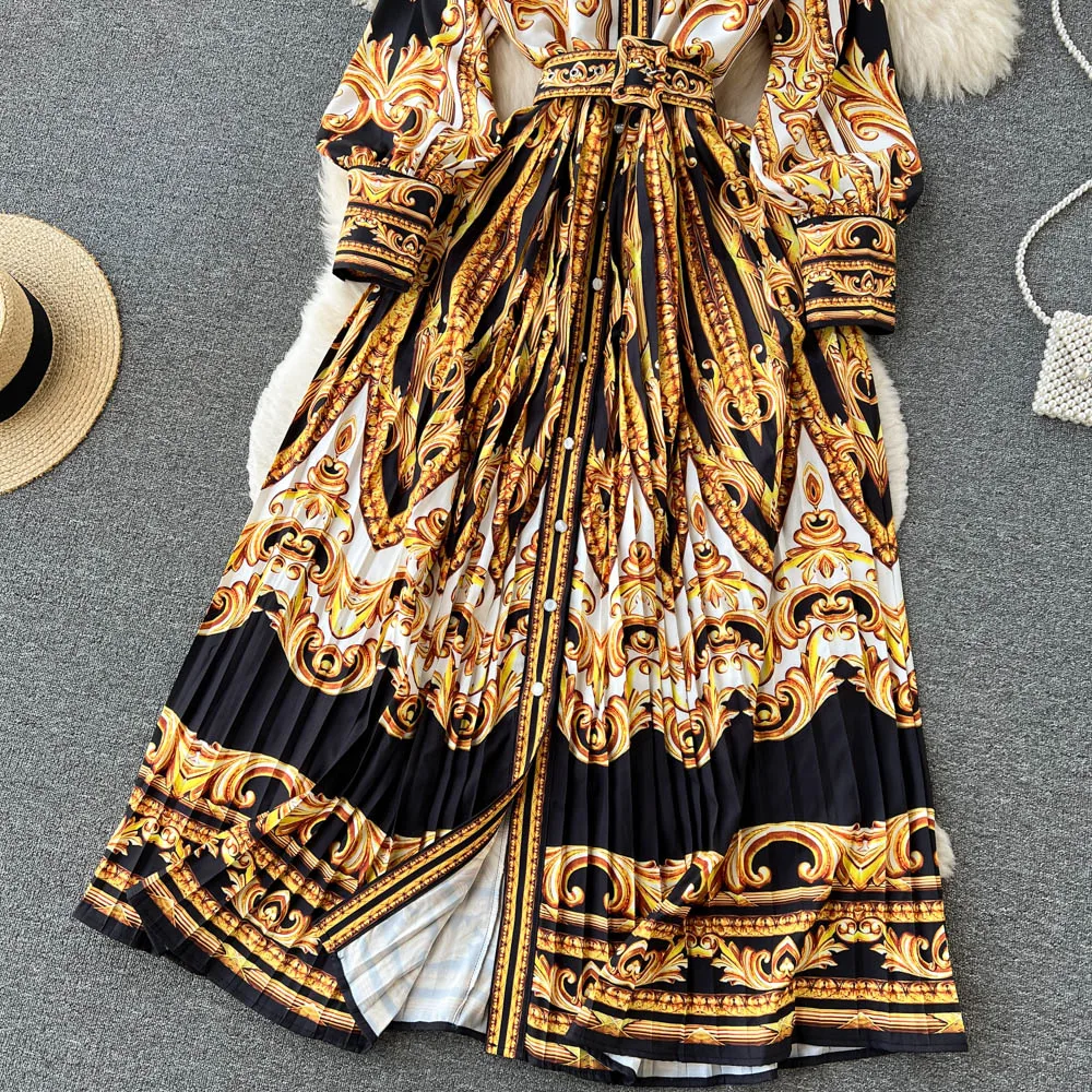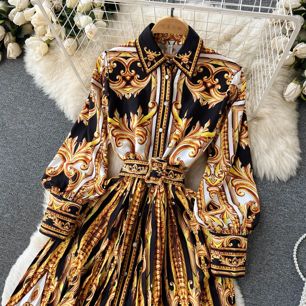 Spring and autumn new stand-up collar lantern sleeves printed floral casual dress