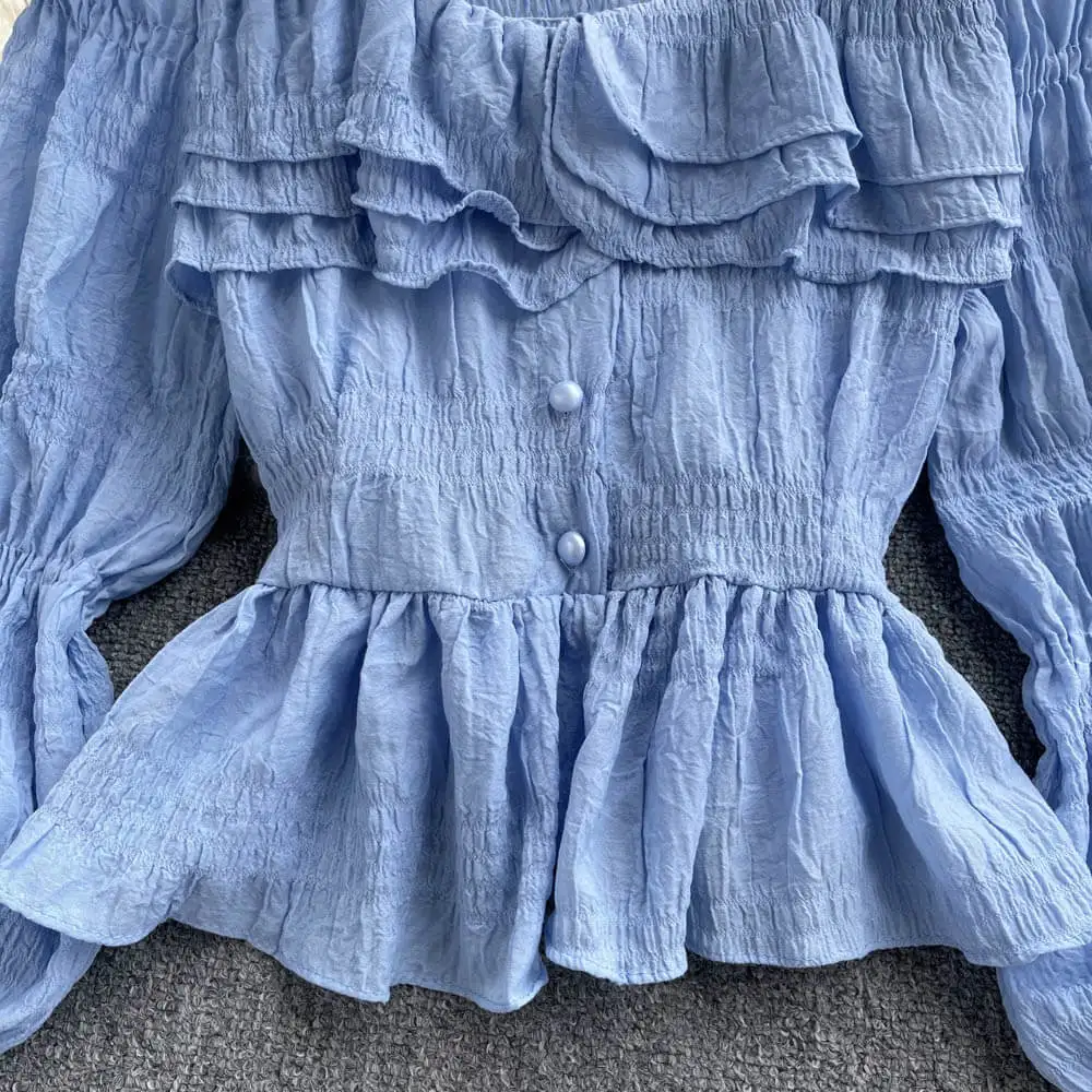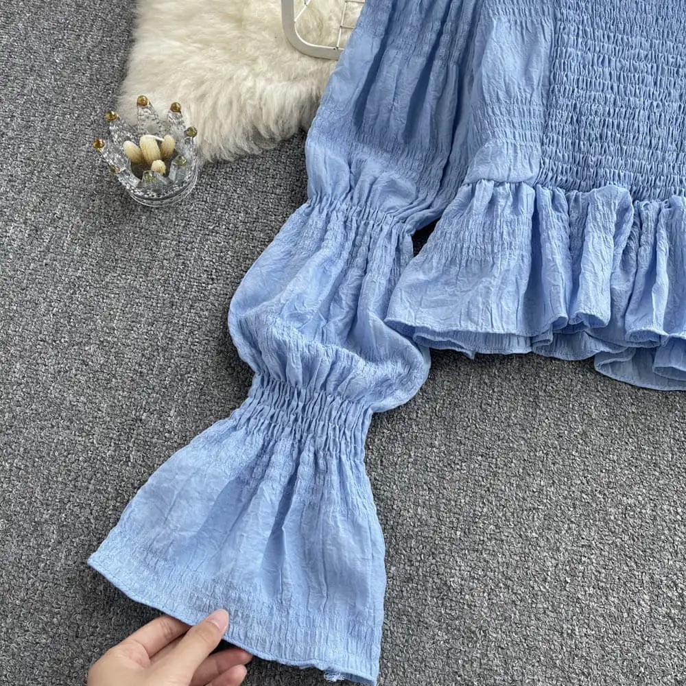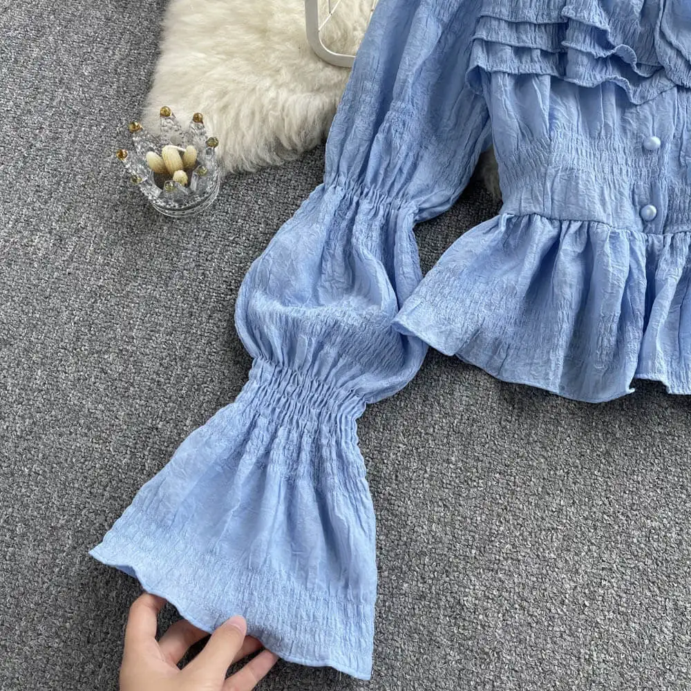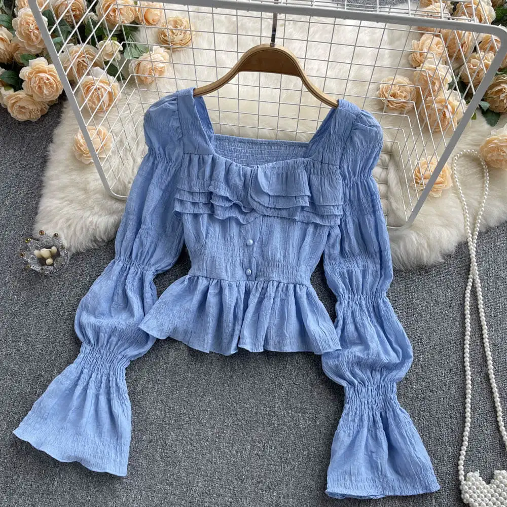 Spring and Autumn New Women Ruffle Square Neck Pretty Flare Long Sleeve Blouse Shirt