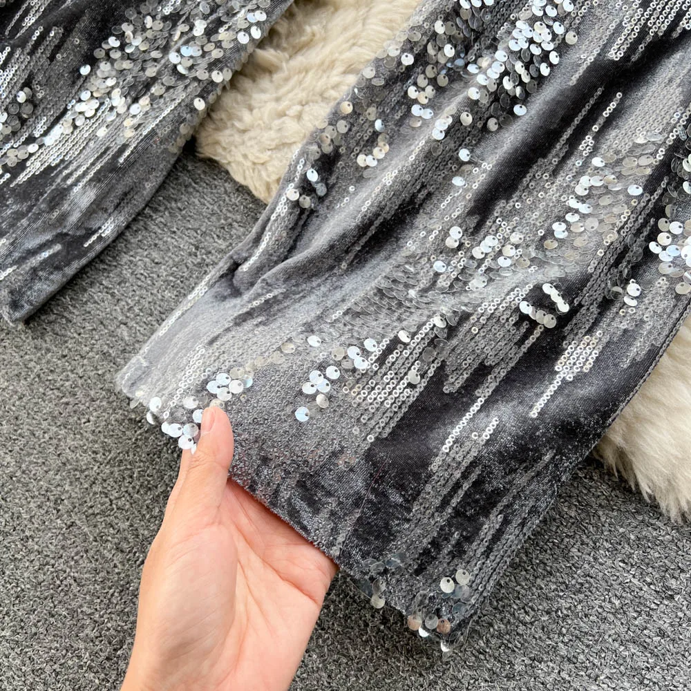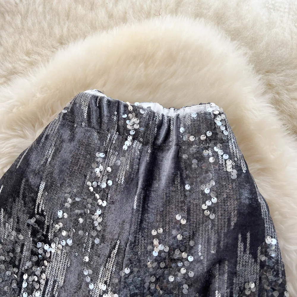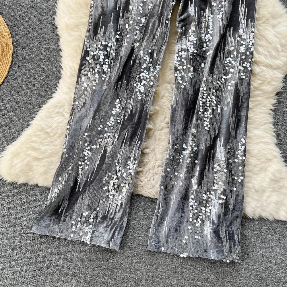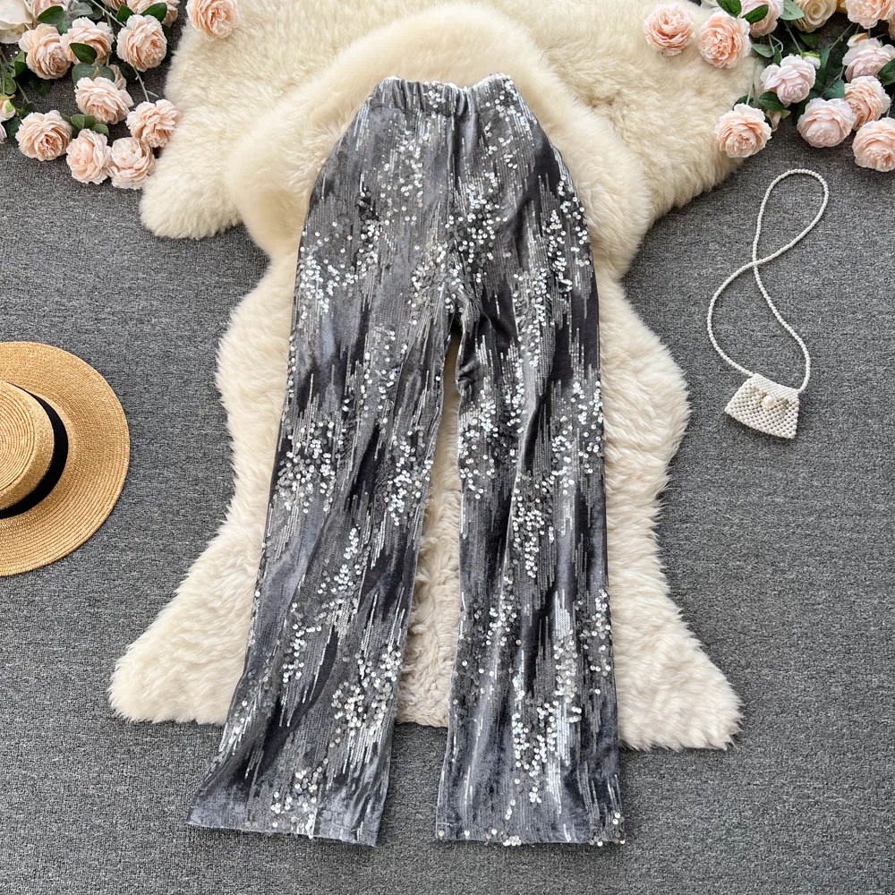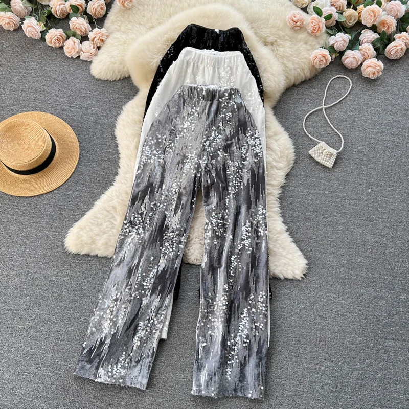 Spring Fashion Elastic Waist Sequin Pant Trousers Women Casual Wide Leg Pants Ladies