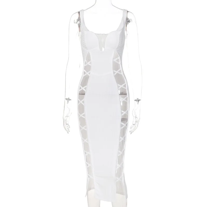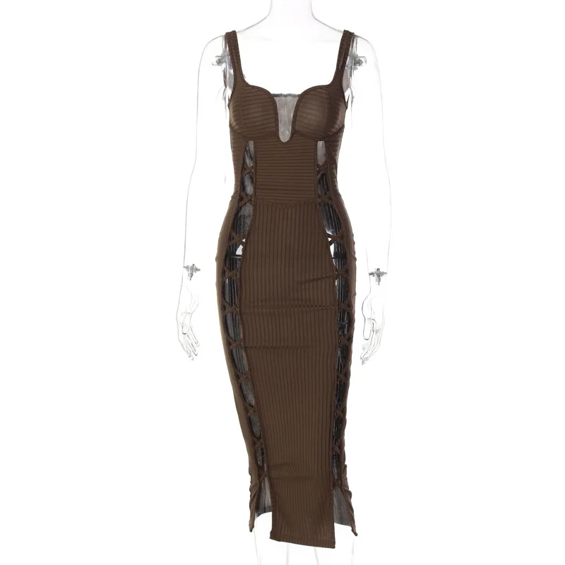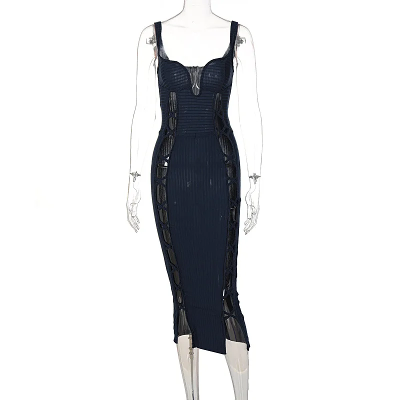 Spring new spandex/polyester tethered hollow suspenders women midi skirt sexy dresses