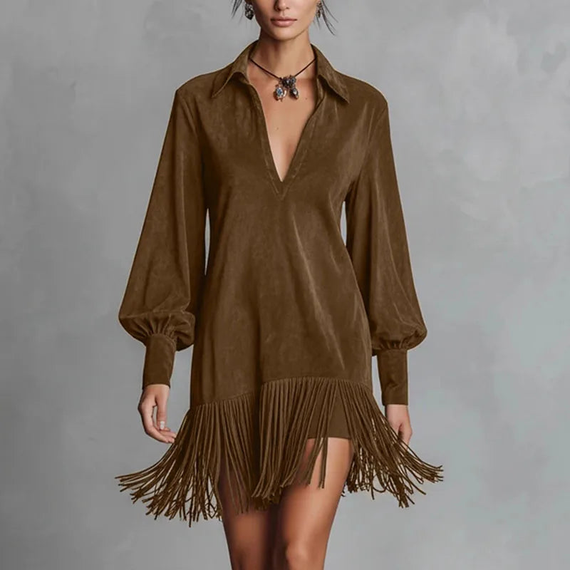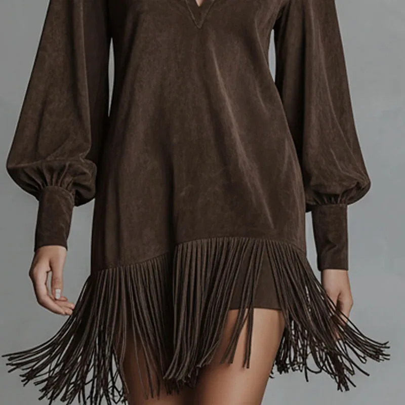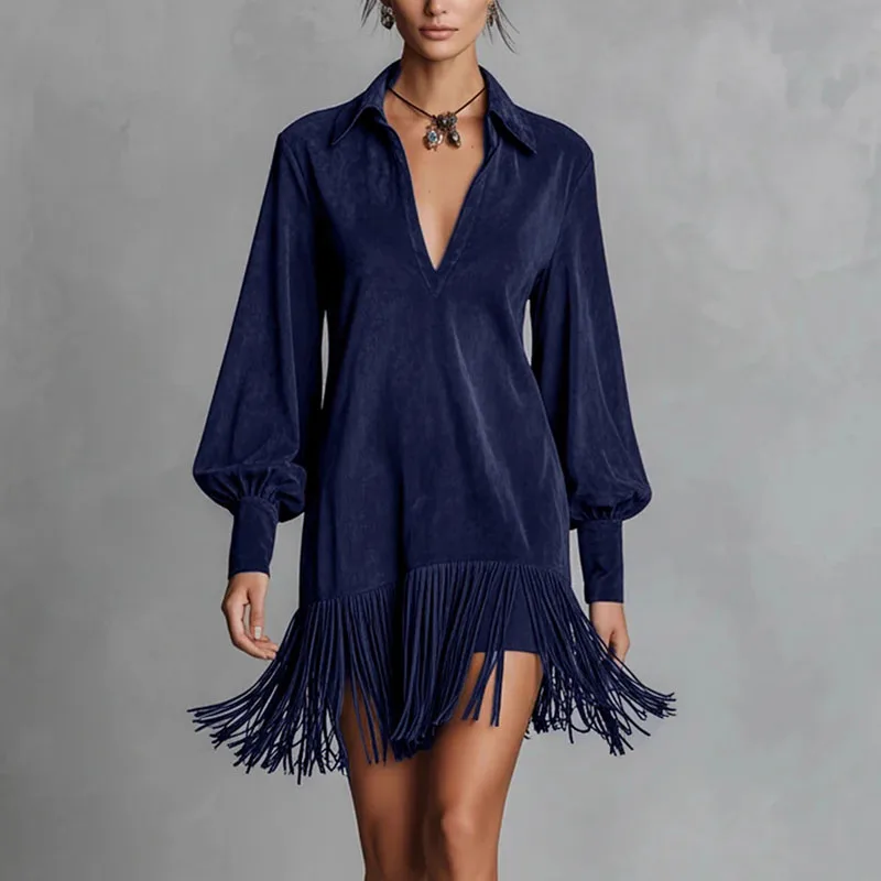 Spring Retro Solid Imitation Suede Tassel Dress Woman Sexy Lapel Hollow A-Line Mini Dress Autumn Long Sleeve Elegant Party Dress