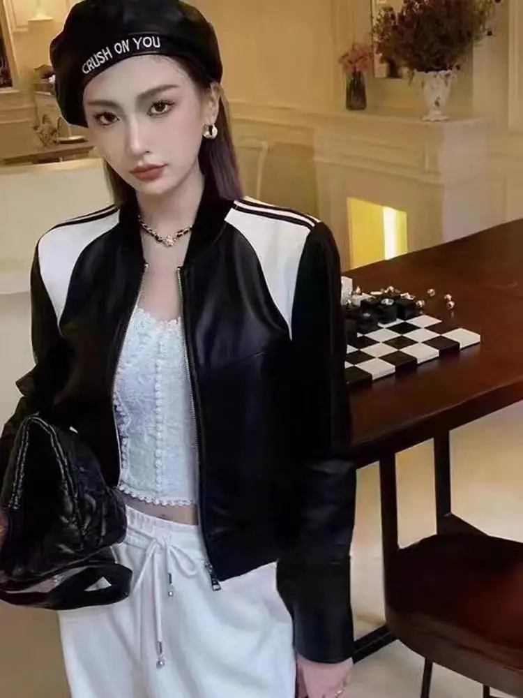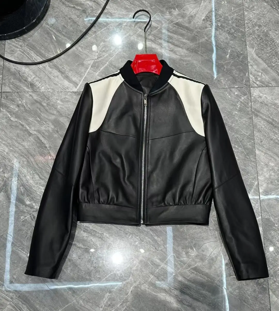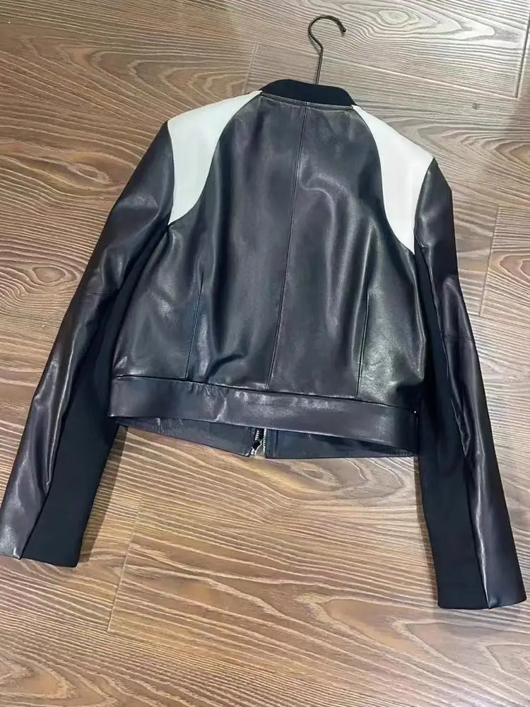 European Goods 2023 Spring New Stand Collar Black And White Stitching Baseball Uniform Sheepskin Genuine Leather Clothes Leather Jacket Short Coat For Women