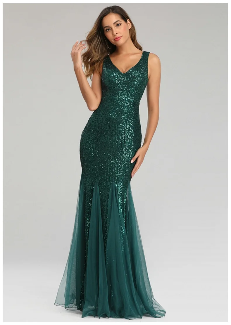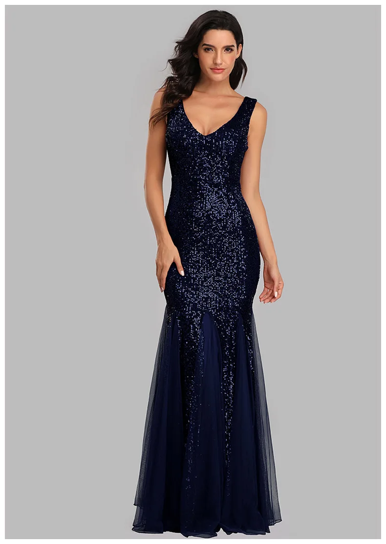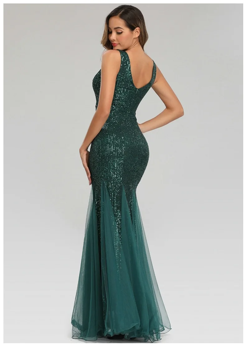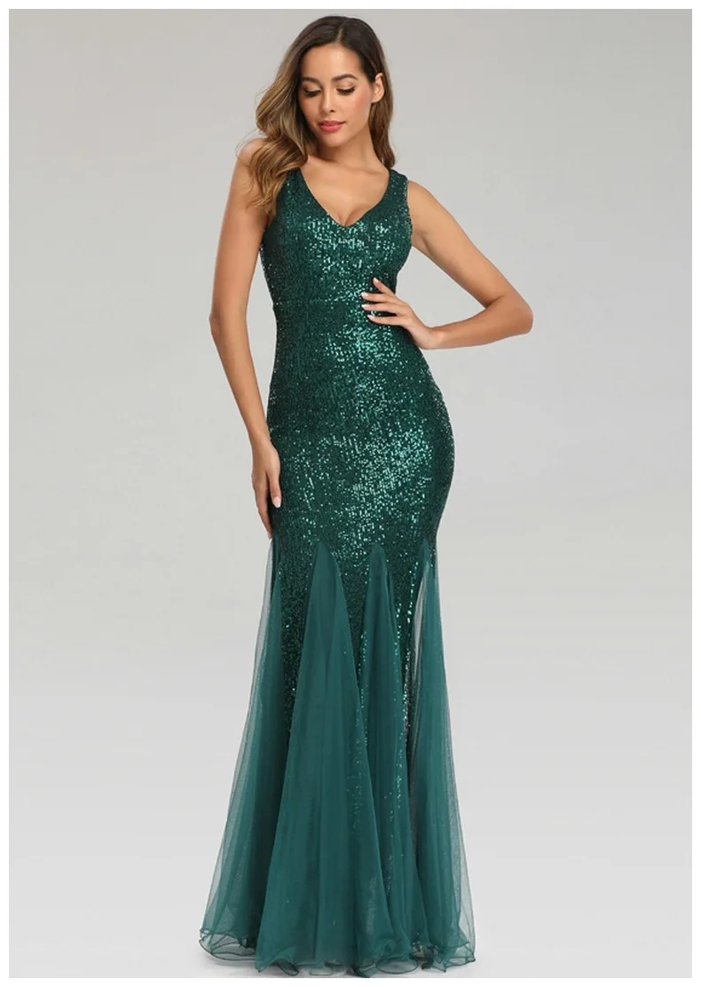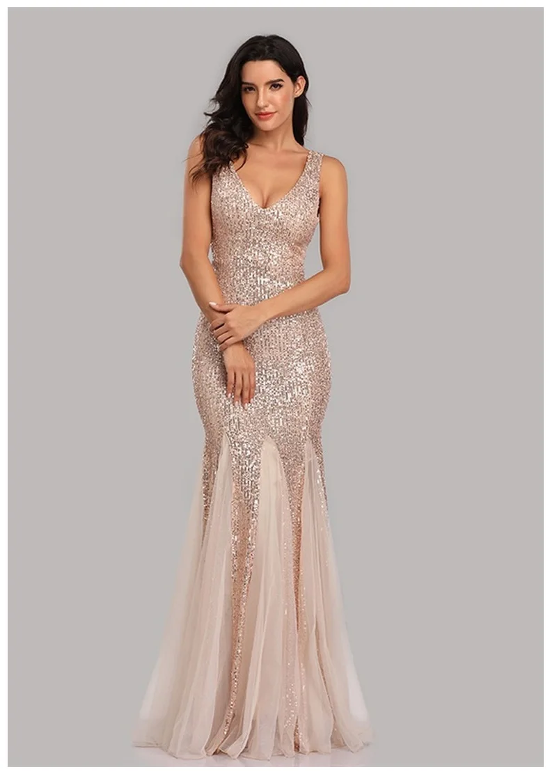 Stitching Mesh V-neck Sleeveless Hot Selling Bridesmaid Maxi Evening Women Party Sequin Prom Dresses 2024