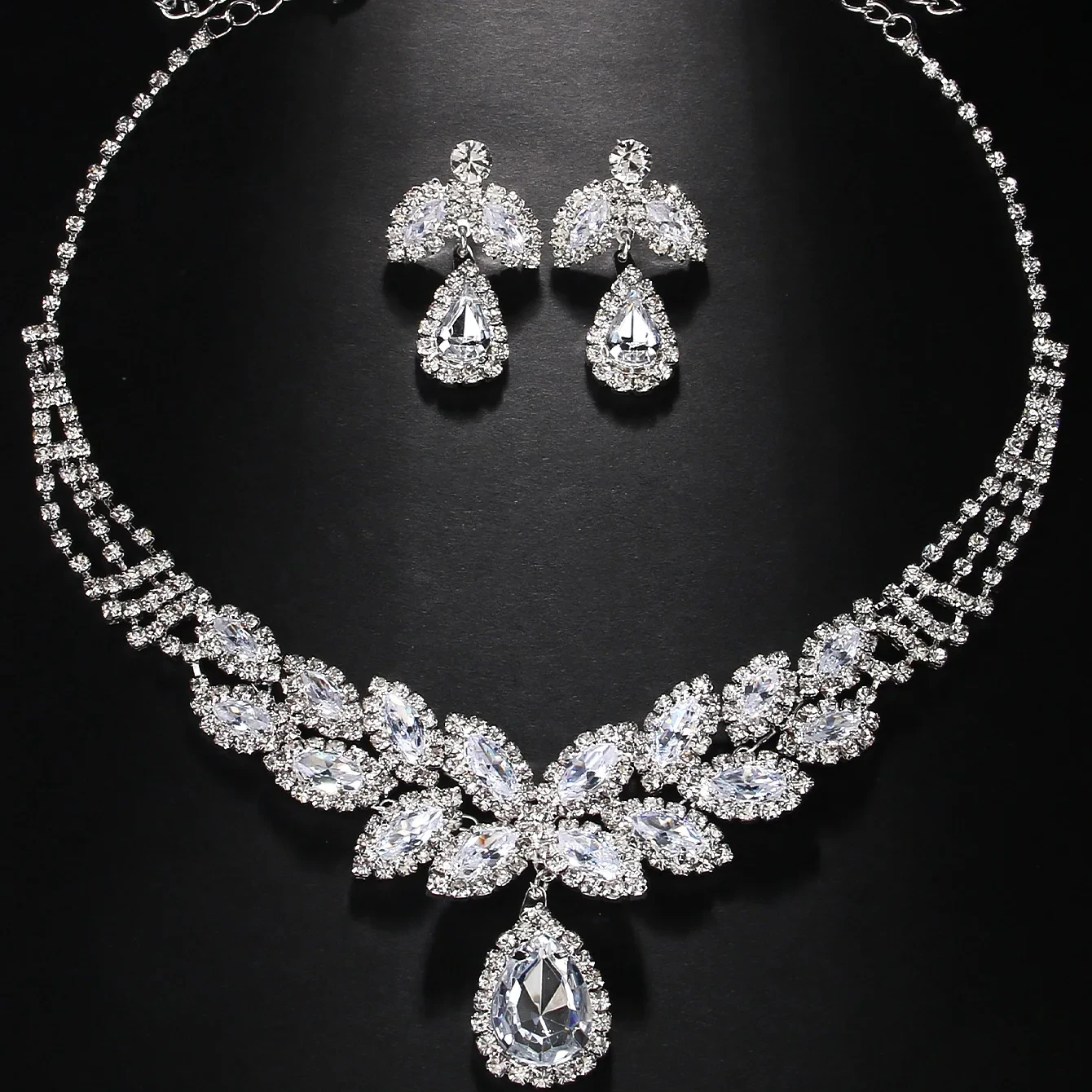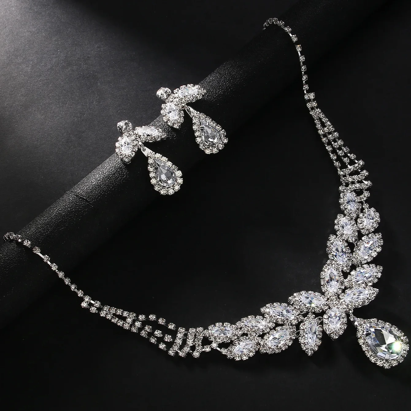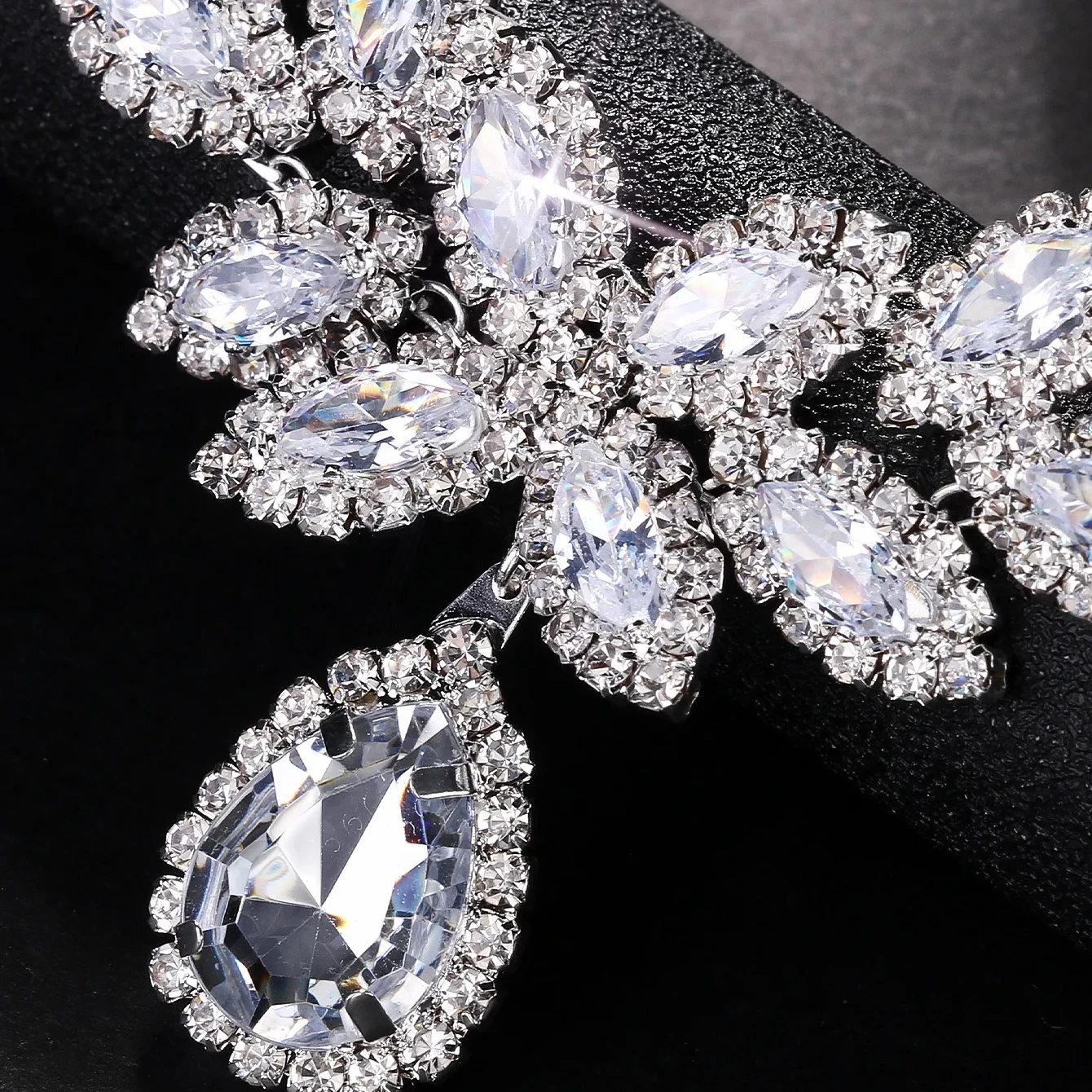 StoneFans Fashion Drop Rhinestone Necklace Earrings Set for Women Wedding Flower Jewelry Set High Quality Wholesale