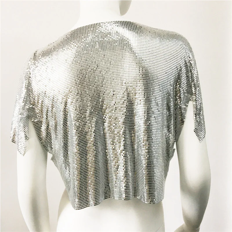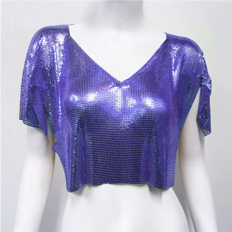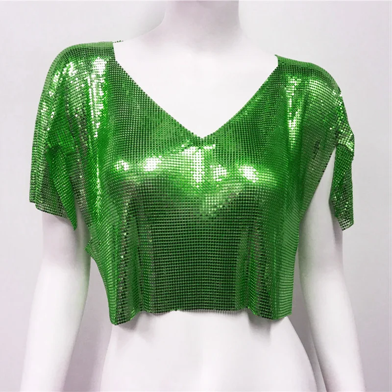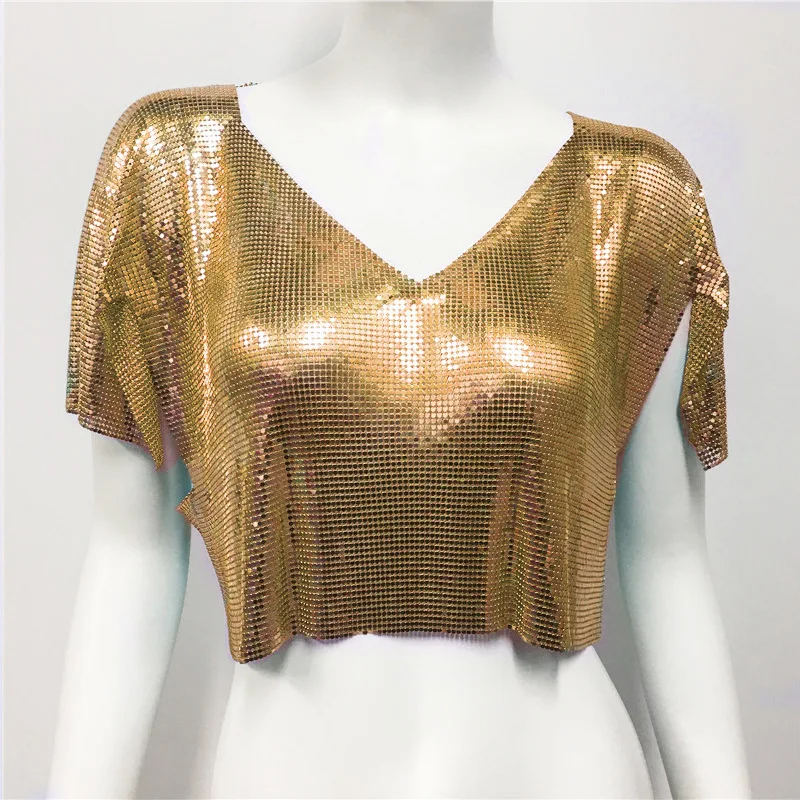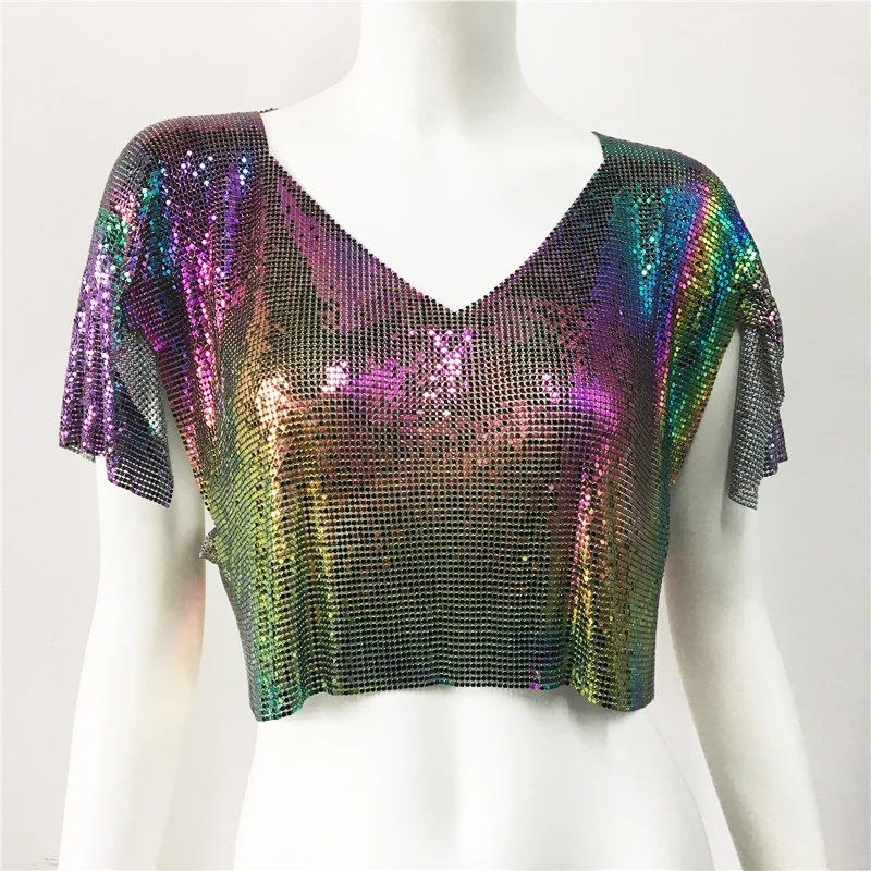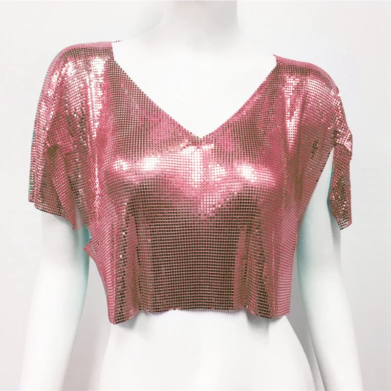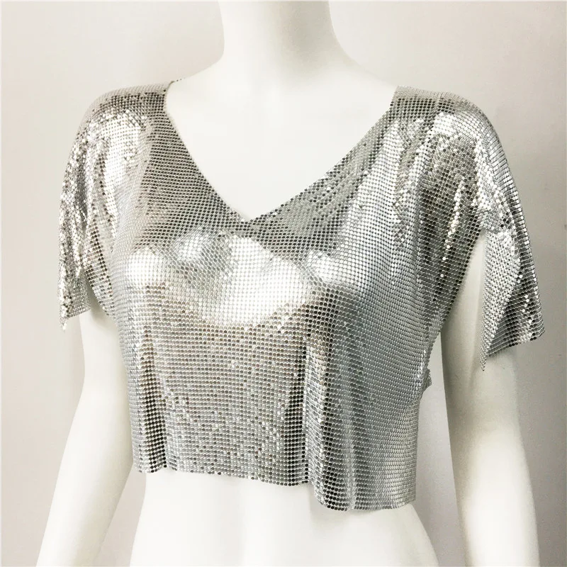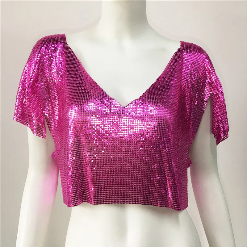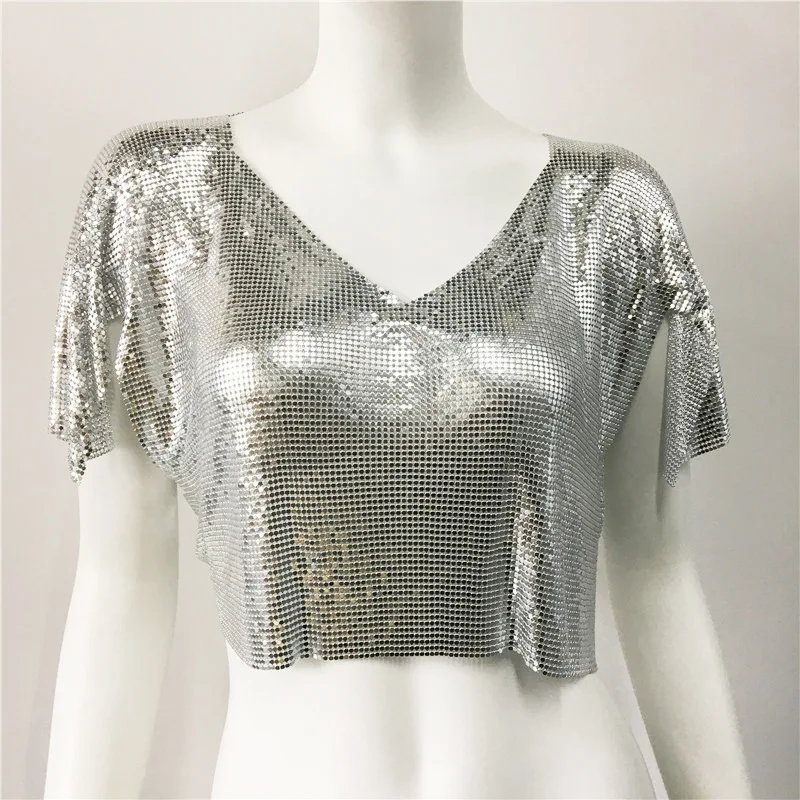 Streetwear fashion summer lady luxury sequin short sleeve crop top tshirt V neck metal club sexy women's t-shirts