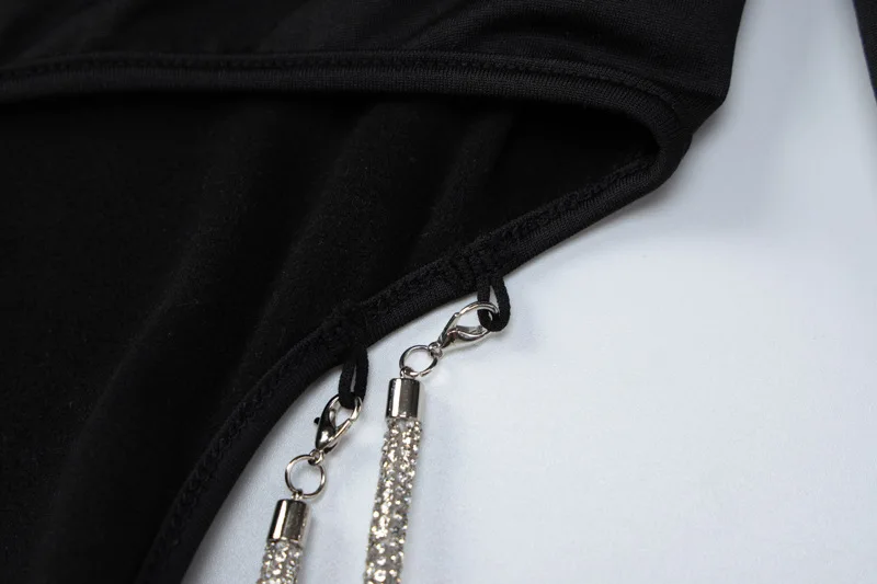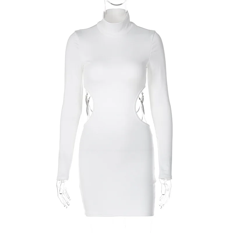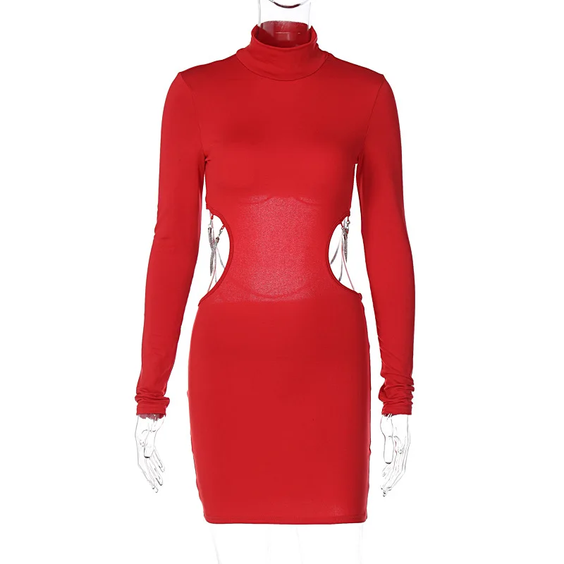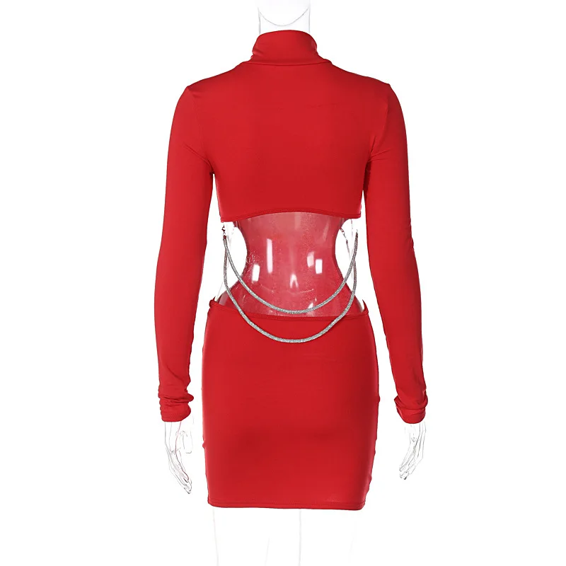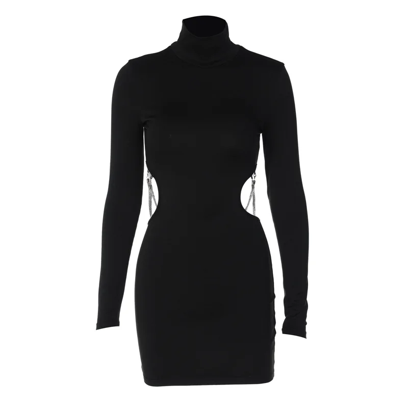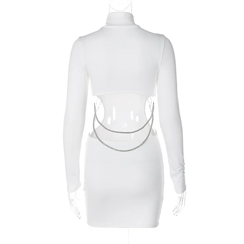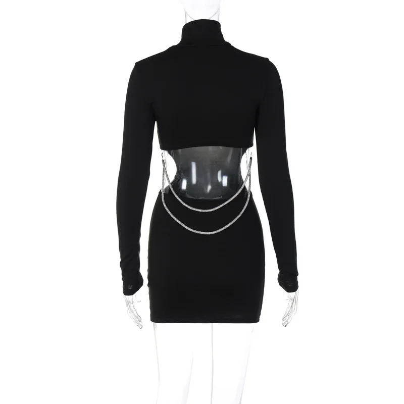 Streetwear high neck sexy tight mini club party dress with rhinestone chain bodycon backless women winter dresses long sleeve