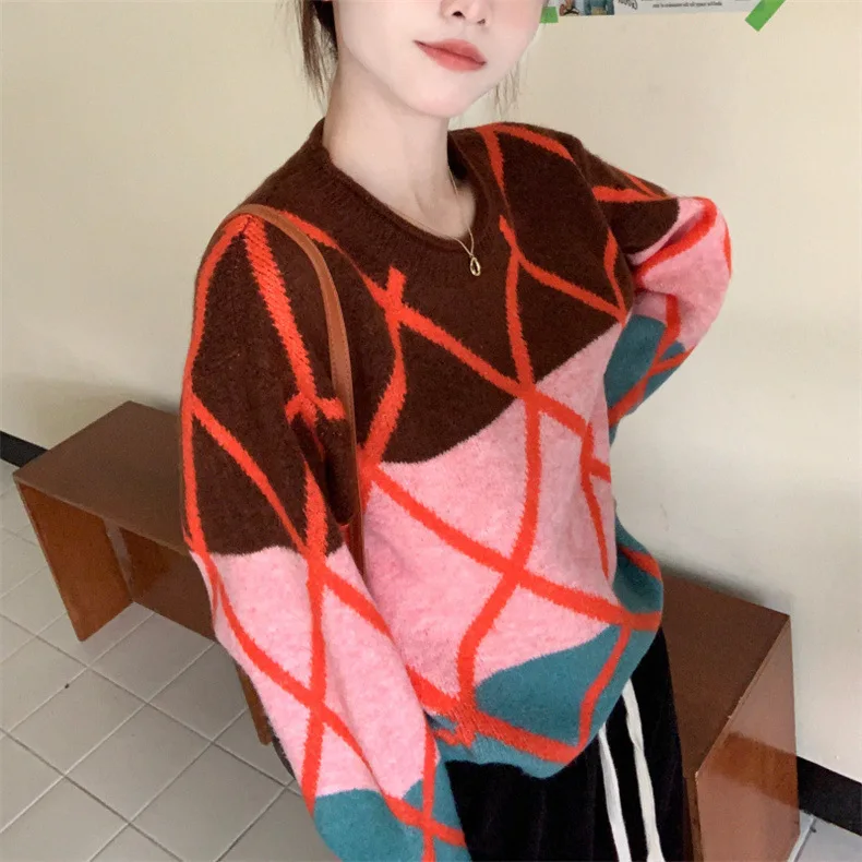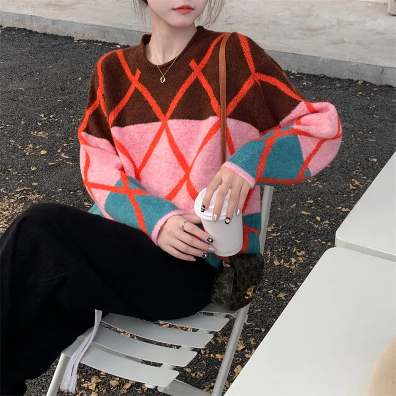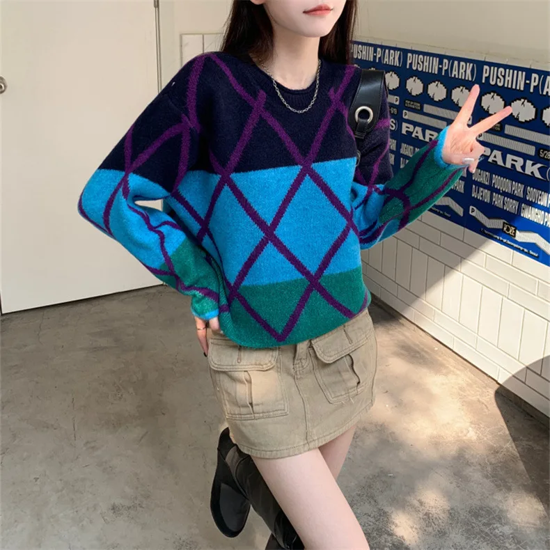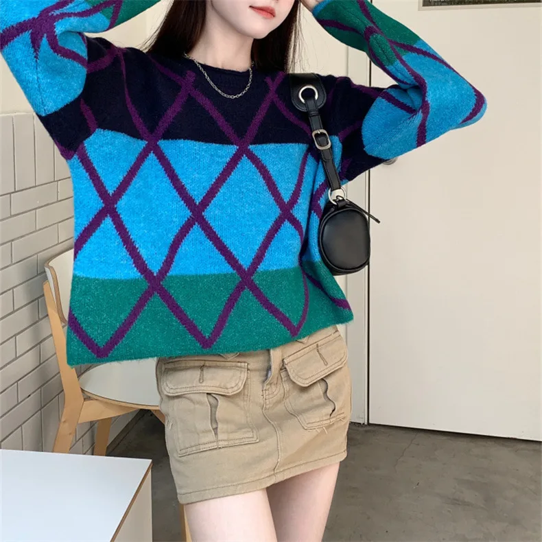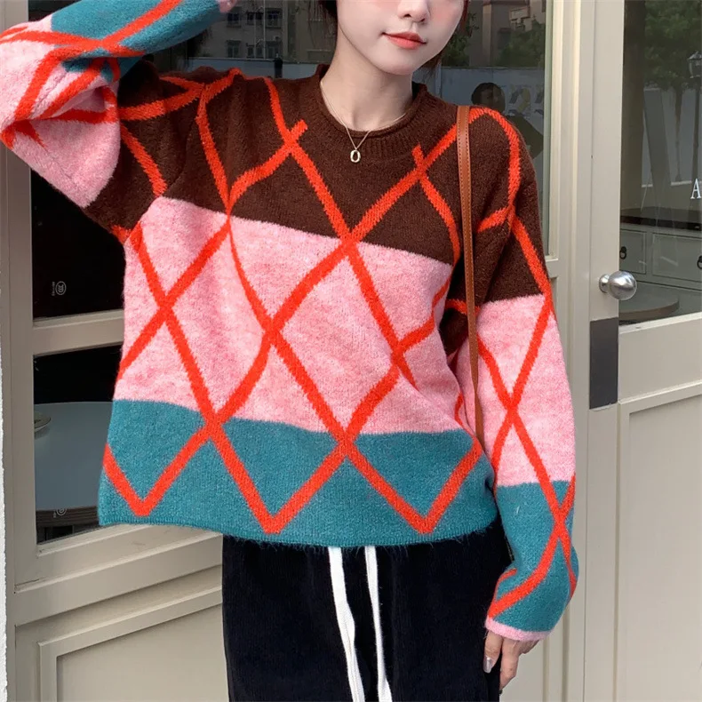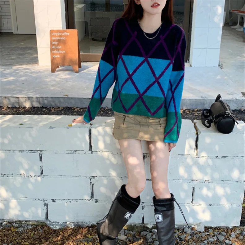 Streetwear New Fashion Lady Casual Pullover Bright Color Blocking Patchwork Fall Winter Knitted Short Sweater Women's Sweaters