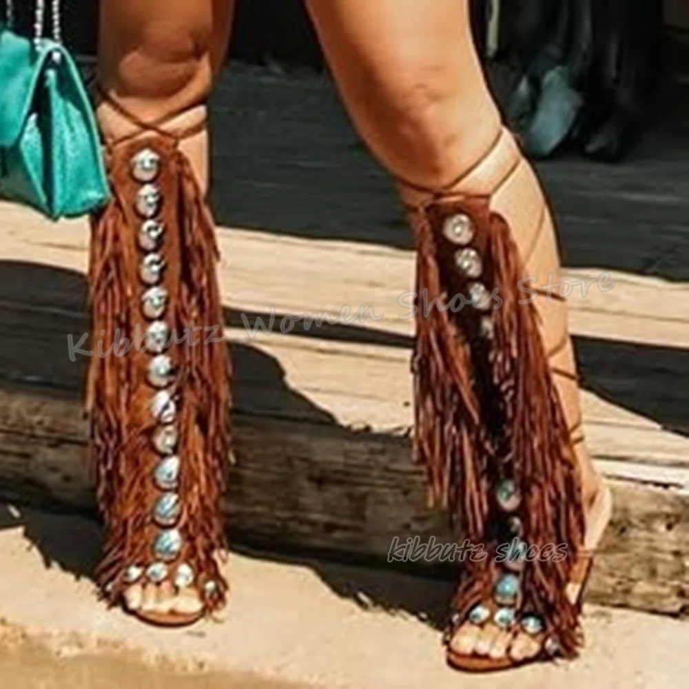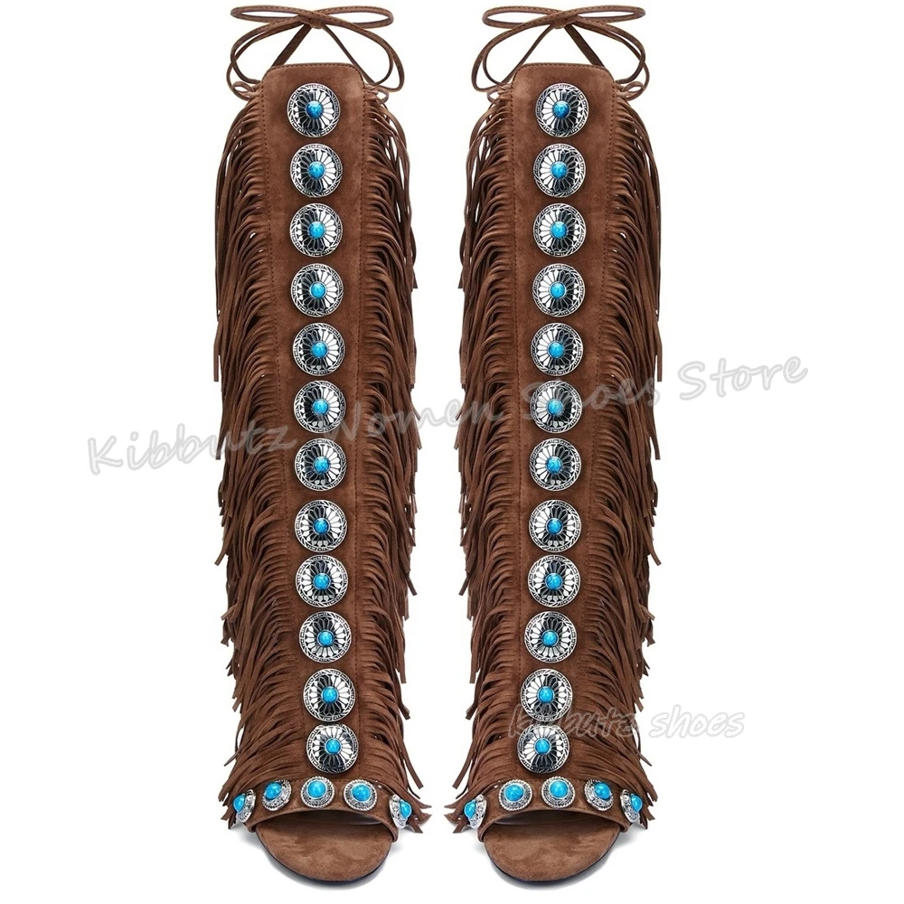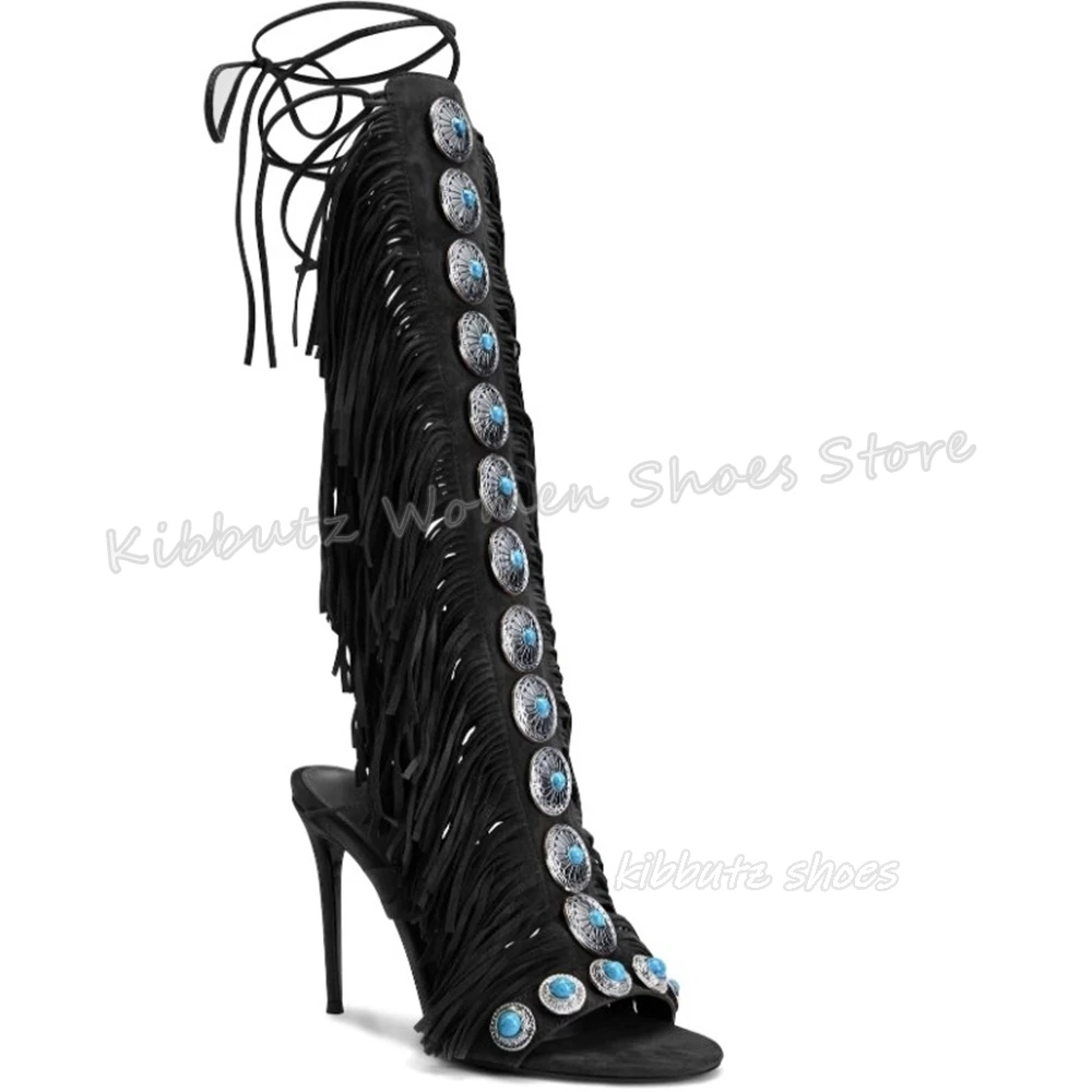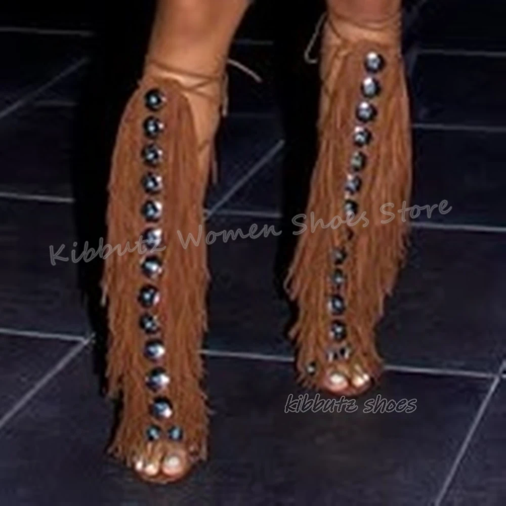 Suede Tassels Sandals Knee High Boots Crystal Glossy Solid Color Cross Strap Fashion Luxury Elegant Concise Women Shoes Newest
