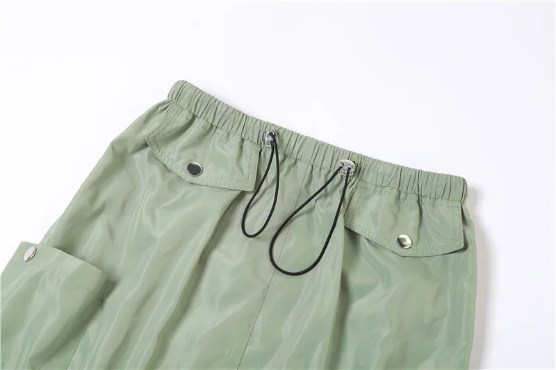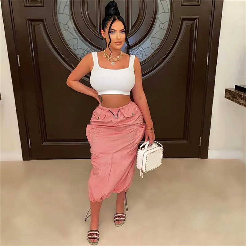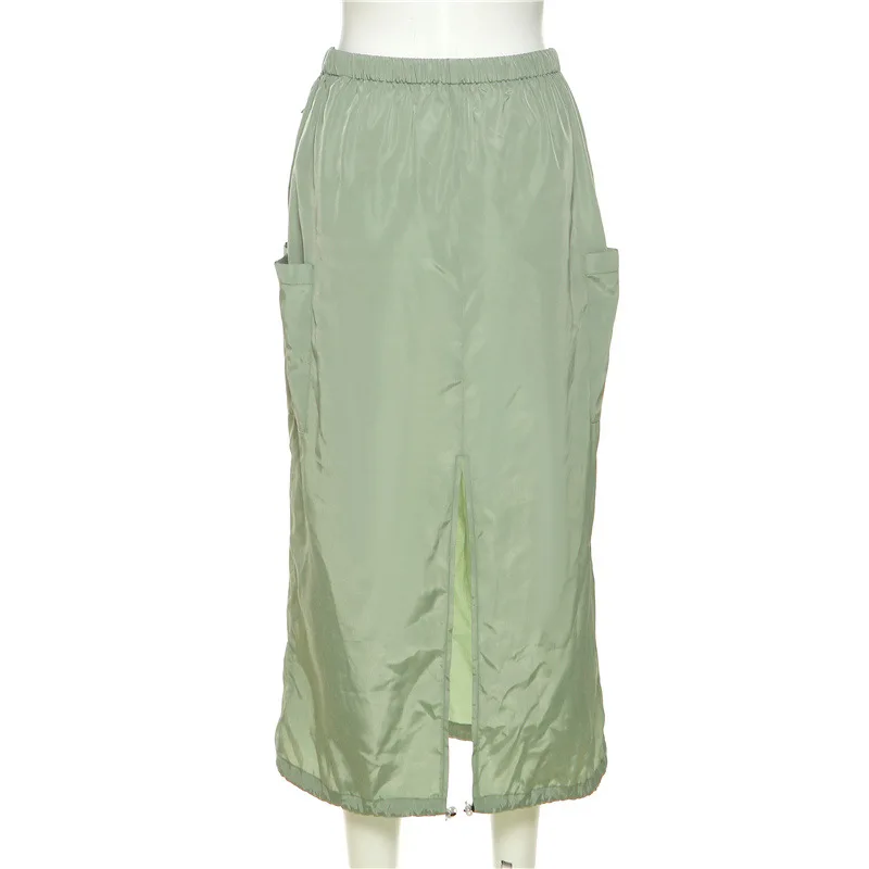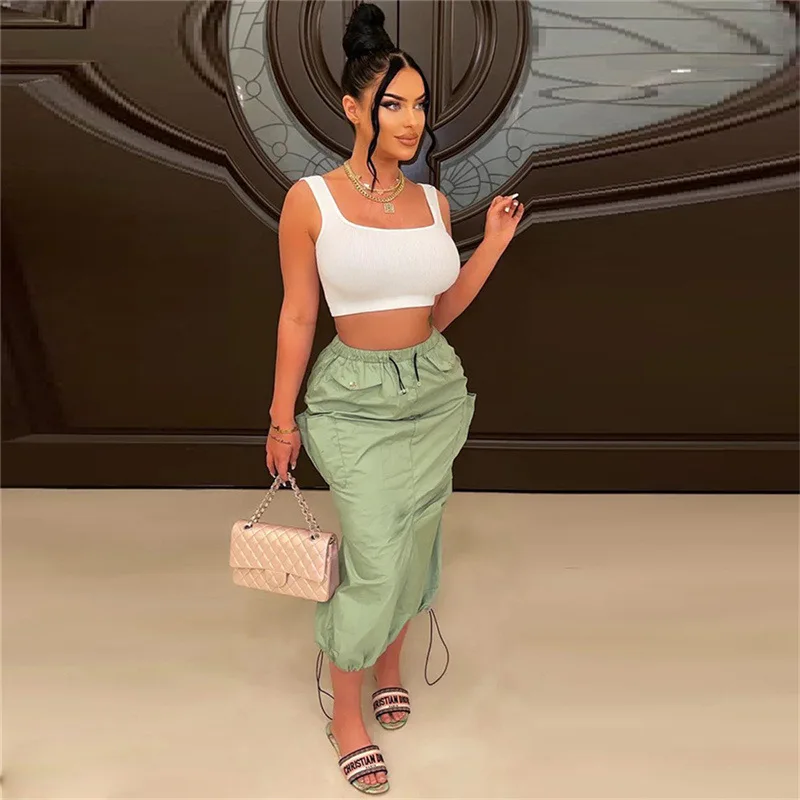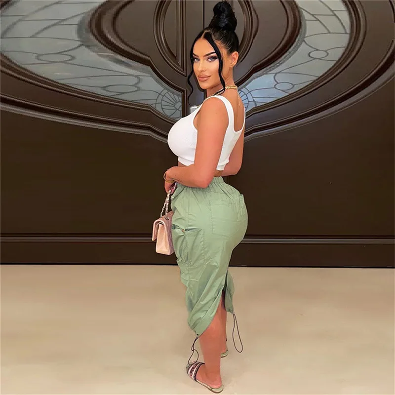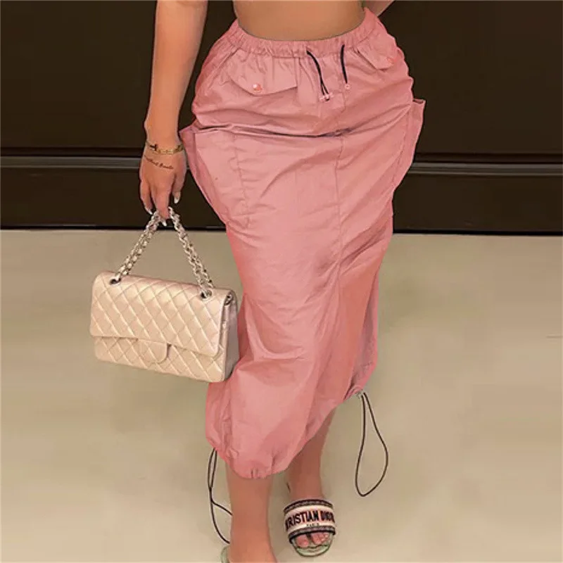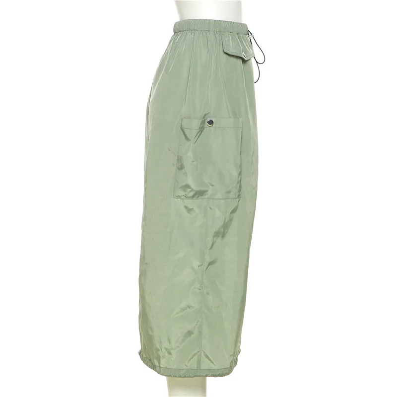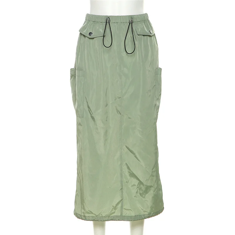 Summer 2023 Casual Fashion High Waist Drawstring Big Pocket Long Skirt Camo Cargo Skirt