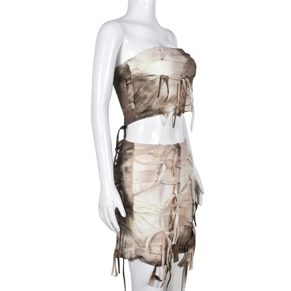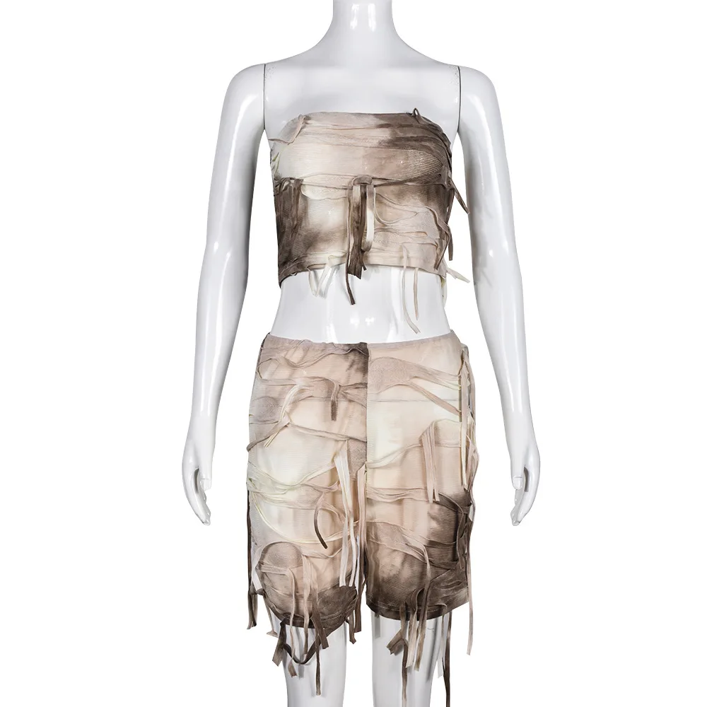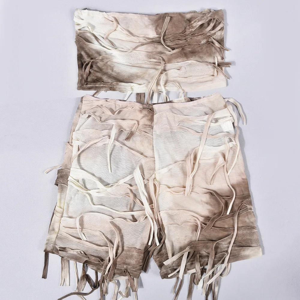 Summer 2023 women clothes New Tie Dye Sexy Spicy Girl Wrapped Chest Tassel Shorts Set Two piece set Casual for Women