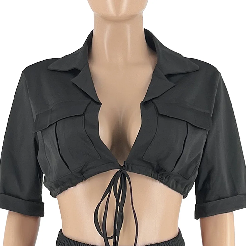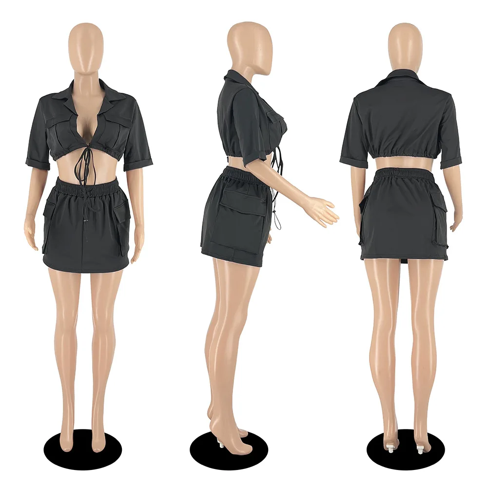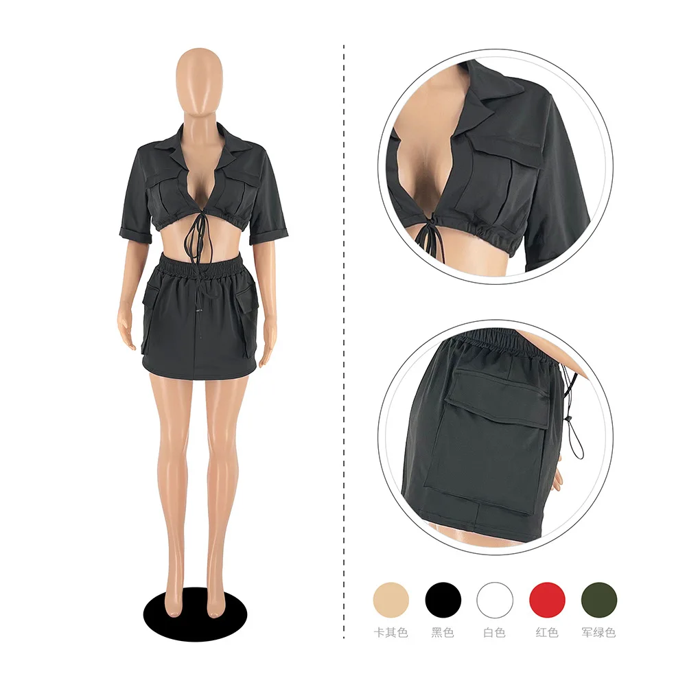 Summer 2023 women clothes stylish two piece set in solid colors Set Short Sleeve Pocket Front Shirt Pocket Side Shorts Suit