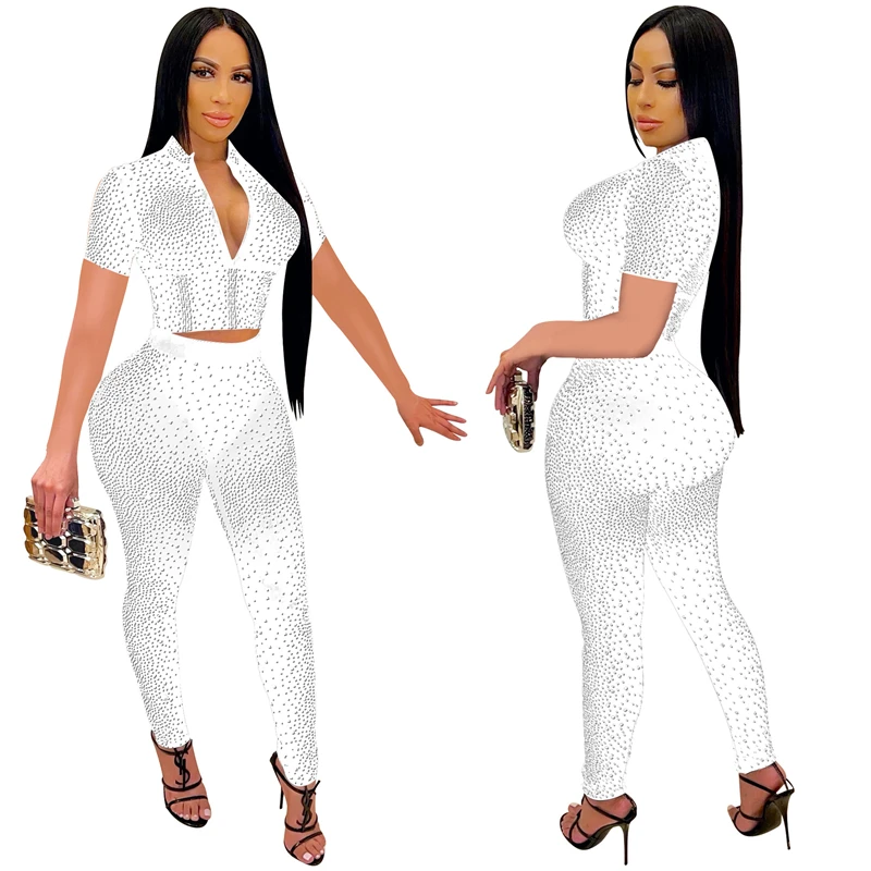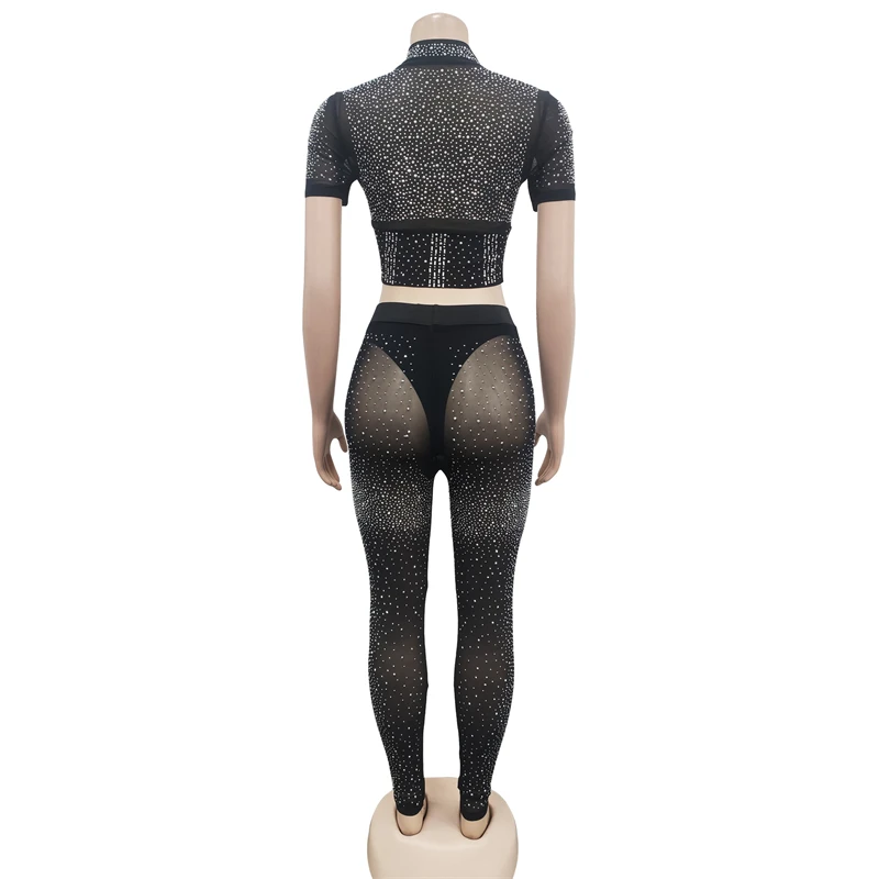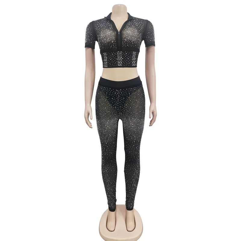 summer 2023 women sexy stretch shining rhinestone crystal mesh fabric two 2 piece crop top pants leggings set clothes applique