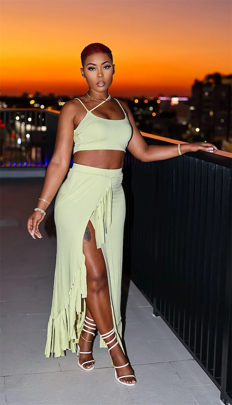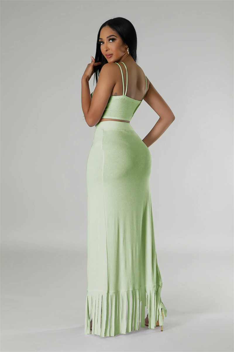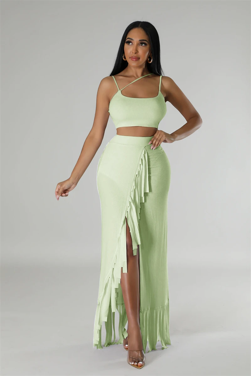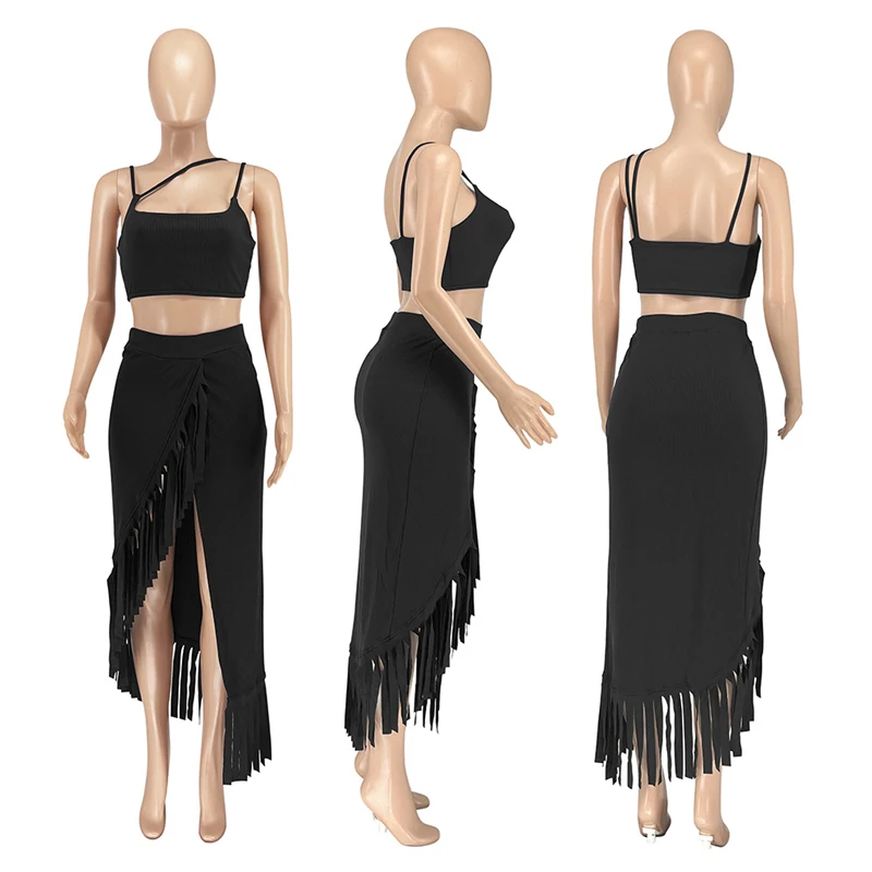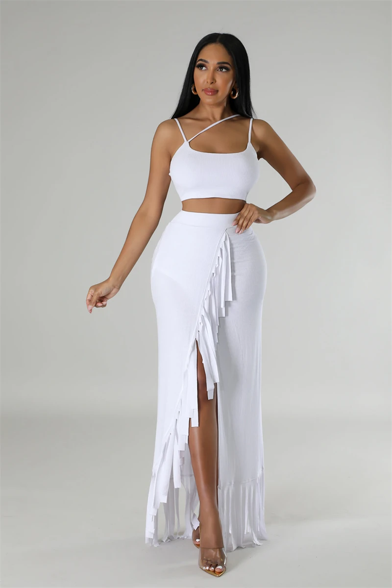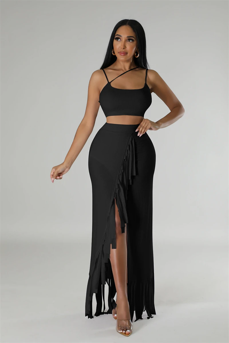 summer 2024 hot sale women luxury fashion new launch fringe tassel high slit skirt and tank top two 2 piece set outfit for women