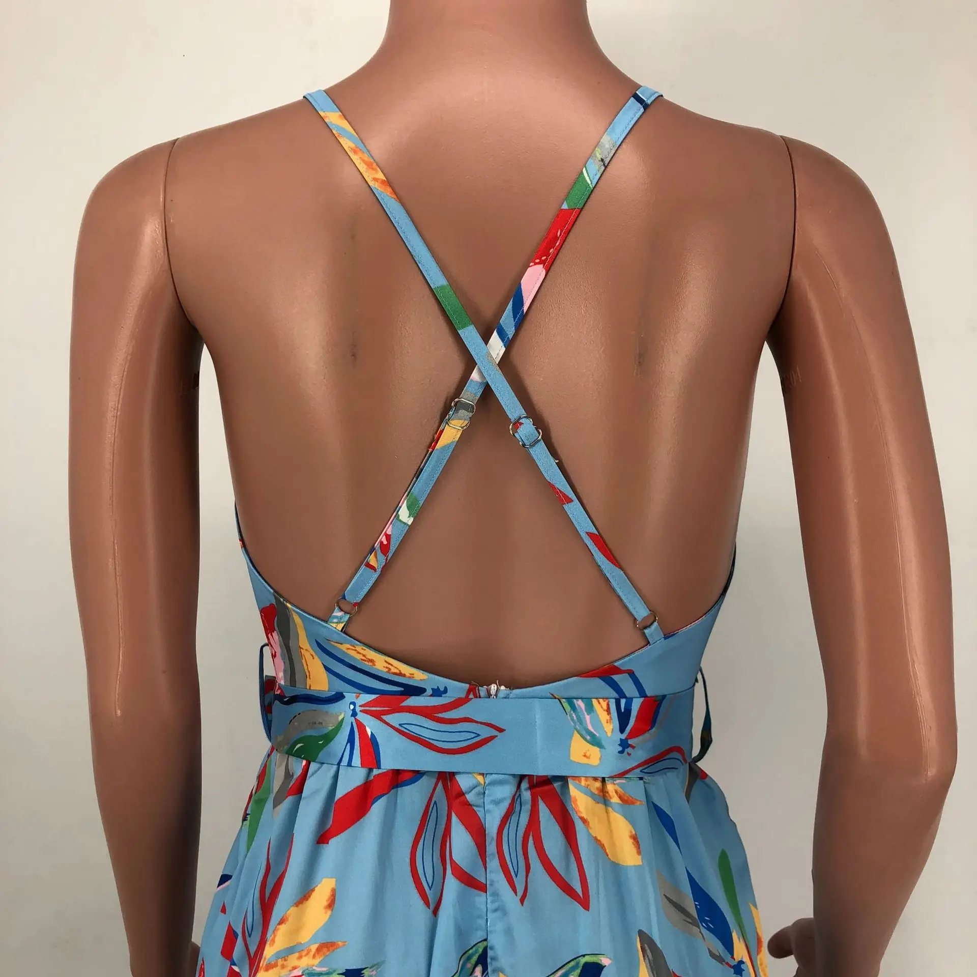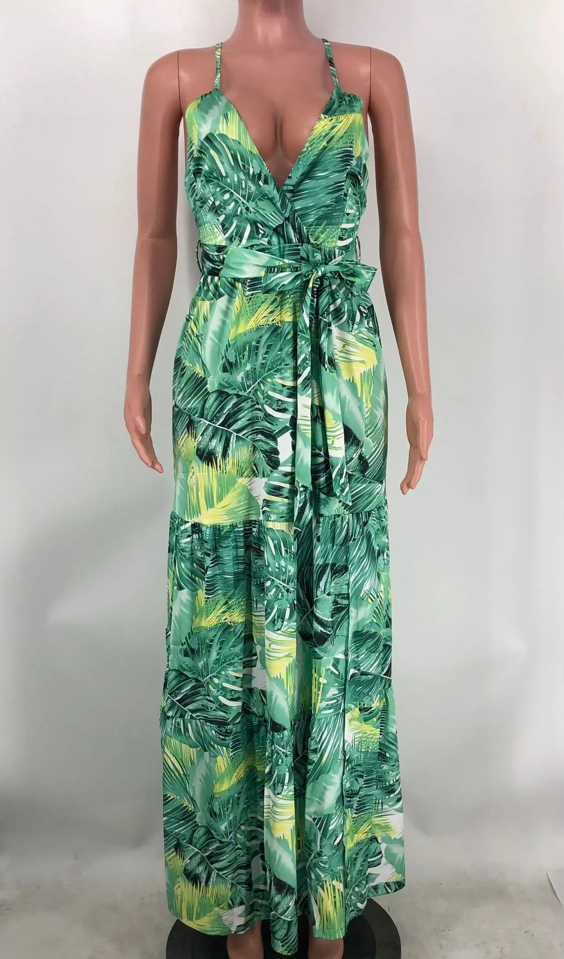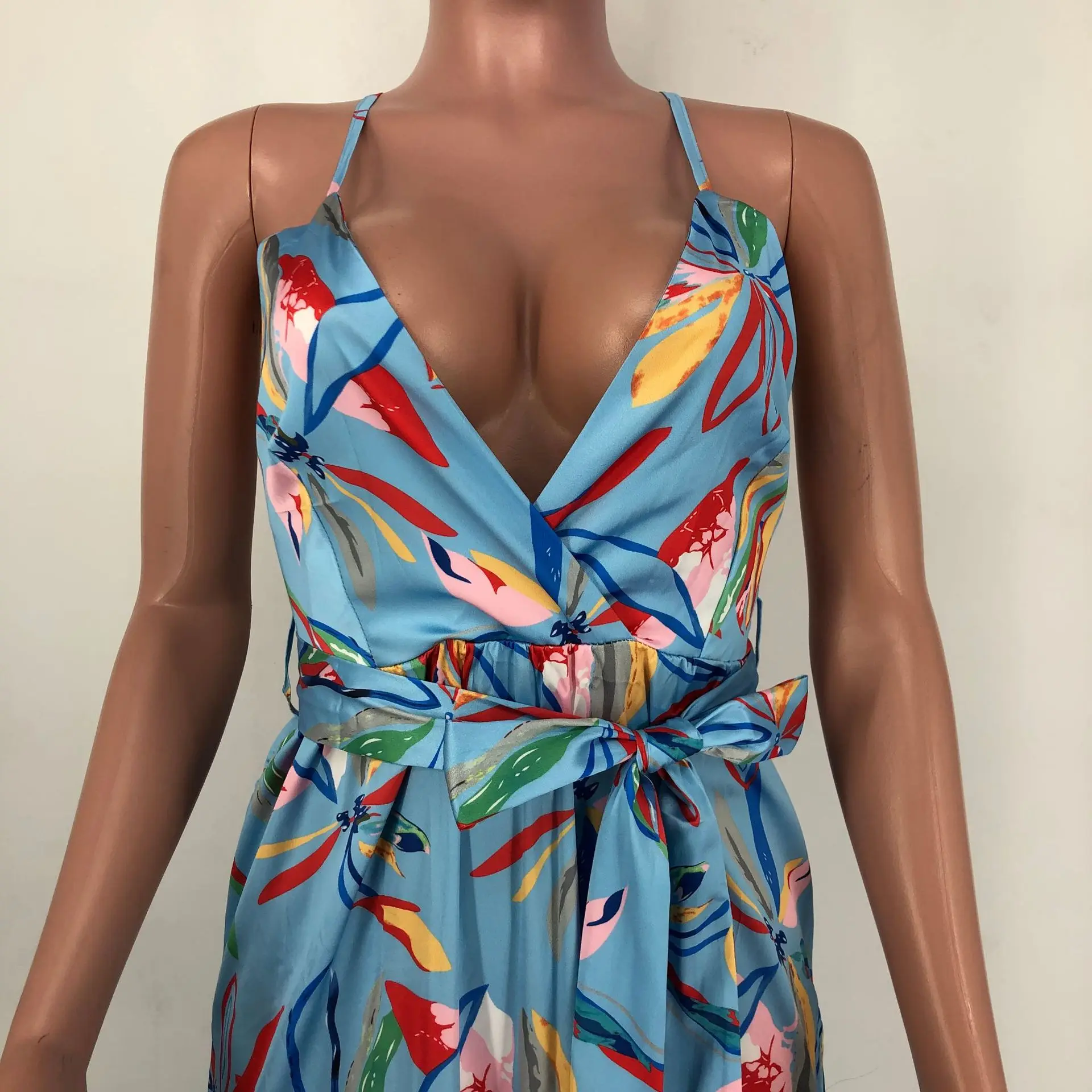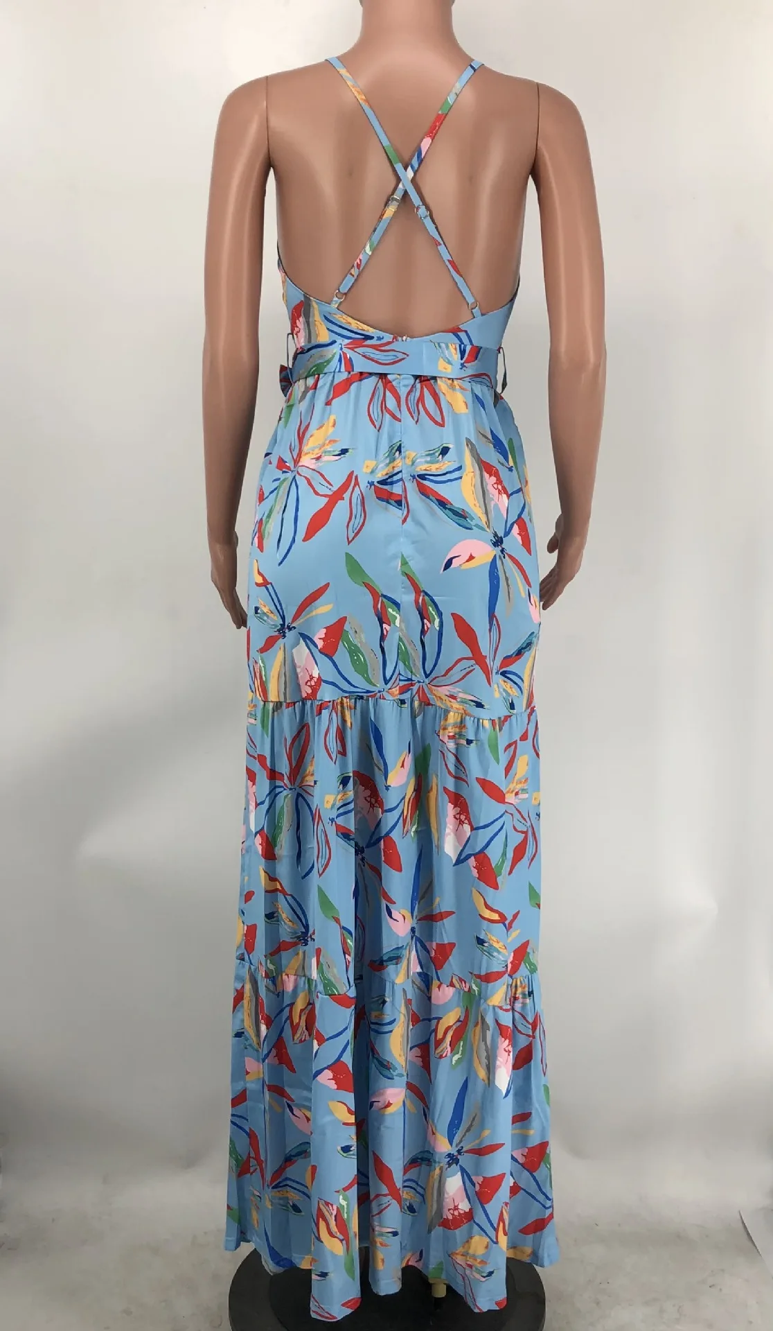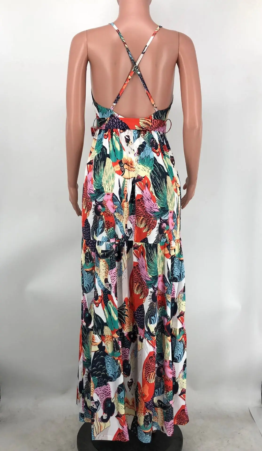 Summer Beach Printed Lady Elegant Sleeveless Long Maxi Dress Women Sexy Deep V Neck Backless Casual Party Dresses Women