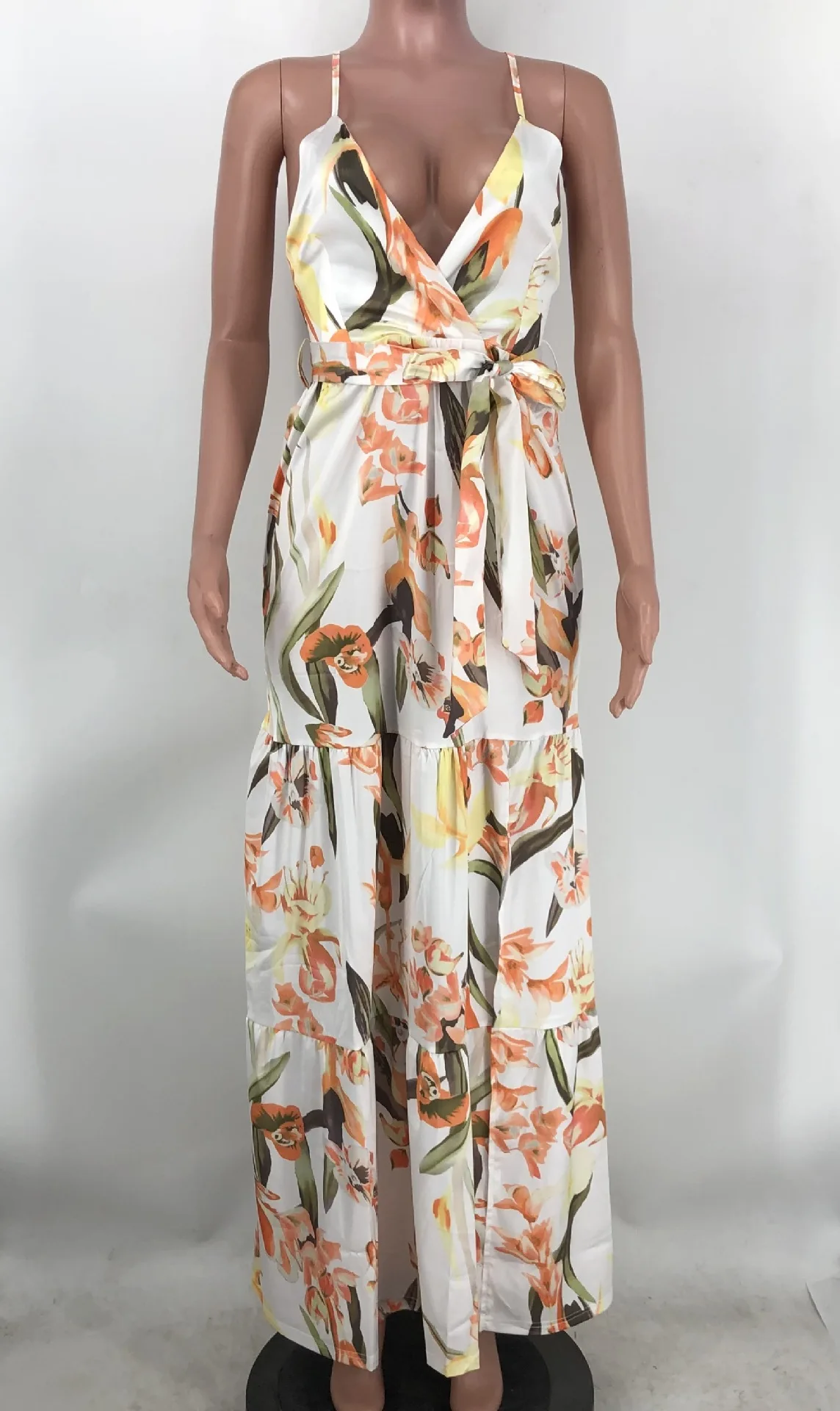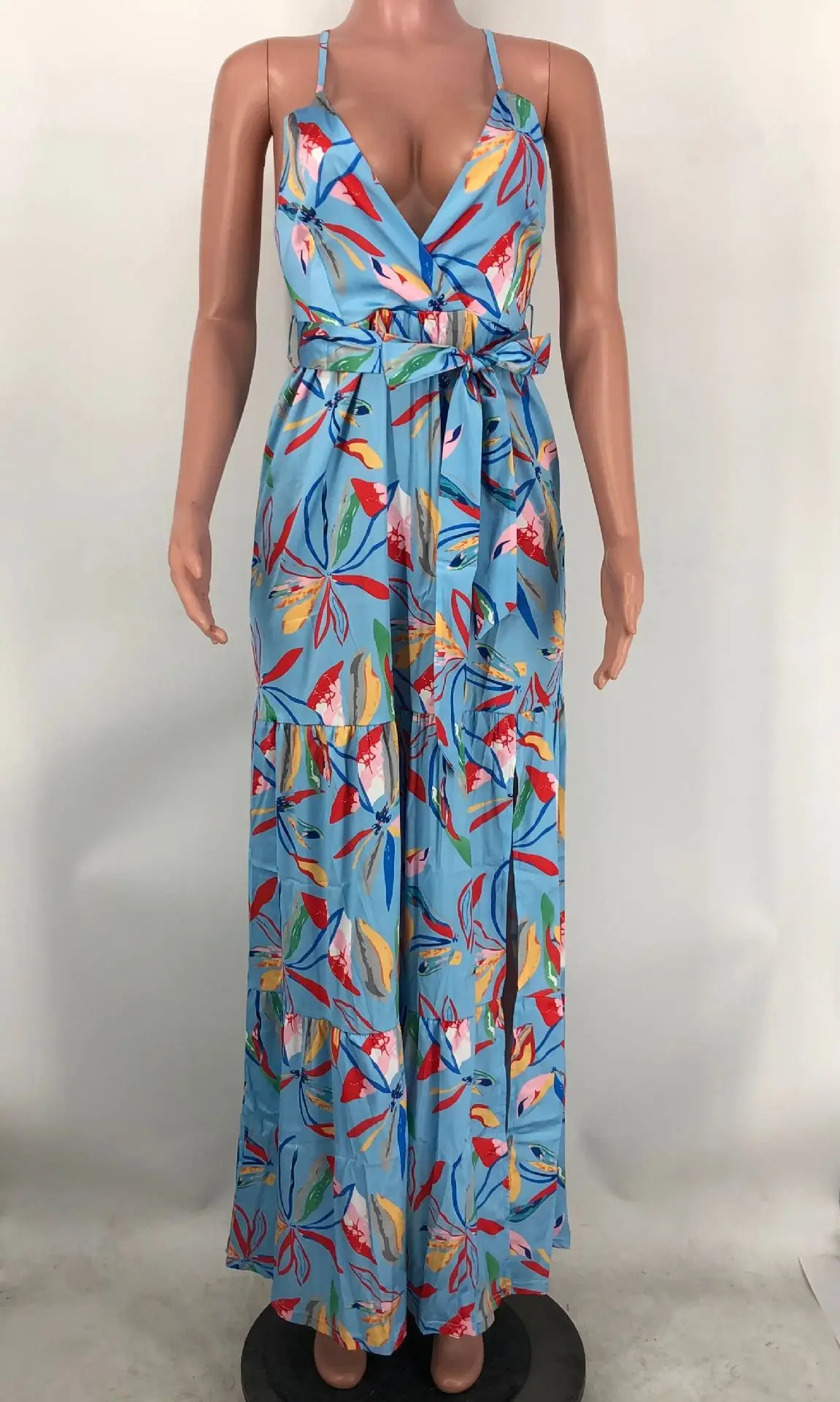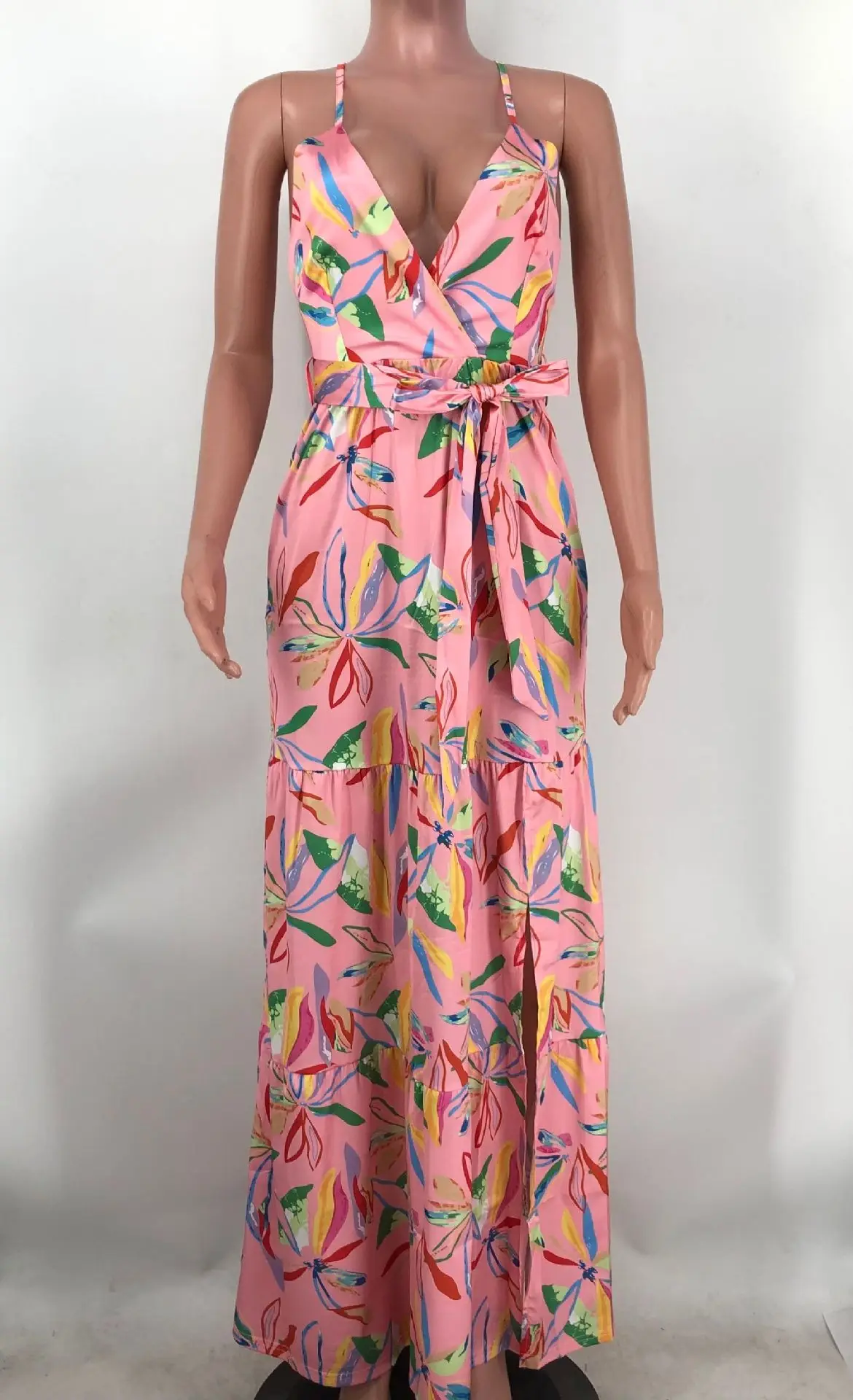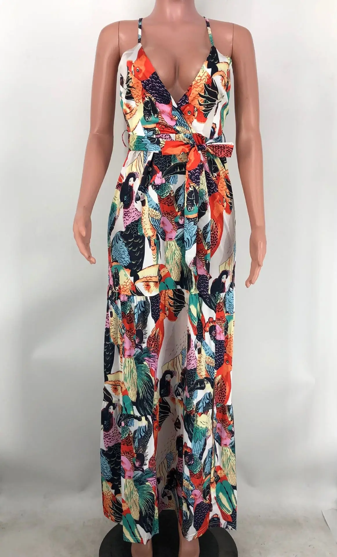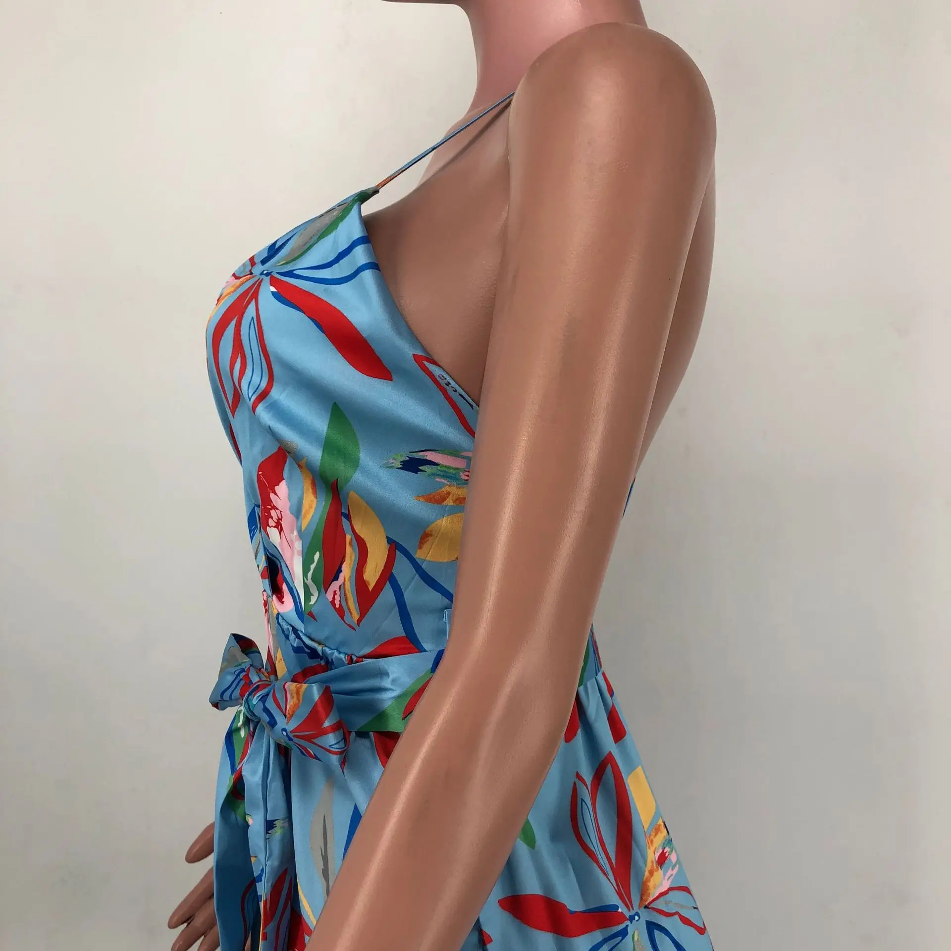 Summer Beach Printed Lady Elegant Sleeveless Long Maxi Dress Women Sexy Deep V Neck Backless Casual Party Dresses Women