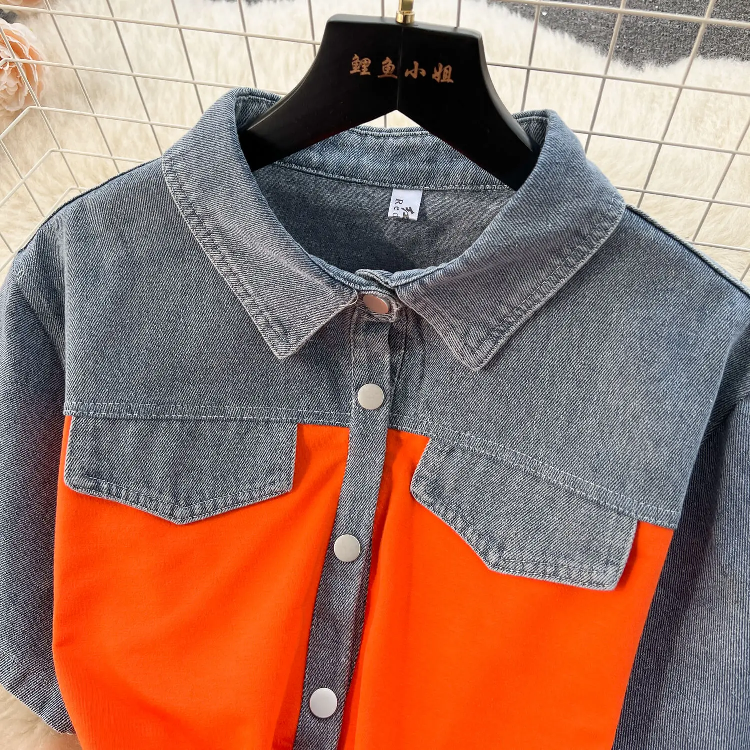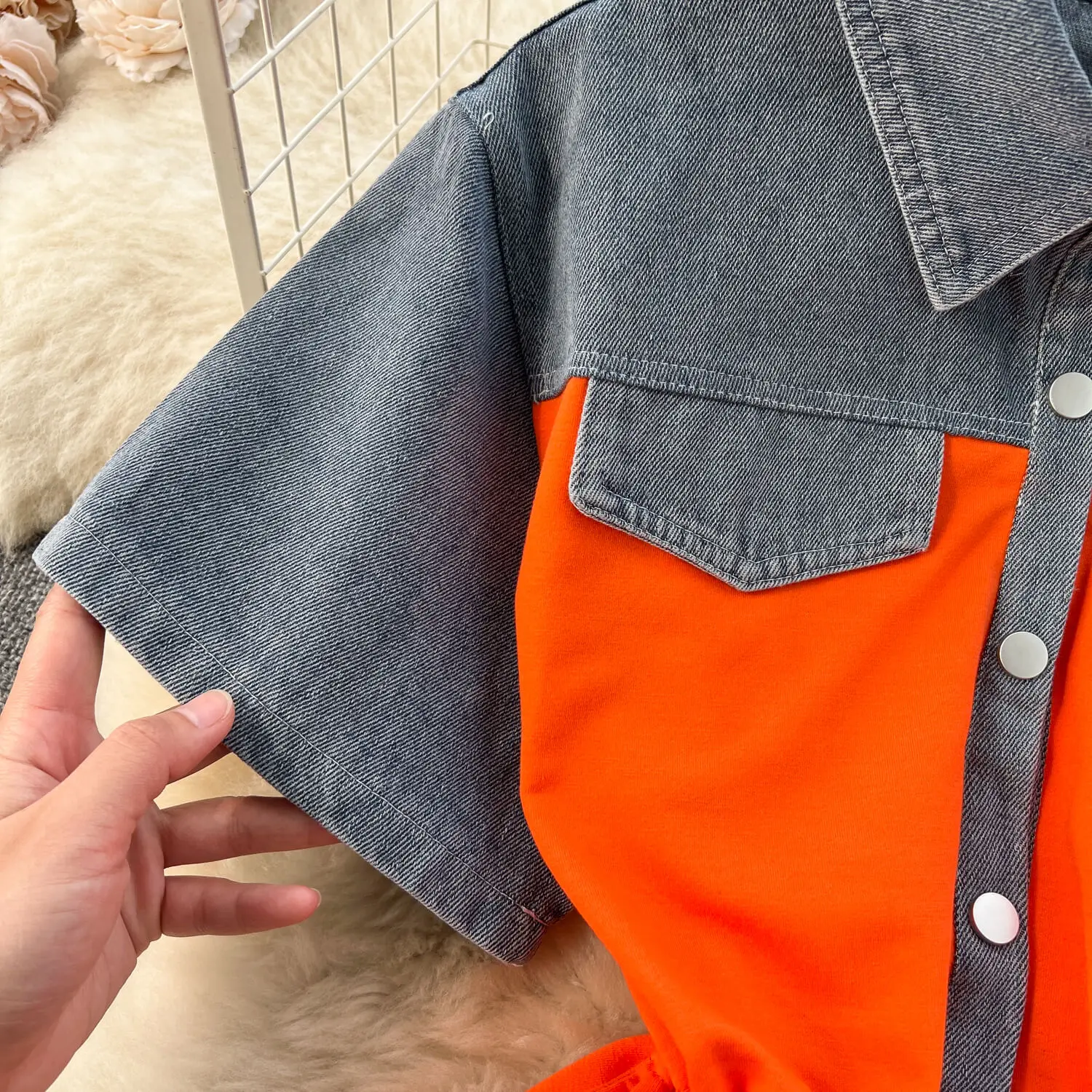 Summer Casual Polo Collar Midi Dress For Women Empire Patchwork Contrast Color Denim Fashion Dresses