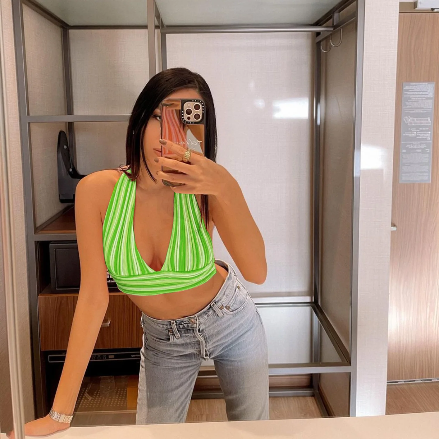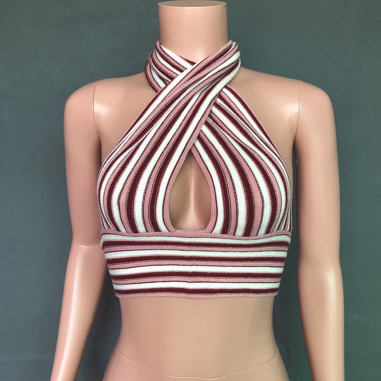 Summer Cropped length women's tank tops Backless Casual Sleeveless Halterneck Stripe Tops Women Sexy Crop Tank top
