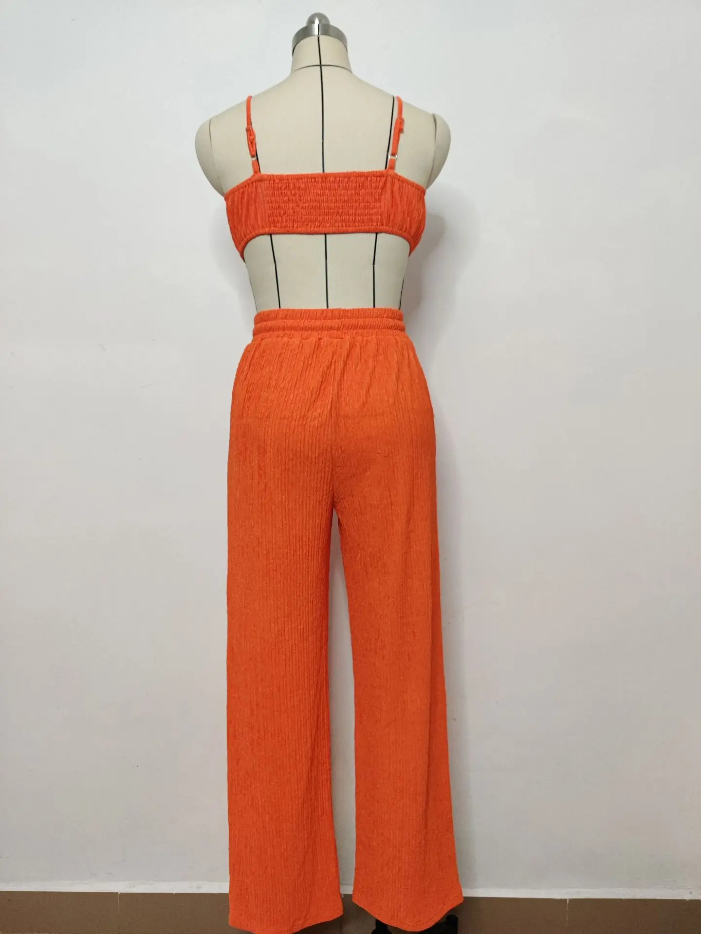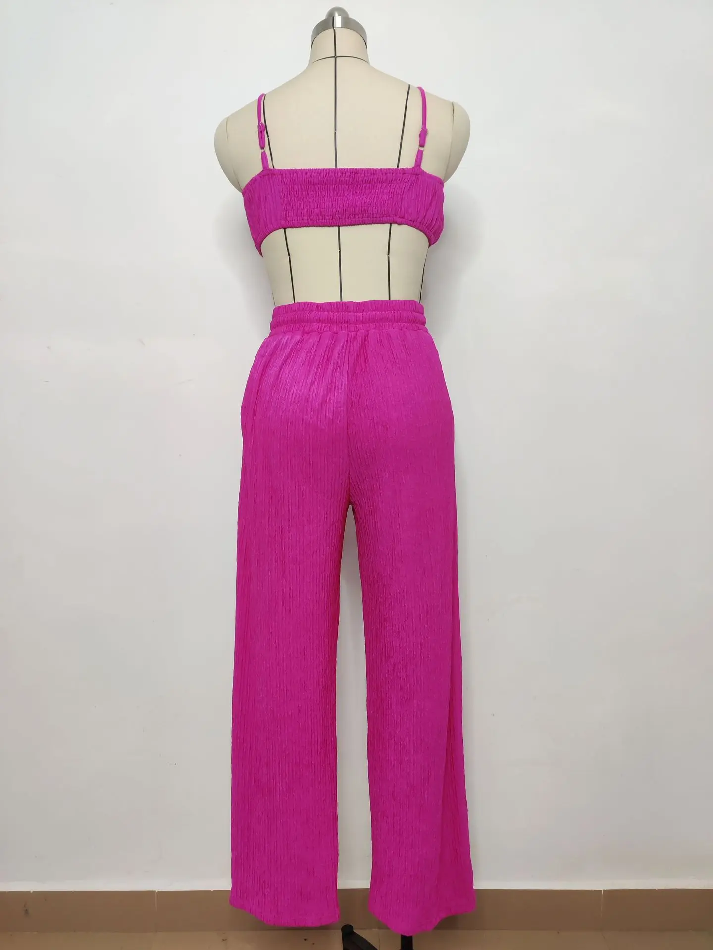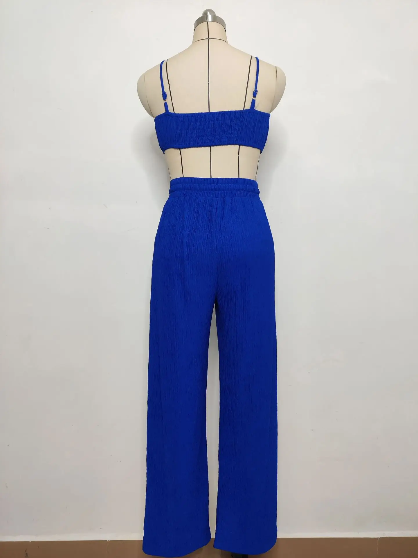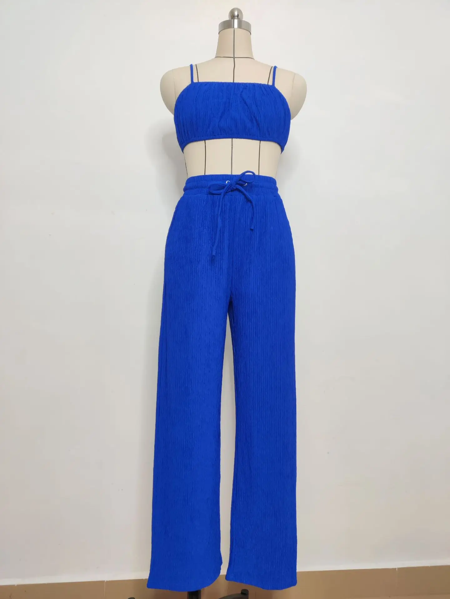 Summer Elegant Women Outfit Solid Sexy Pleated Halter Tops And Flared Trousers Plus Size 2 Piece Pants Set Women
