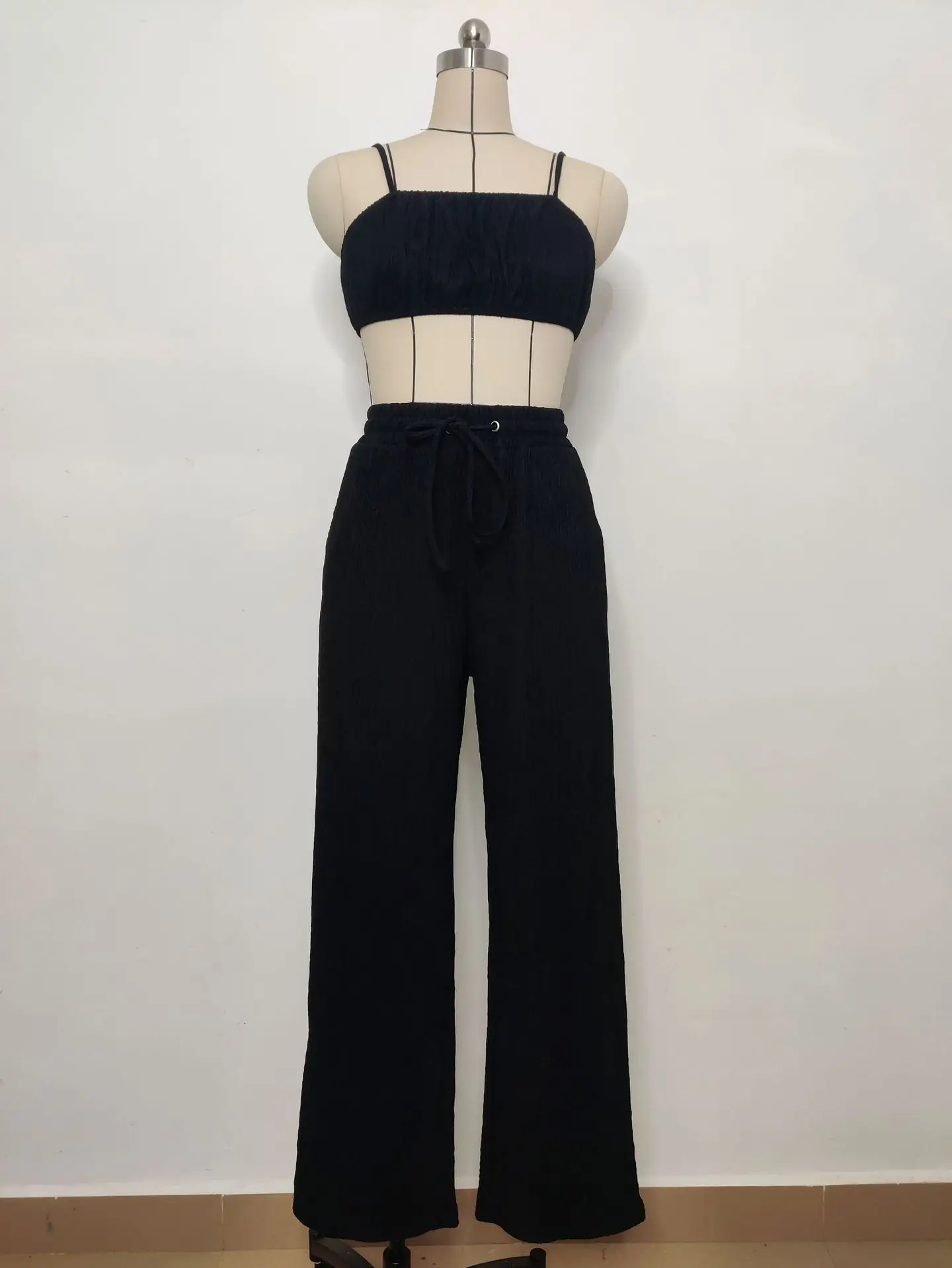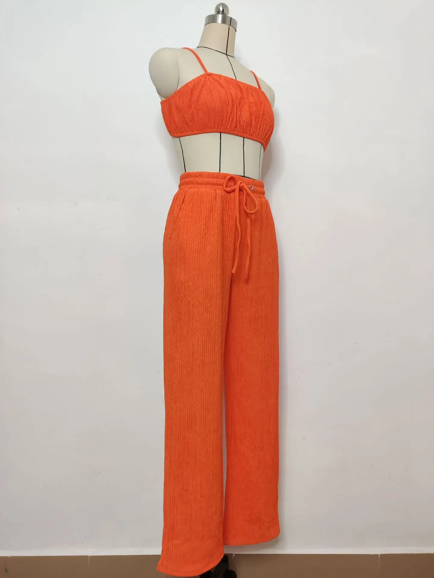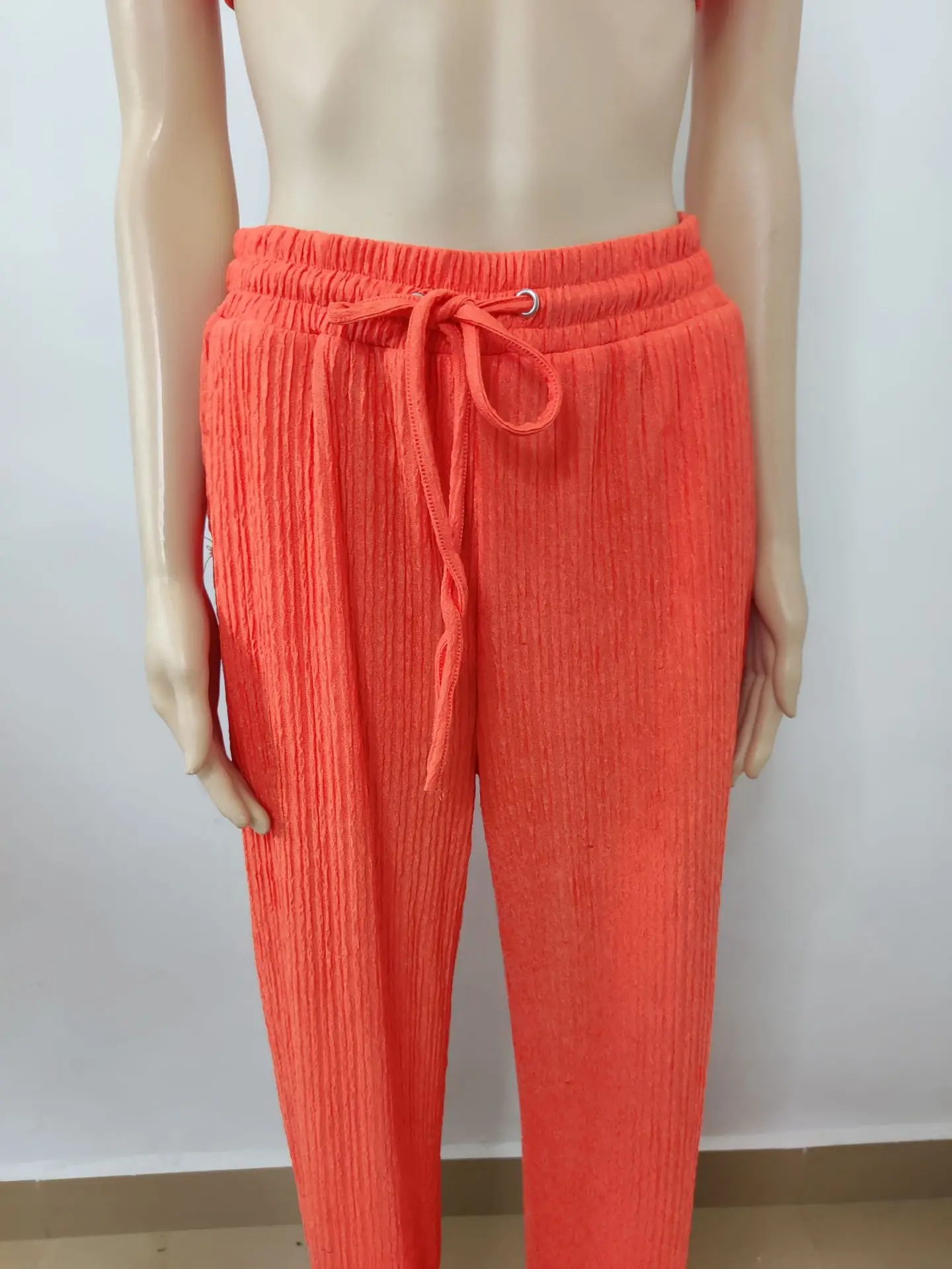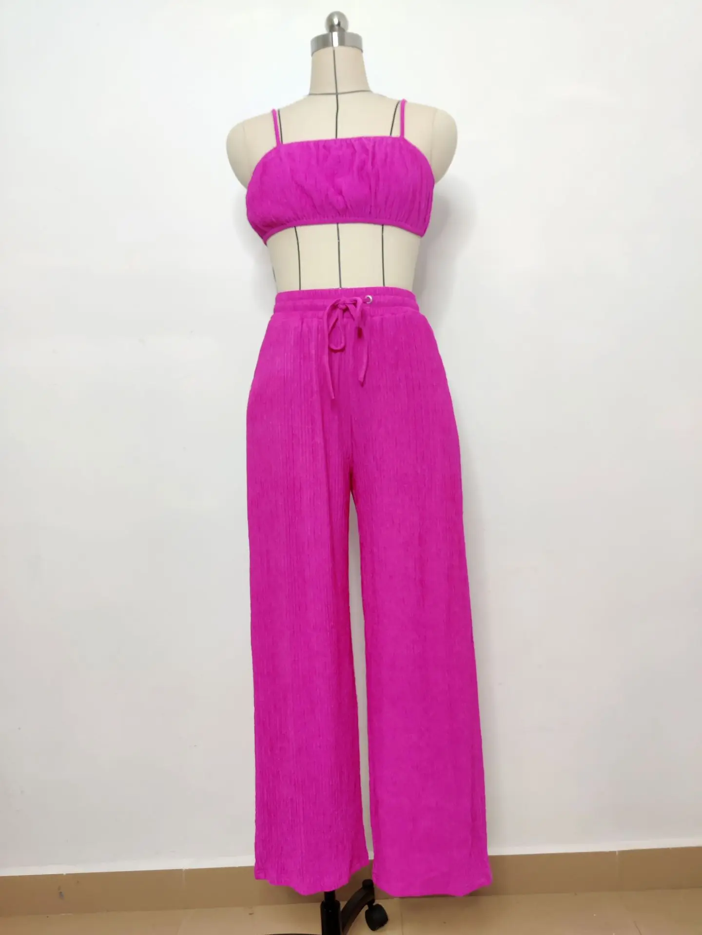 Summer Elegant Women Outfit Solid Sexy Pleated Halter Tops And Flared Trousers Plus Size 2 Piece Pants Set Women