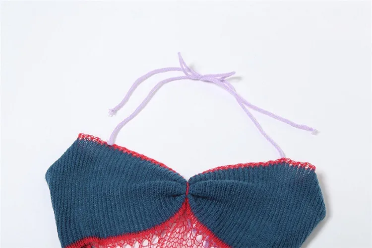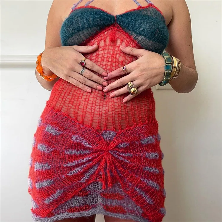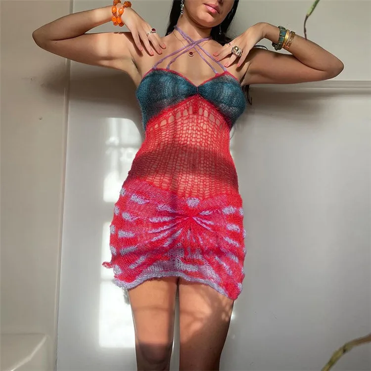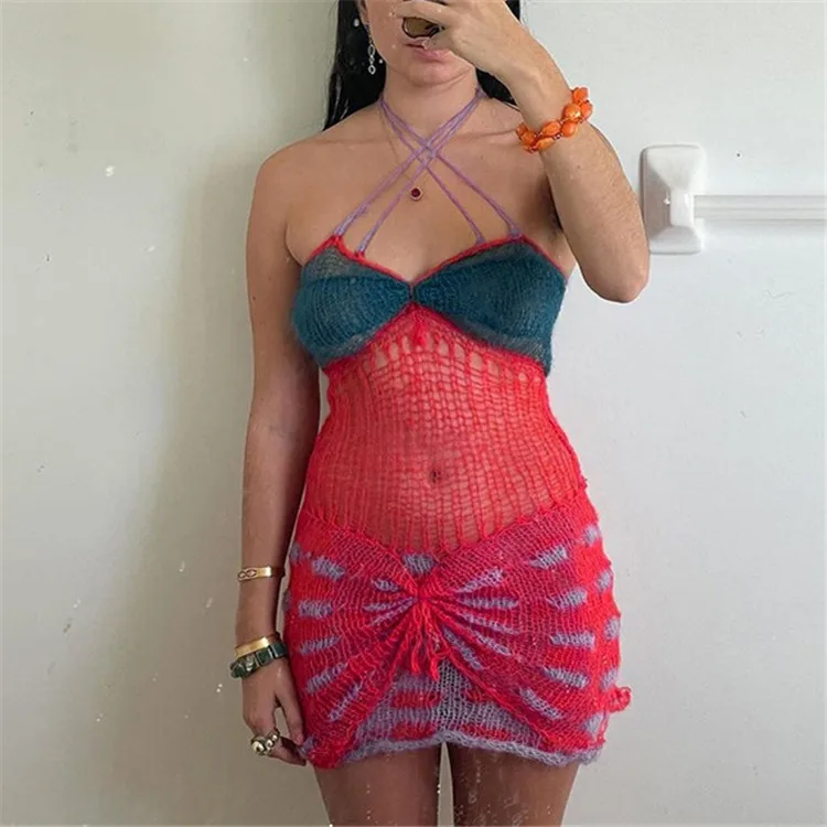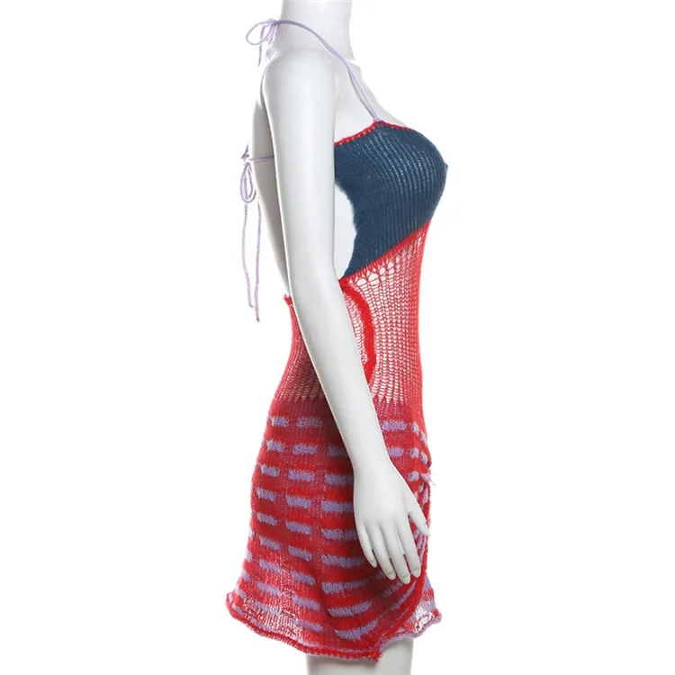 Summer Hollow Out Panelled Kint Short Dress Beach Clothes Women 2024 Sexy Backless Halter Booty Dress