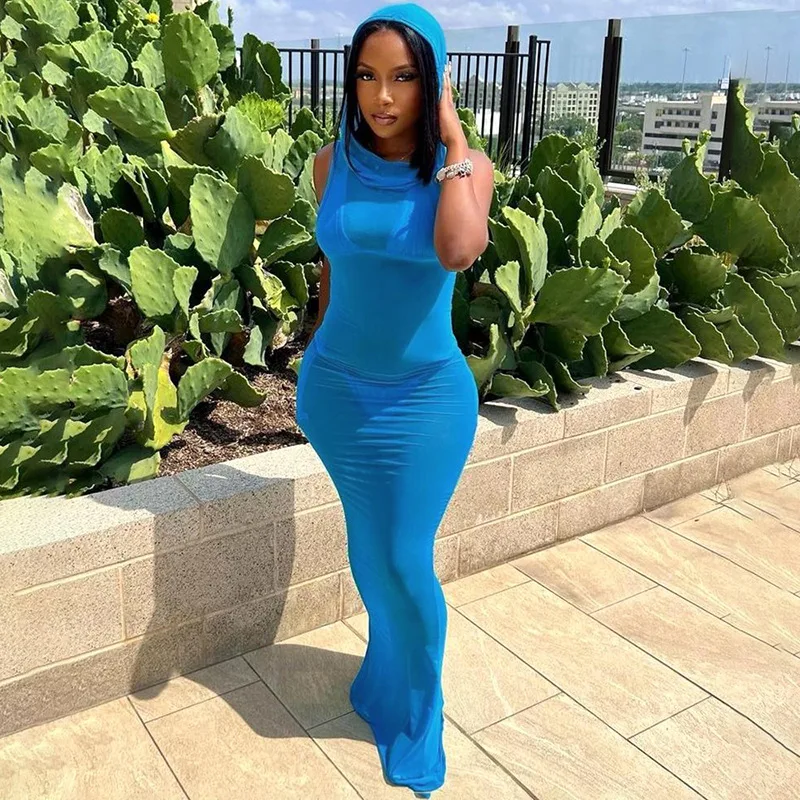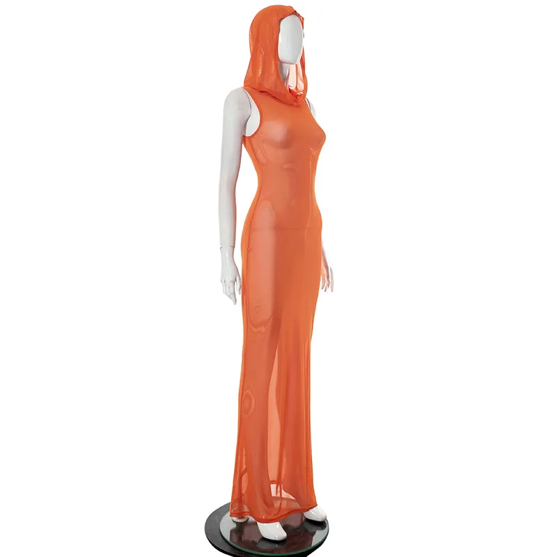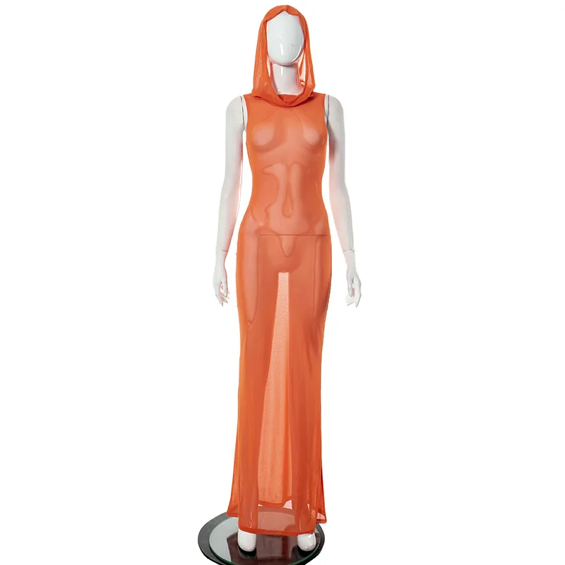 Summer Maxi See Through Woman Hoodie Dress Mesh club Sexy Dresses Women Night Bodycon Sleeveless Long Dress