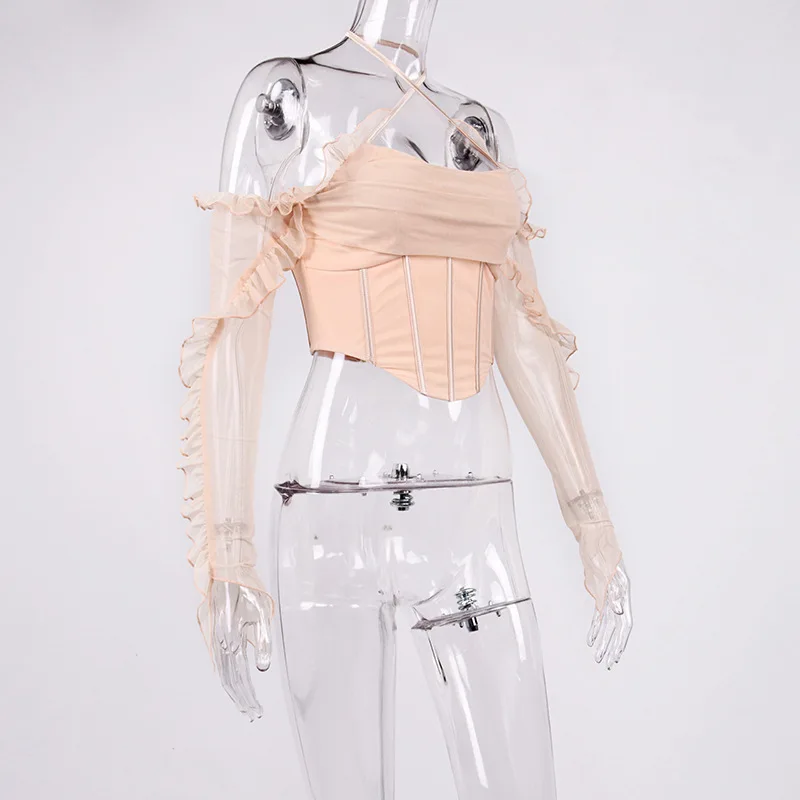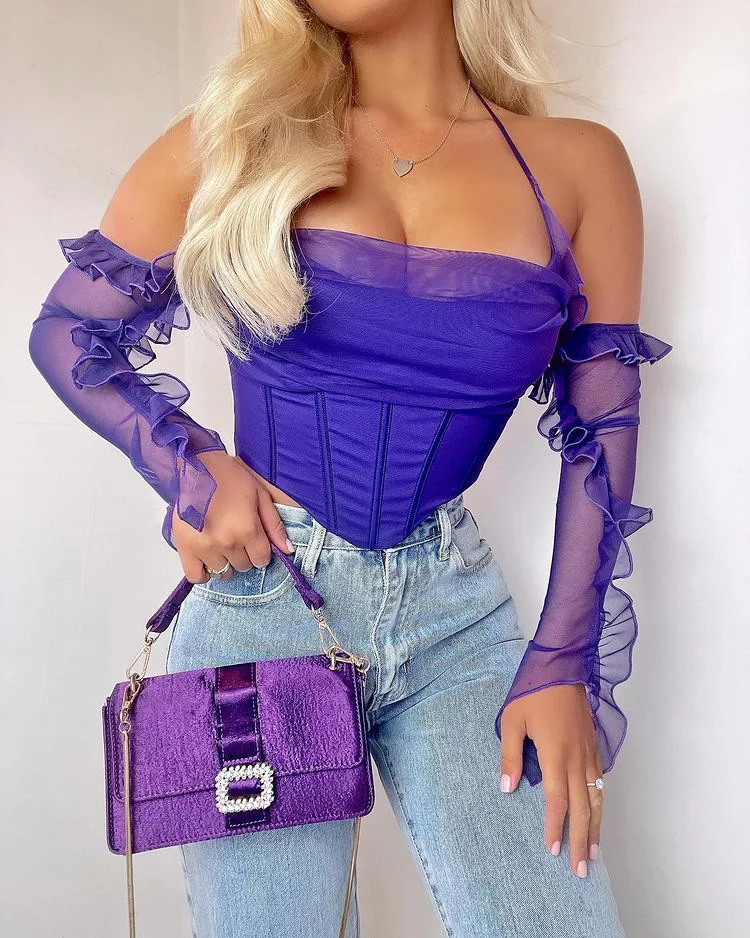 Summer Mesh Patchwork Halter Sexy Long Sleeve T Shirt Women Off Shoulder Backless Tops Club Party Wear Clothing