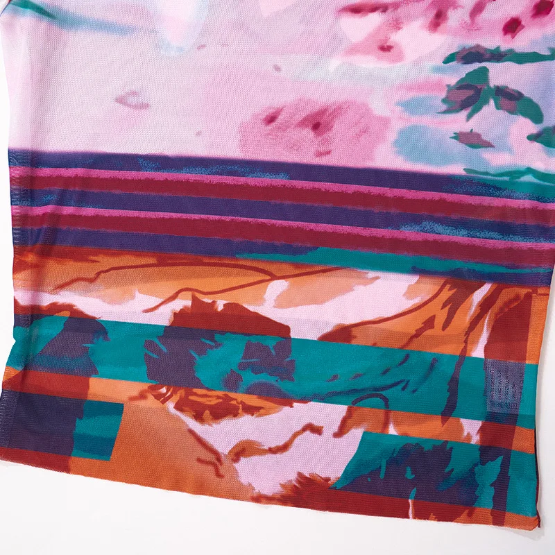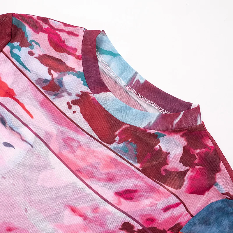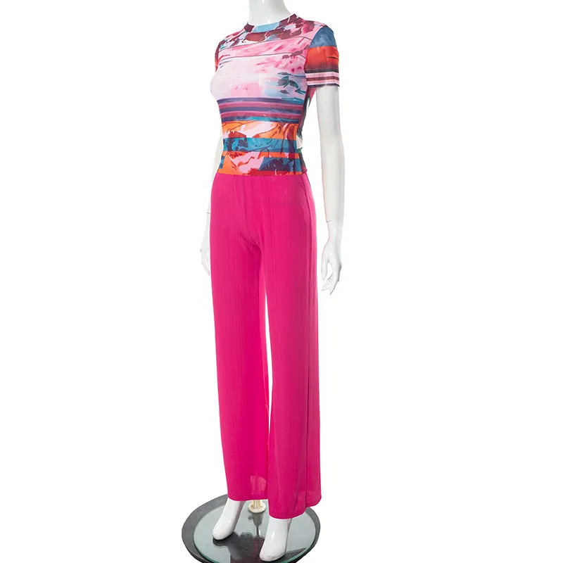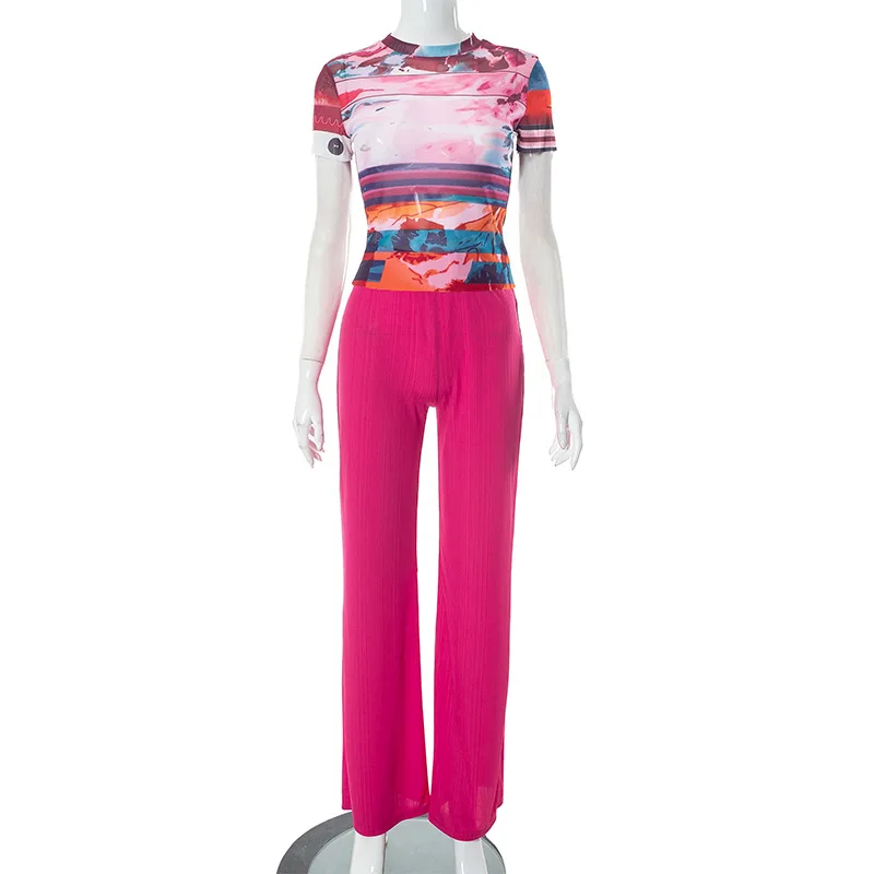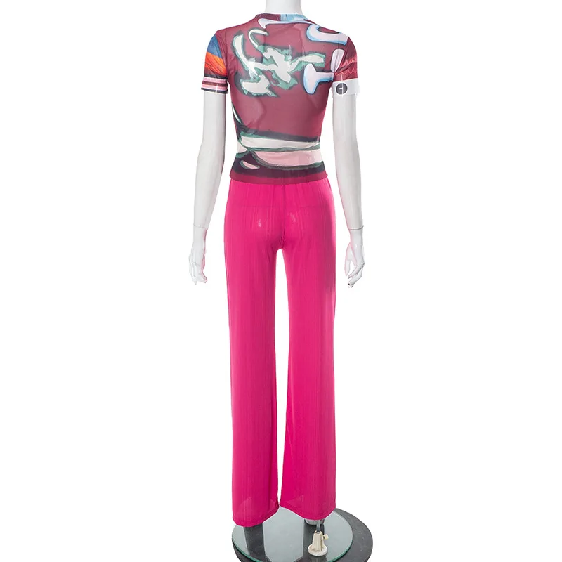 Summer Mesh Printed O-neck Short Sleeve T-shirt Solid Pant 2 Piece Set Bodycon Fashion Casual Clothing For Ladies