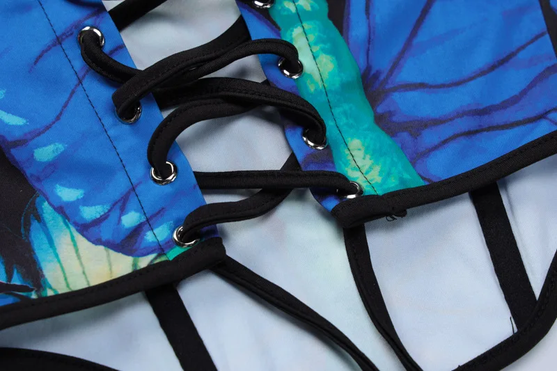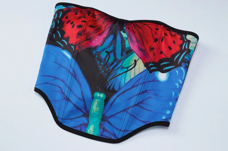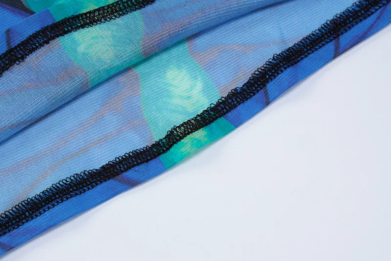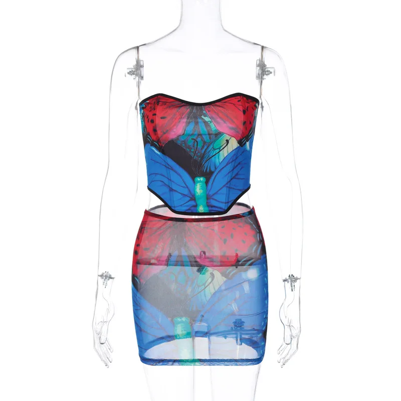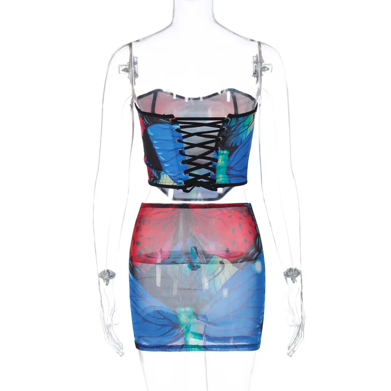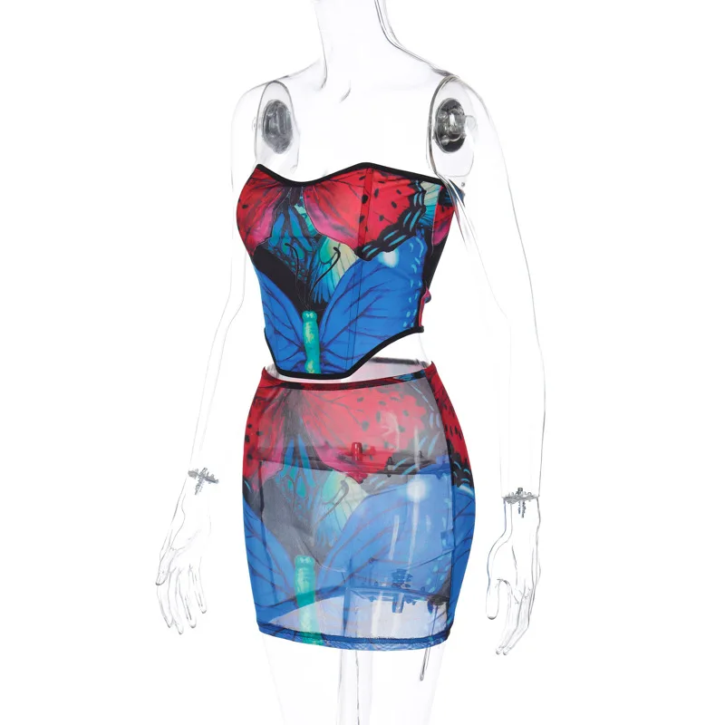 Summer New Elegant Trendy Women Two Piece Skirt Set Printed Lace-up Strapless Mesh See Through Skirt Suit Lady