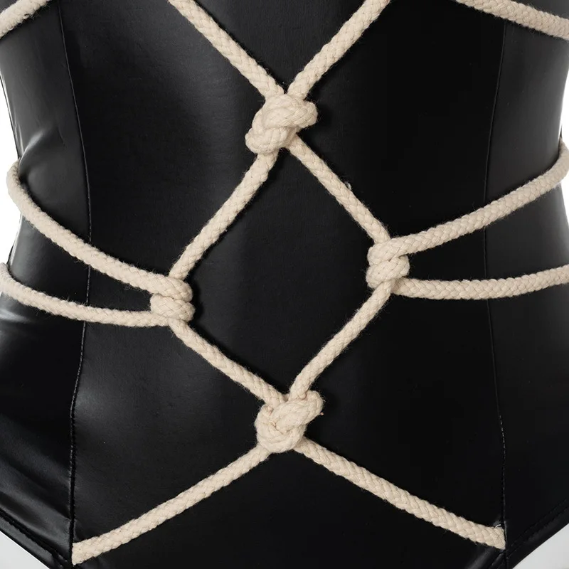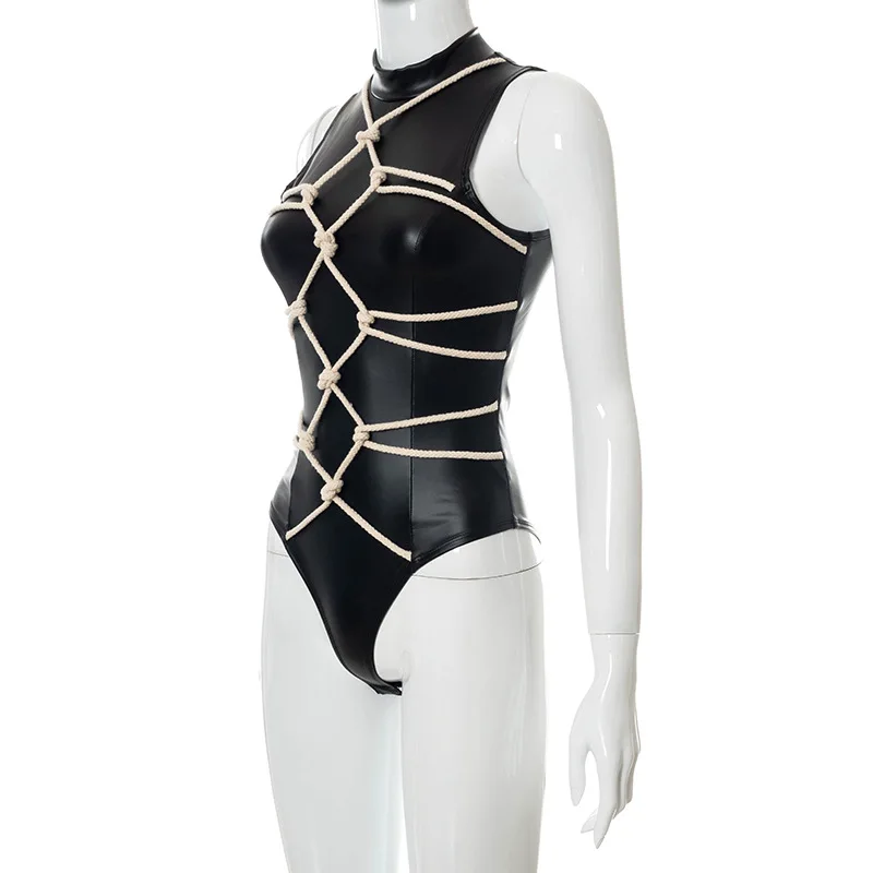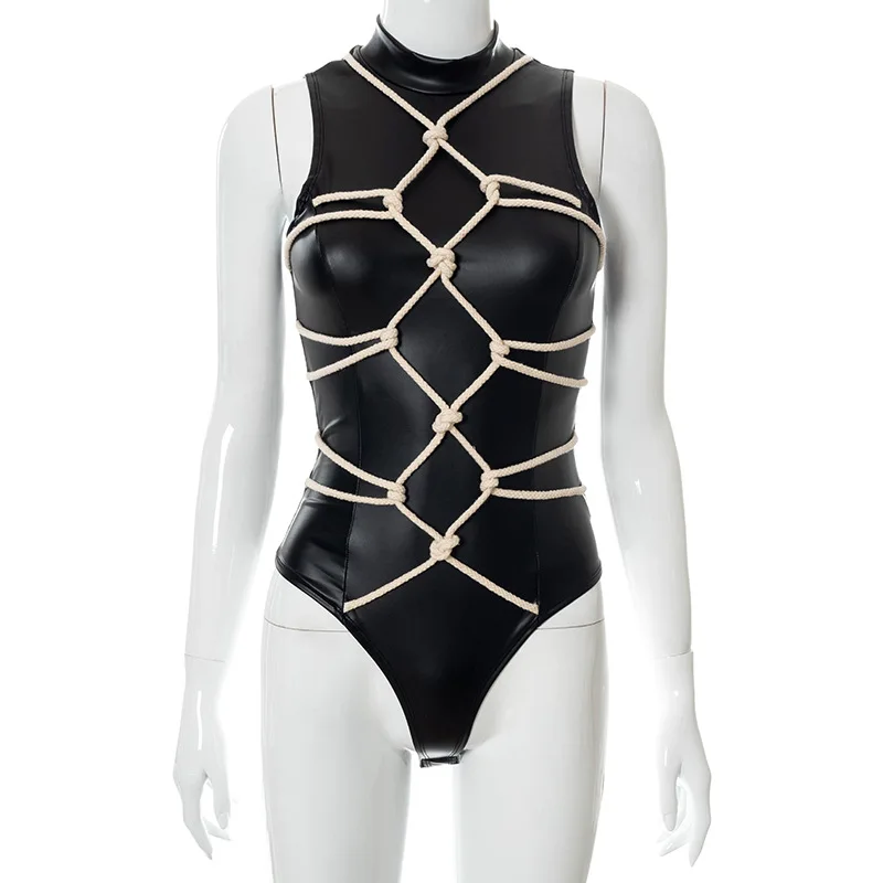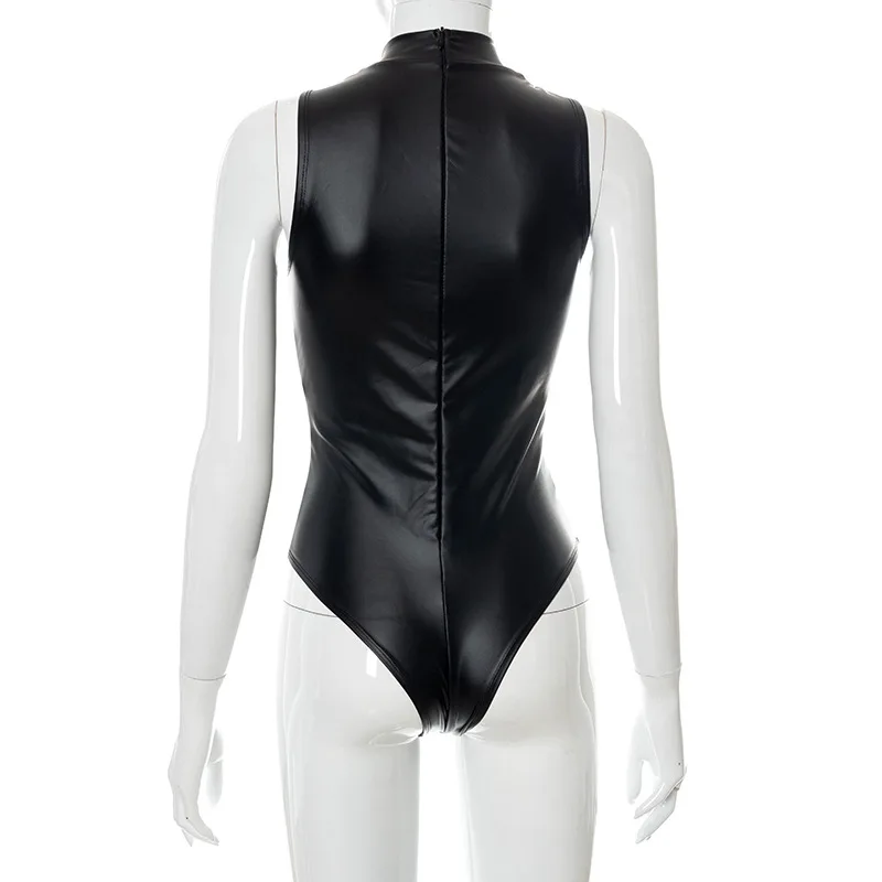 Summer New Fashion Women Bodycon Sleeveless Black PU Faux Leather Sexy Bodysuits For Women